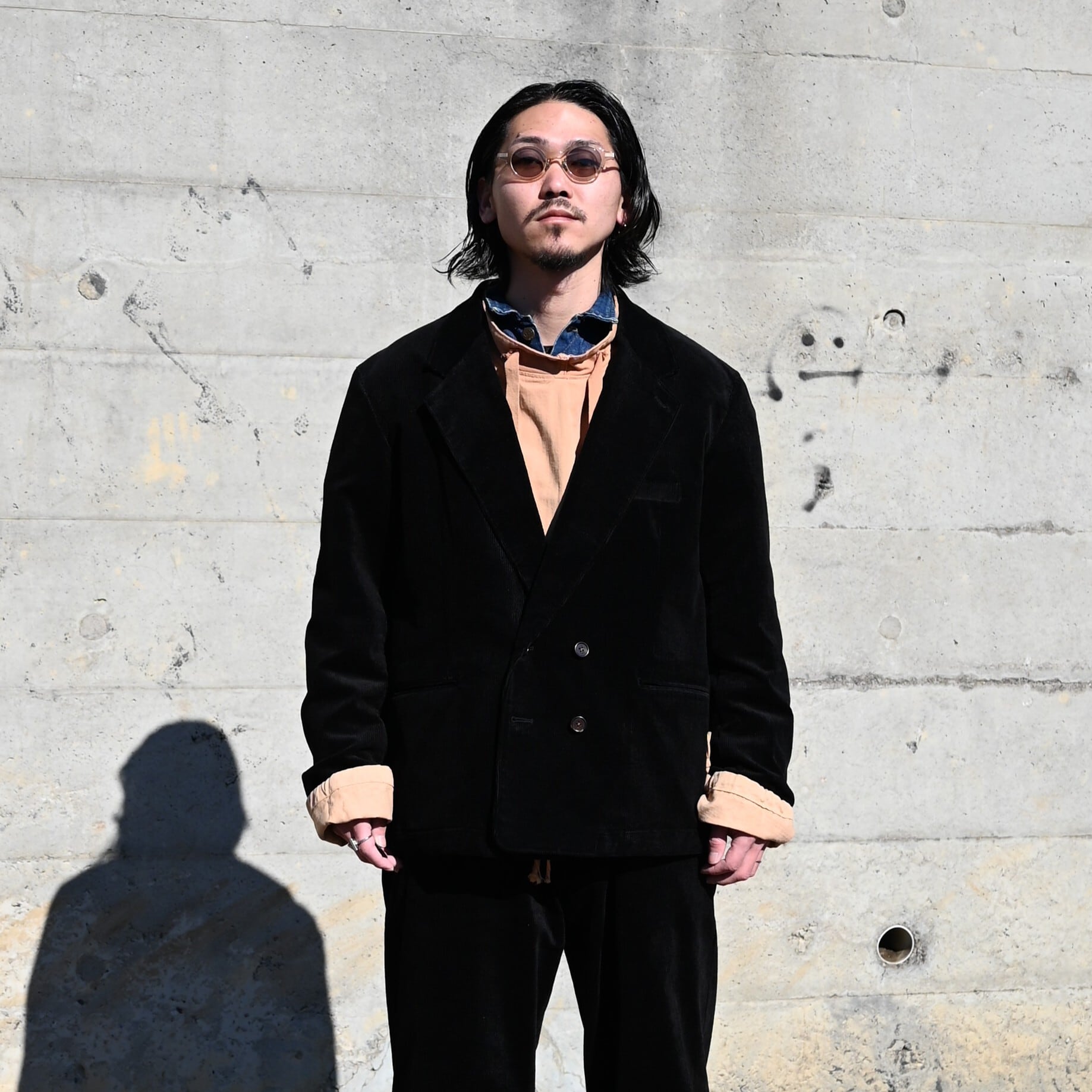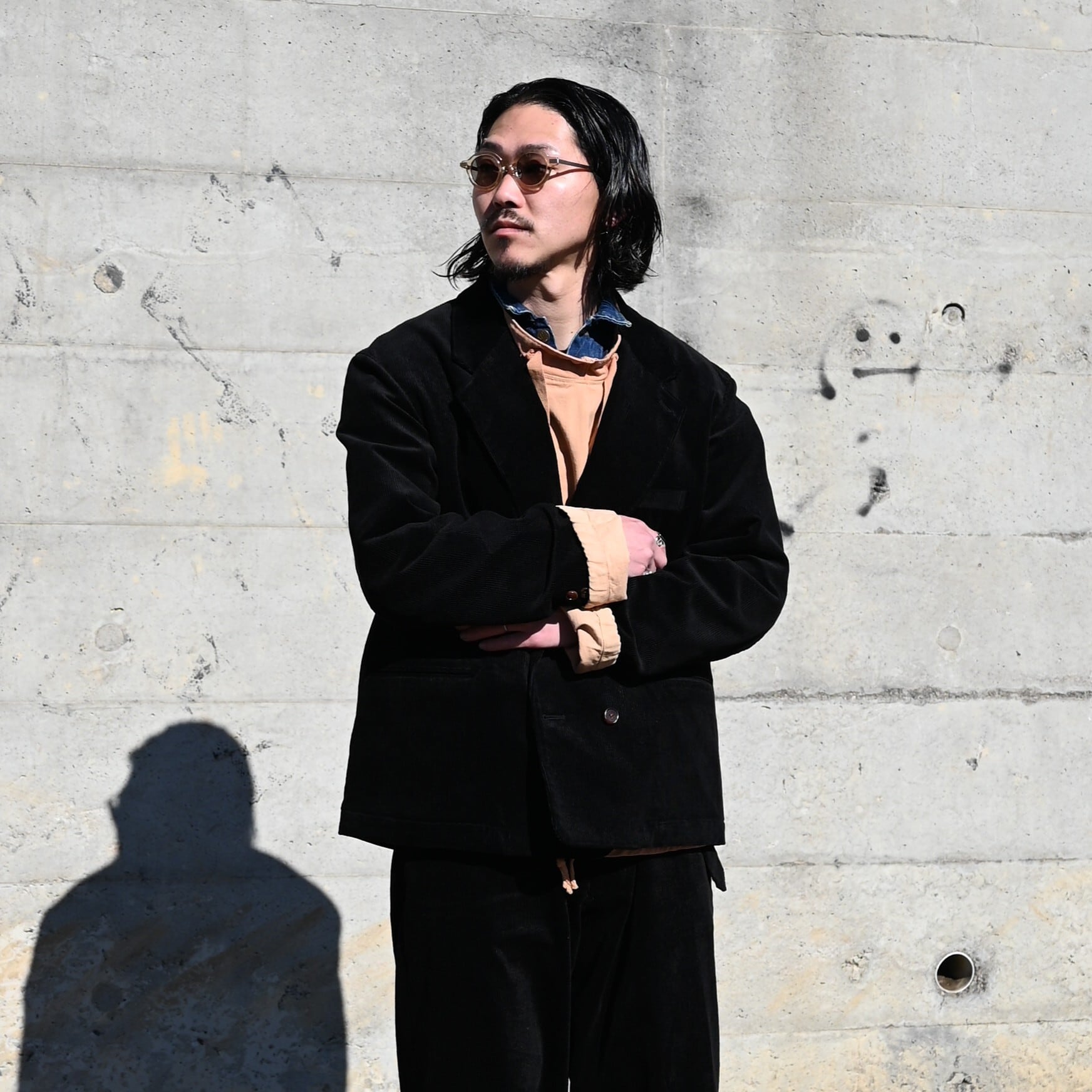 INTERIM(インテリム)の国内有数の細⼱織物に精通した機屋で製作したリネンコットンコーデュロイを使用したセットアップをメイン着用。今購入しても春先まで着用可能なコットンリネン特有の柔らかい生地感が魅力です。