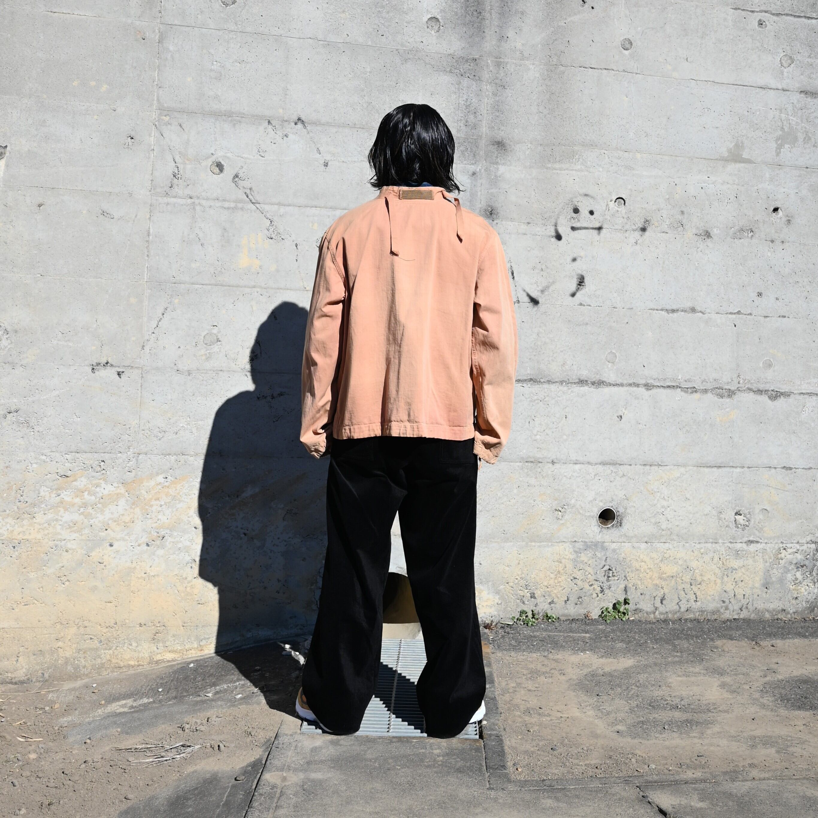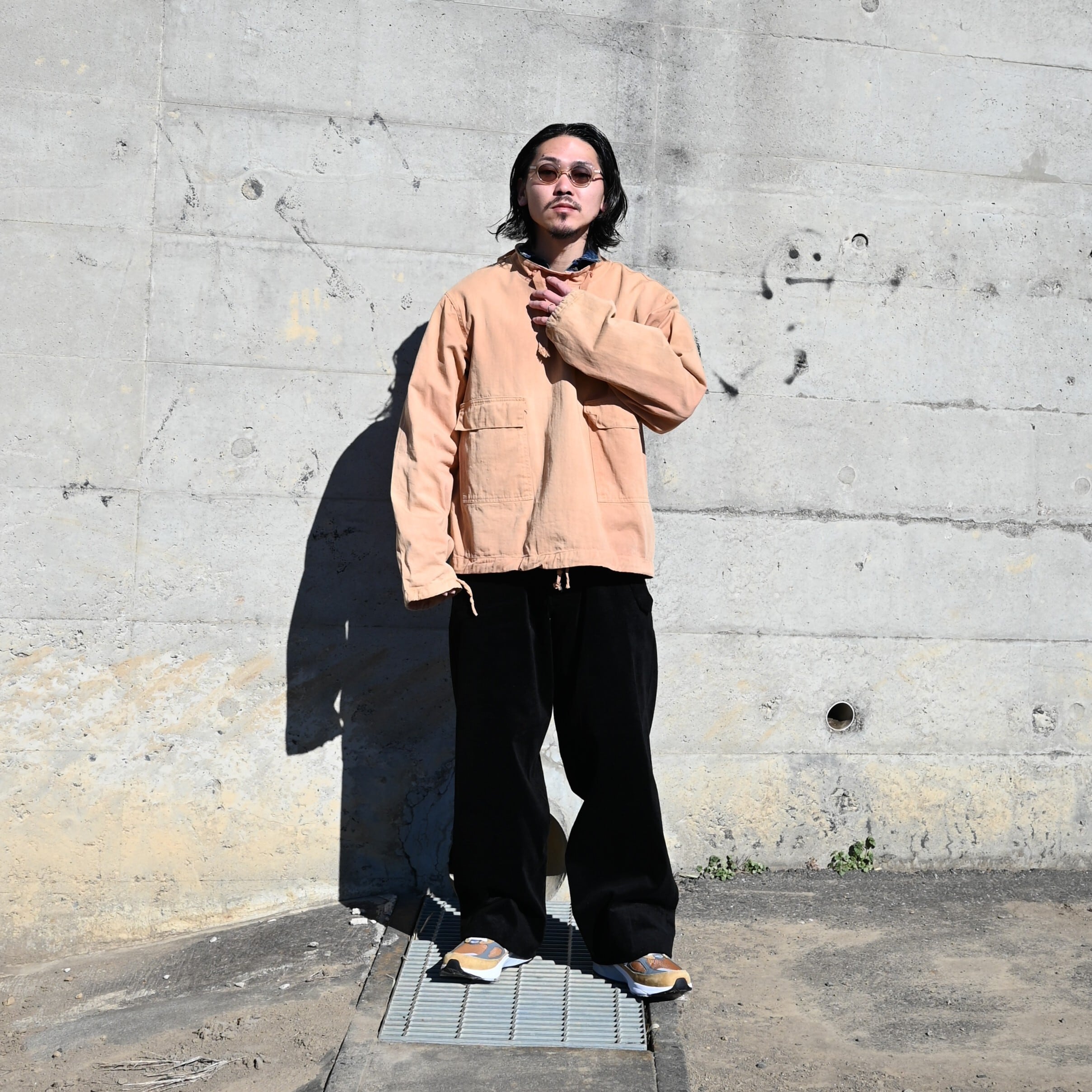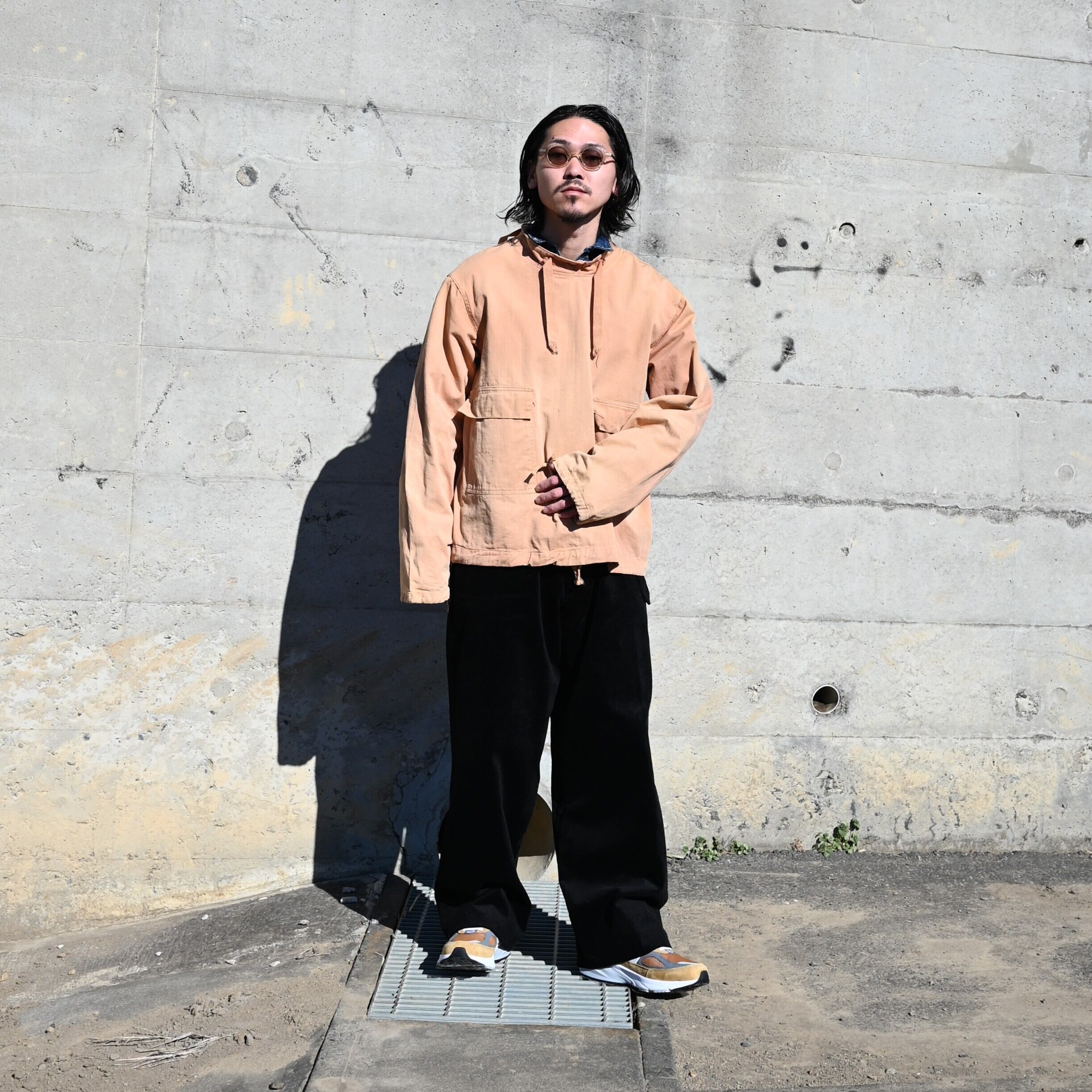 For this outfit, a vintage item is layered underneath. The key styling point is matching the color tones of the salvage parka worn as the inner layer with the New Balance sneakers