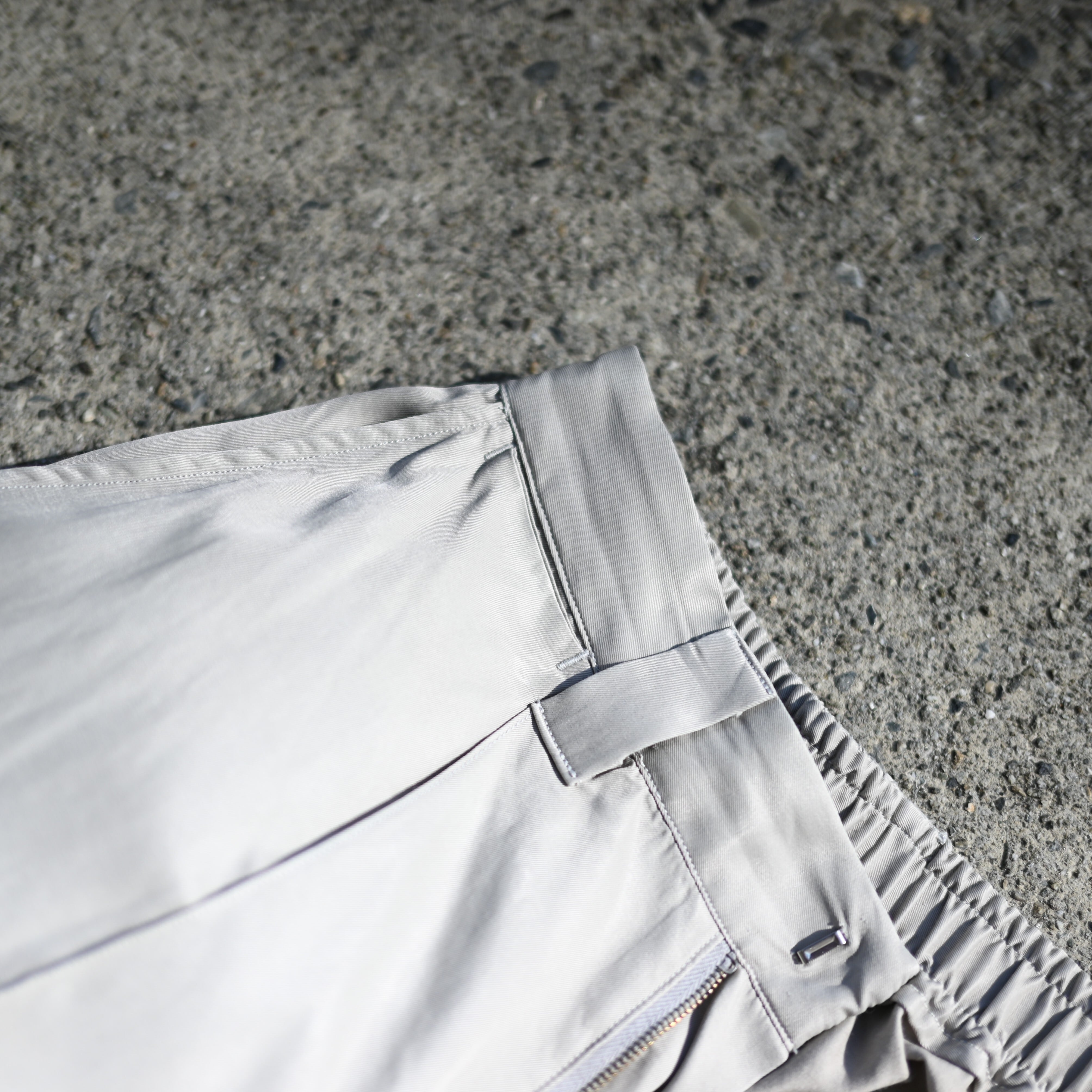 ・後ろ身頃がギャザーウエスト、前身頃はプリーツとクリースラインが配してあるのでカジュアルになりすぎずない