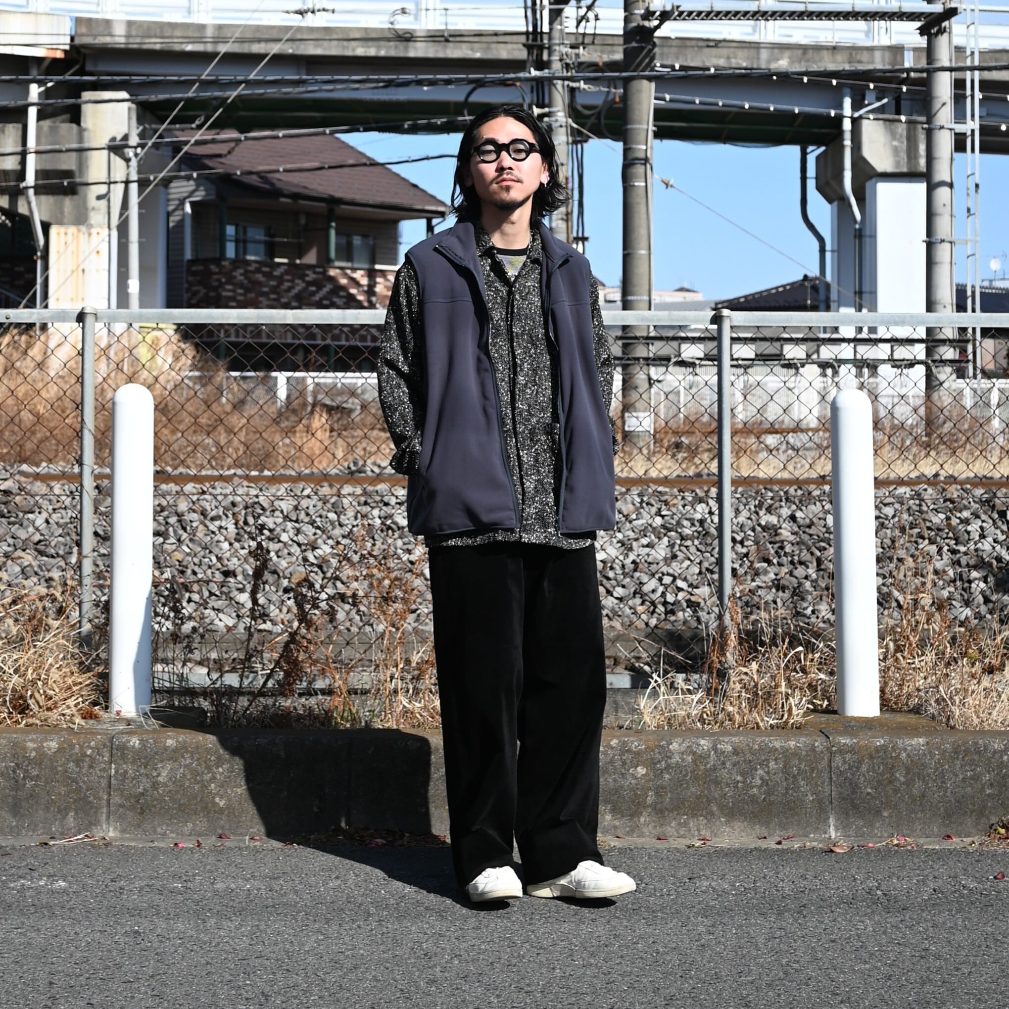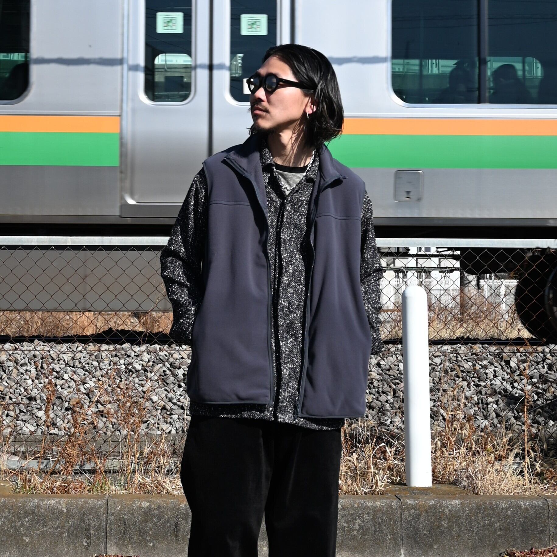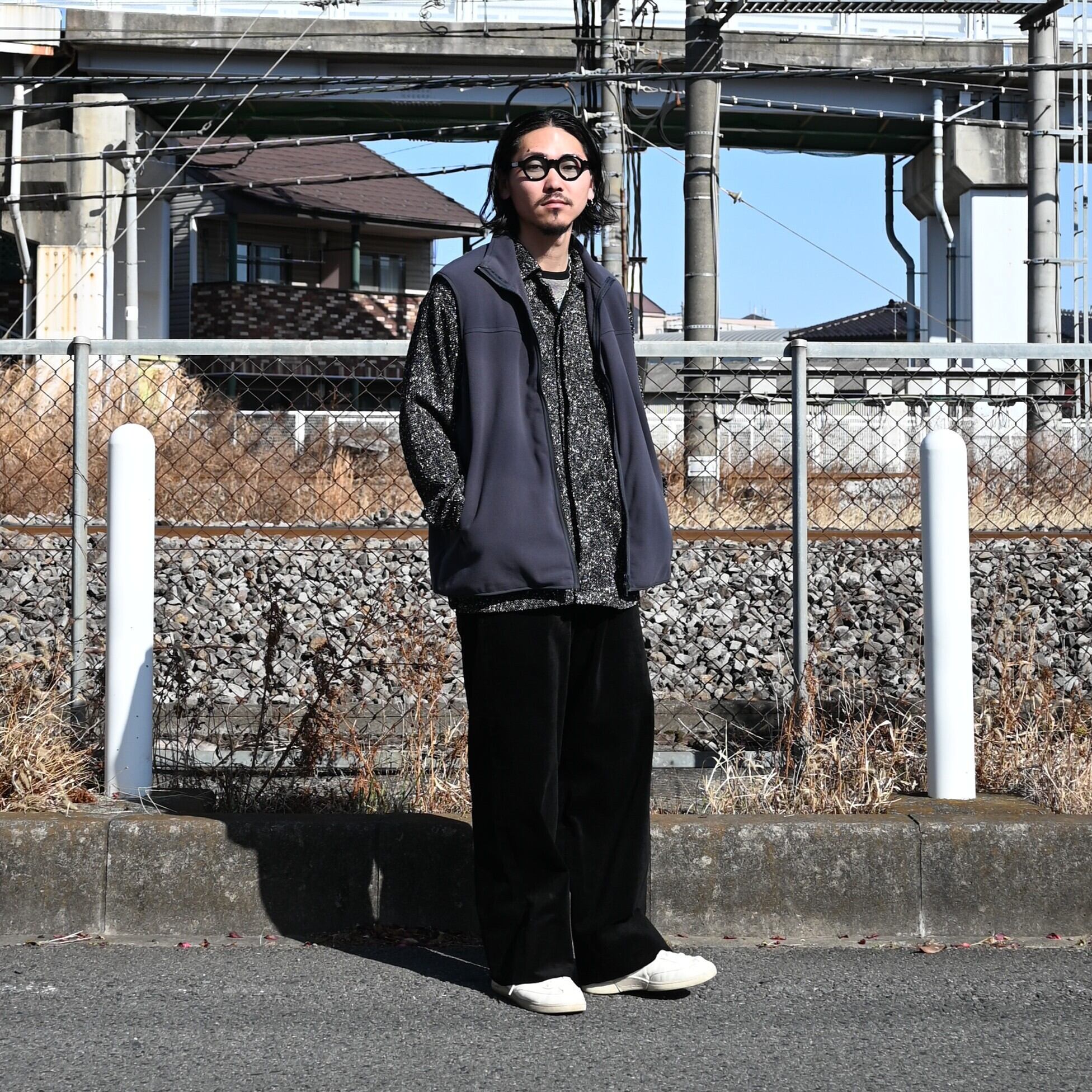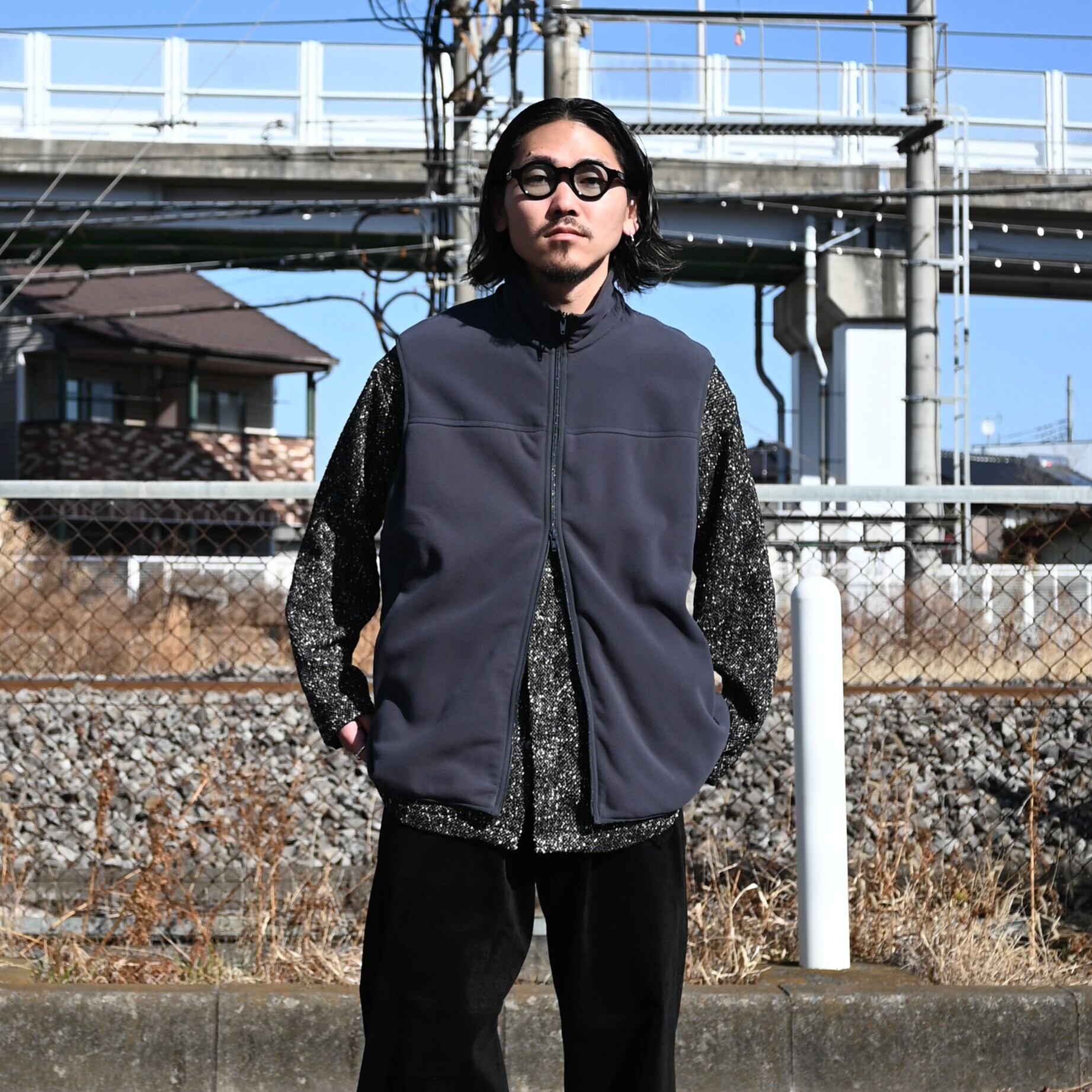 THE DAY(ザデイ)WIND ZONE FLEECE VESTをメインにコーディネート。インナーにINTERIM (インテリム)のTEXTURED DONEGAL BOUCLÉ DEADSTOCK HYPER BIG FLY FRONT SHIIRTS JACKETを合わせました。パンツも同じくインテリムの9W LINEN COTTON CORDUROY BELTED MIL BAGGYを履いております。グレーのベストに同色系のシャツジャケットを合わせることで、全体的に統一感あるコーディネートにいたしました。