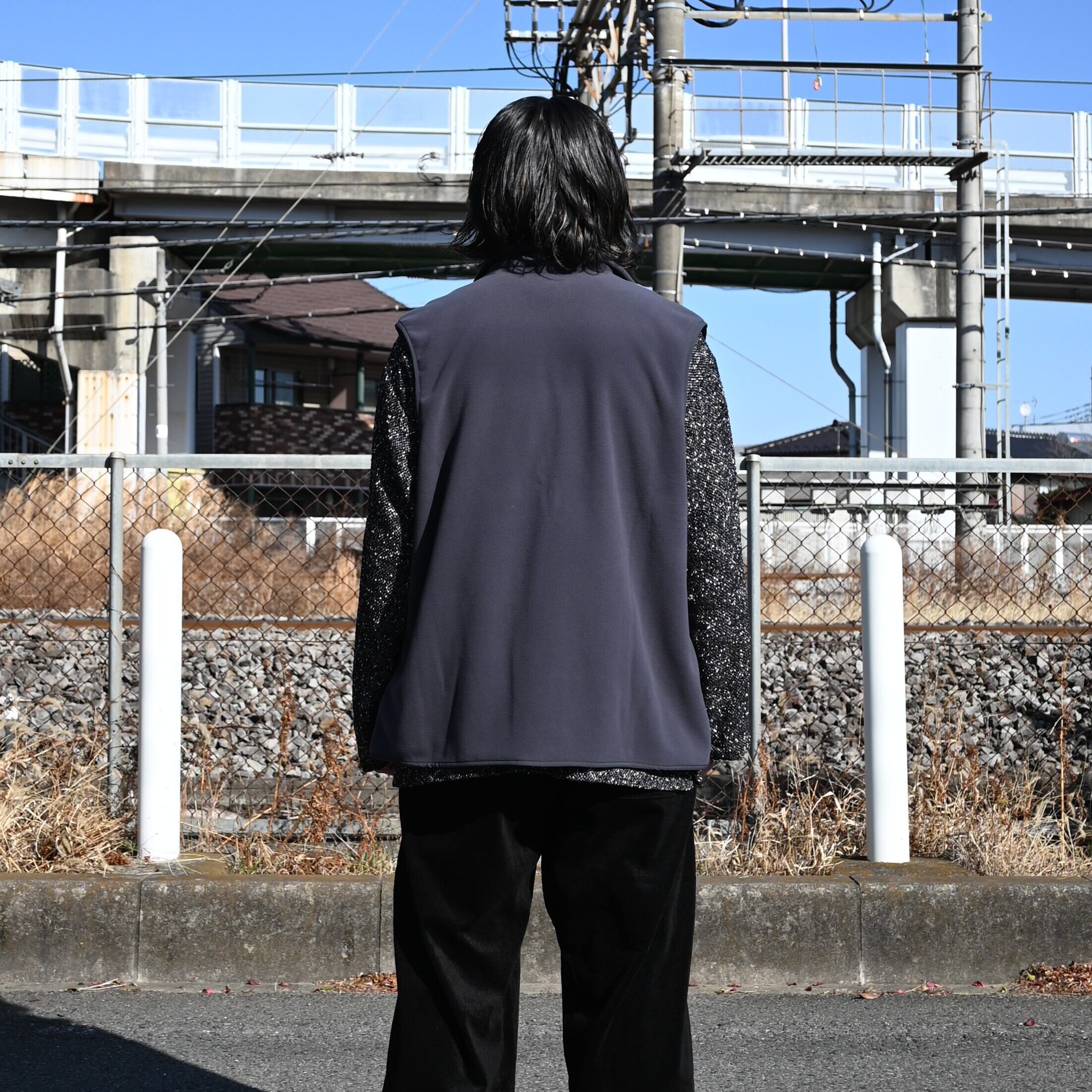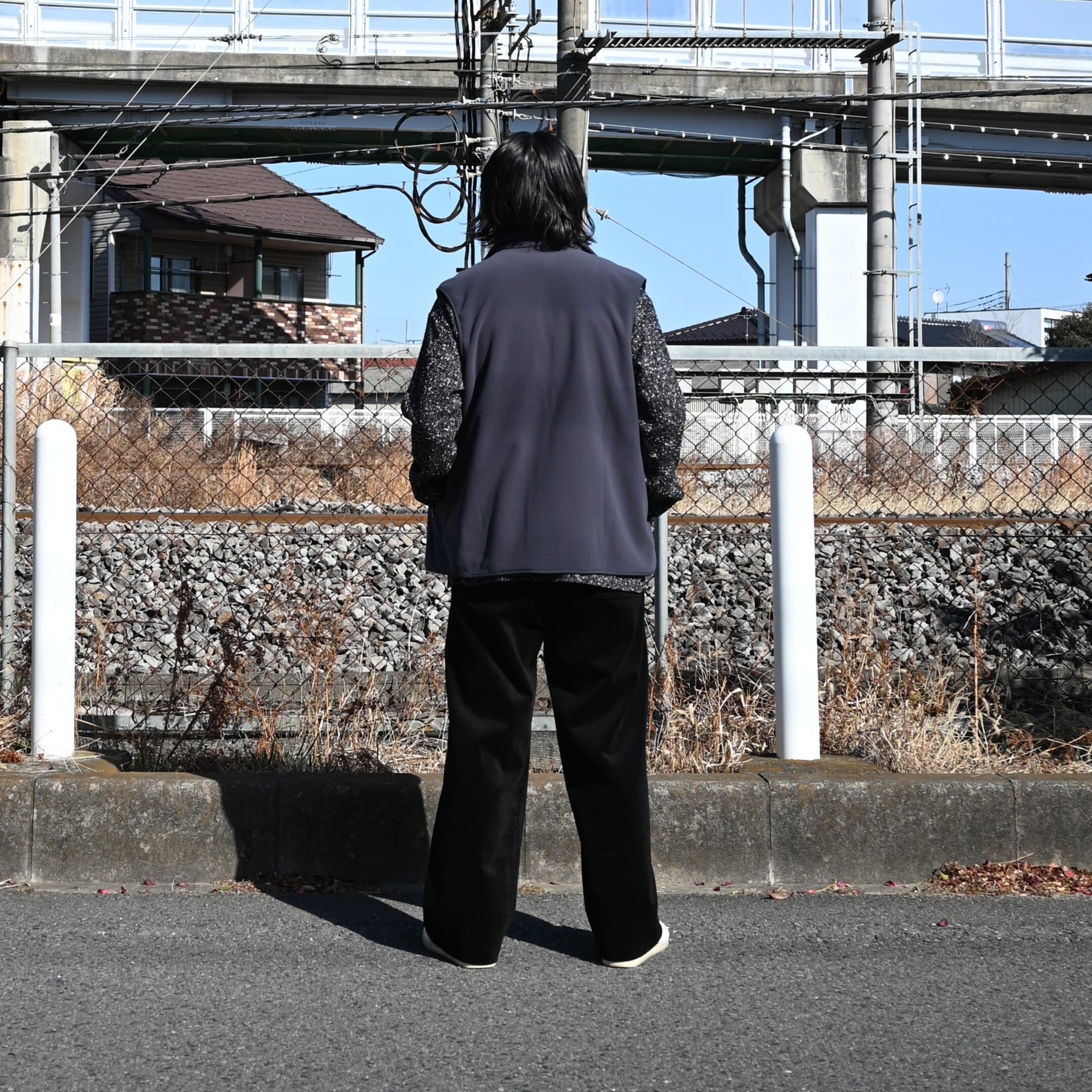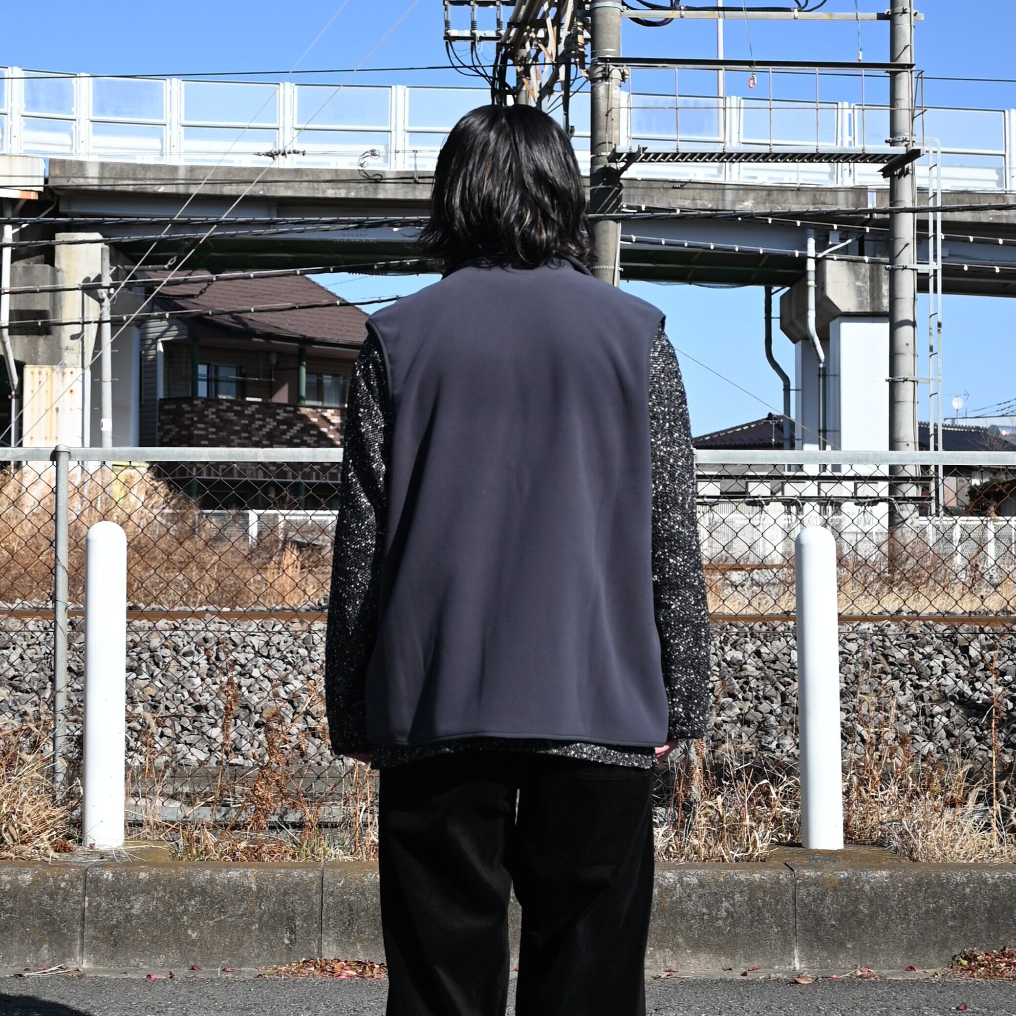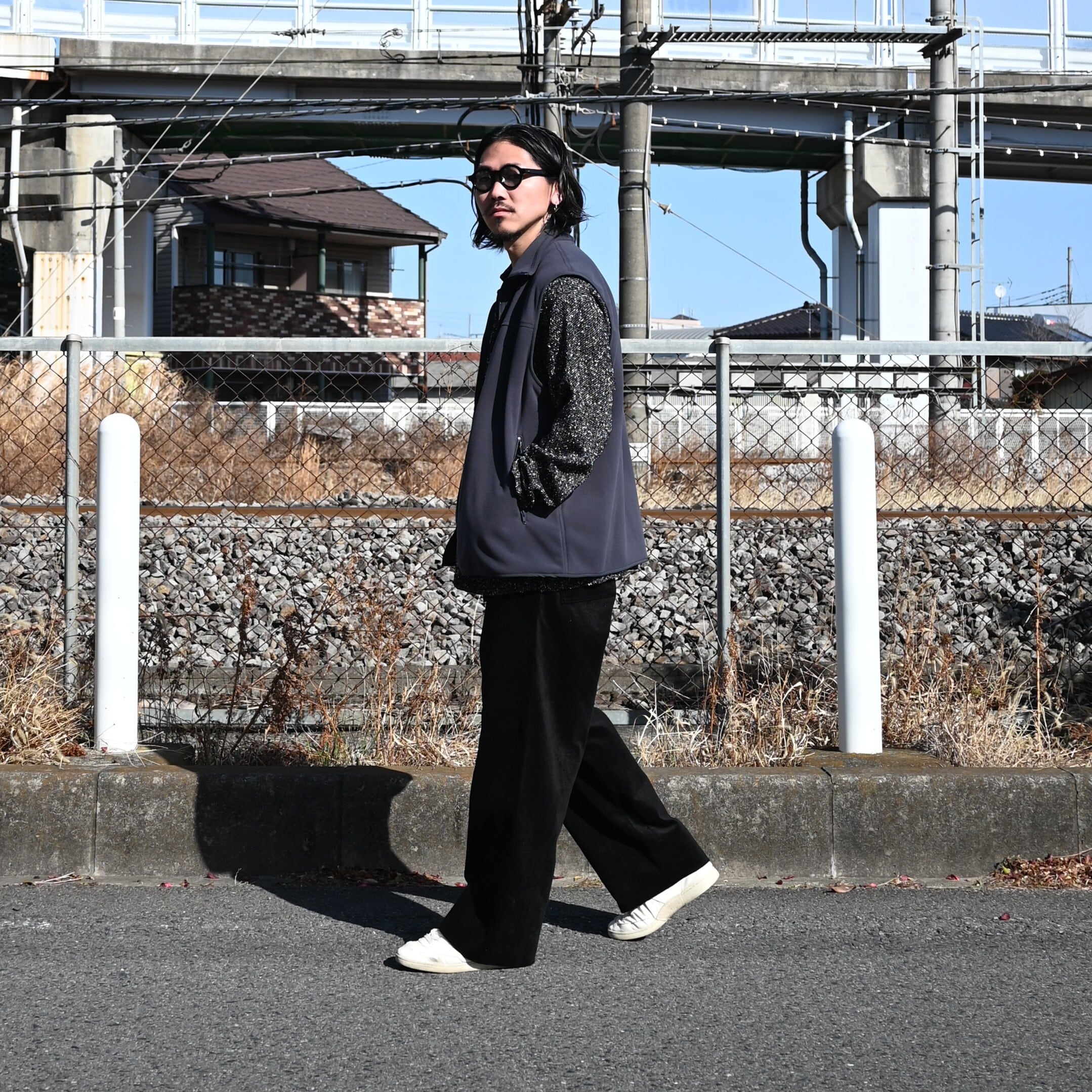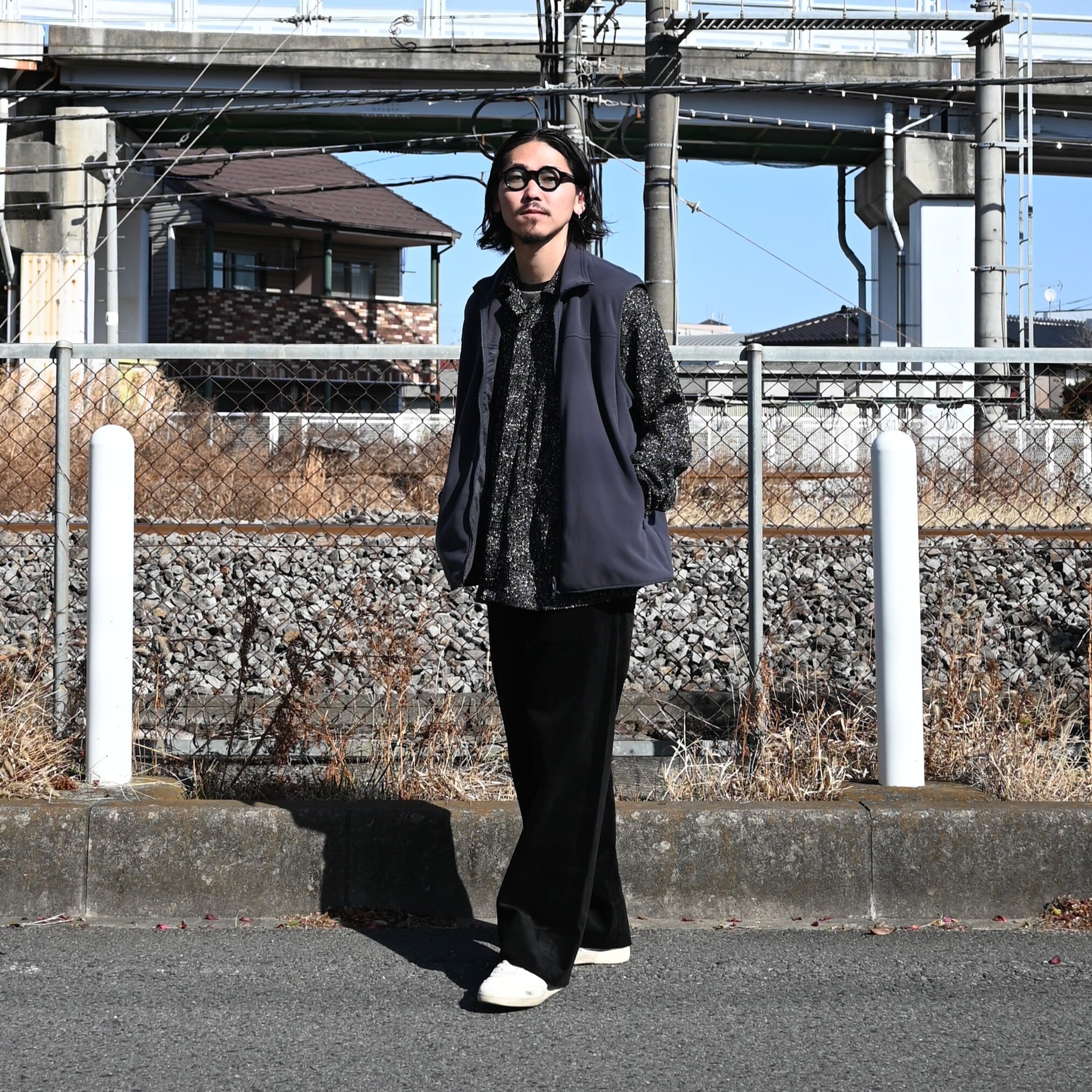 THE DAY(ザデイ)WIND ZONE FLEECE VESTをメインにコーディネート。インナーにINTERIM (インテリム)のTEXTURED DONEGAL BOUCLÉ DEADSTOCK HYPER BIG FLY FRONT SHIIRTS JACKETを合わせました。パンツも同じくインテリムの9W LINEN COTTON CORDUROY BELTED MIL BAGGYを履いております。グレーのベストに同色系のシャツジャケットを合わせることで、全体的に統一感あるコーディネートにいたしました。