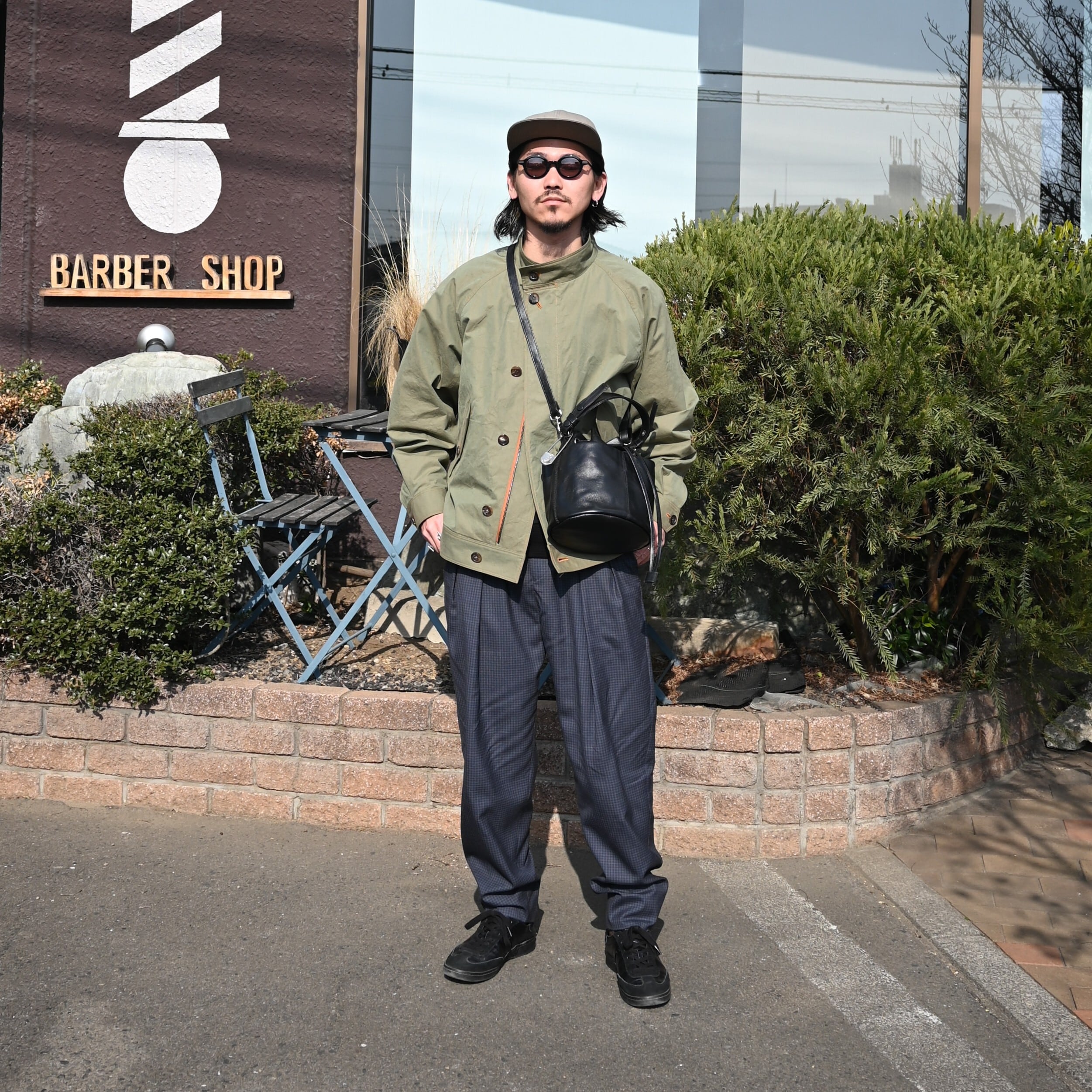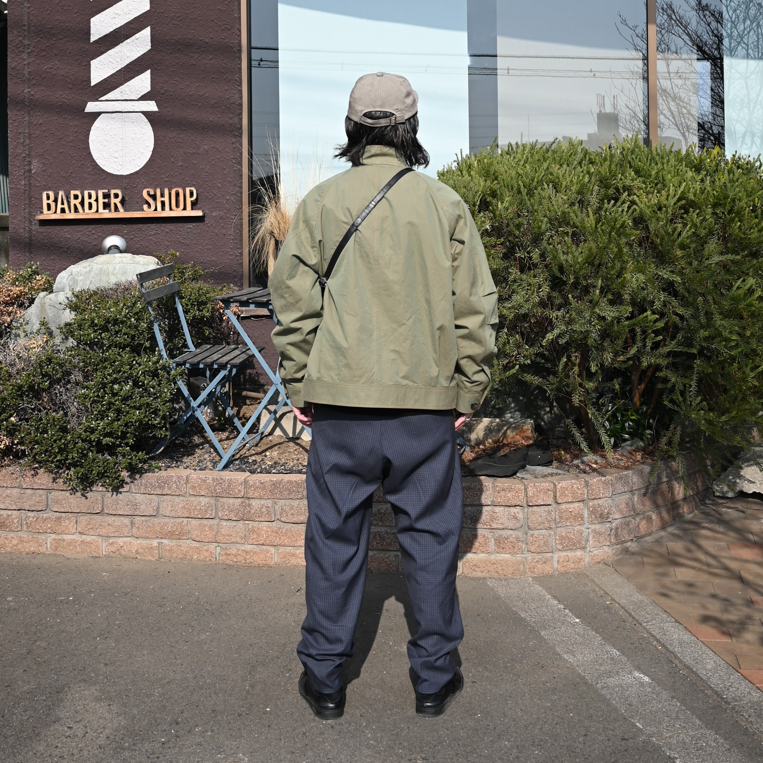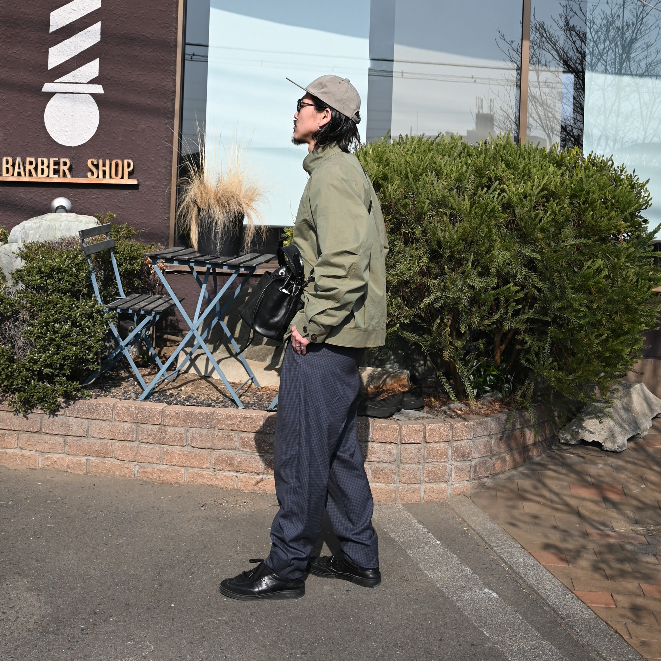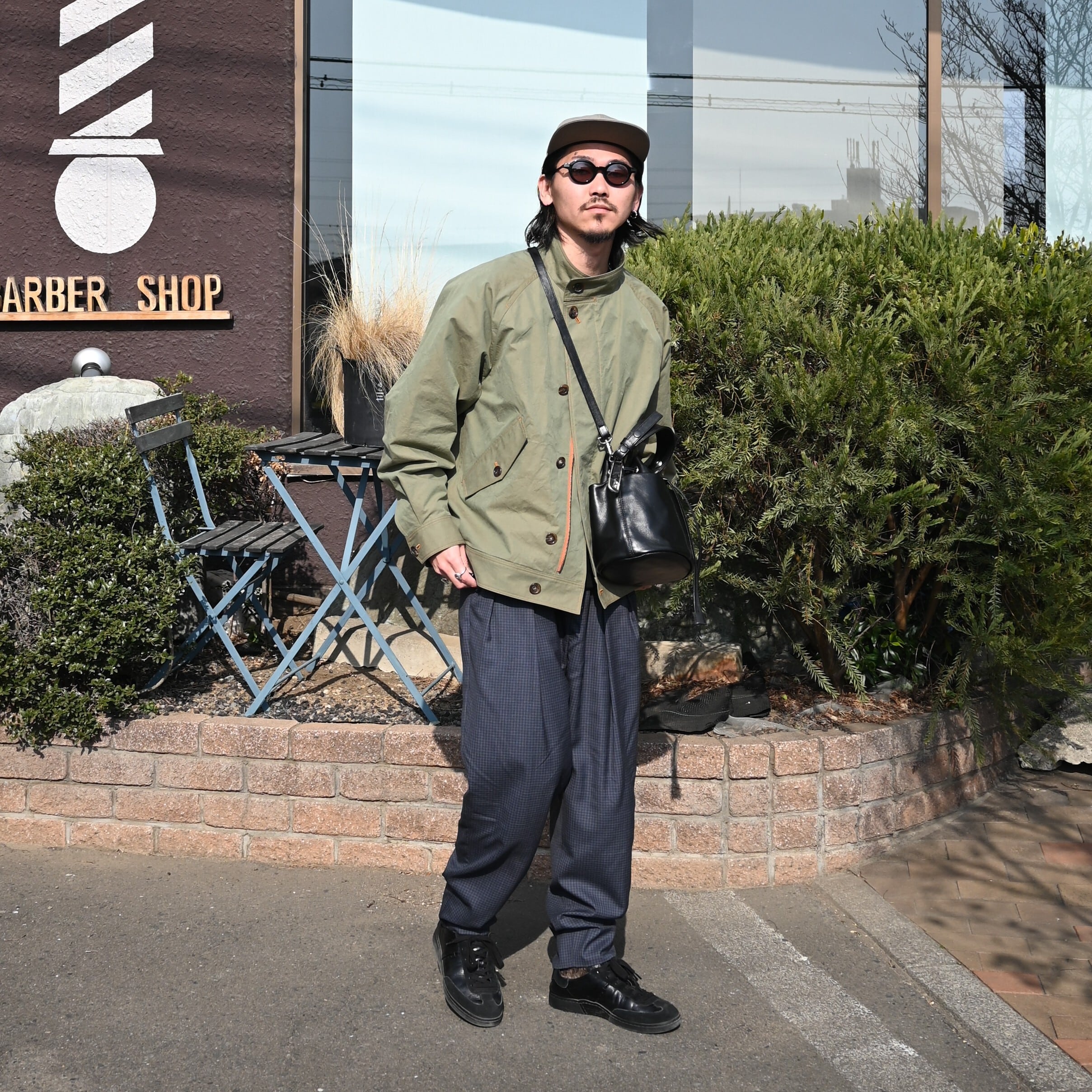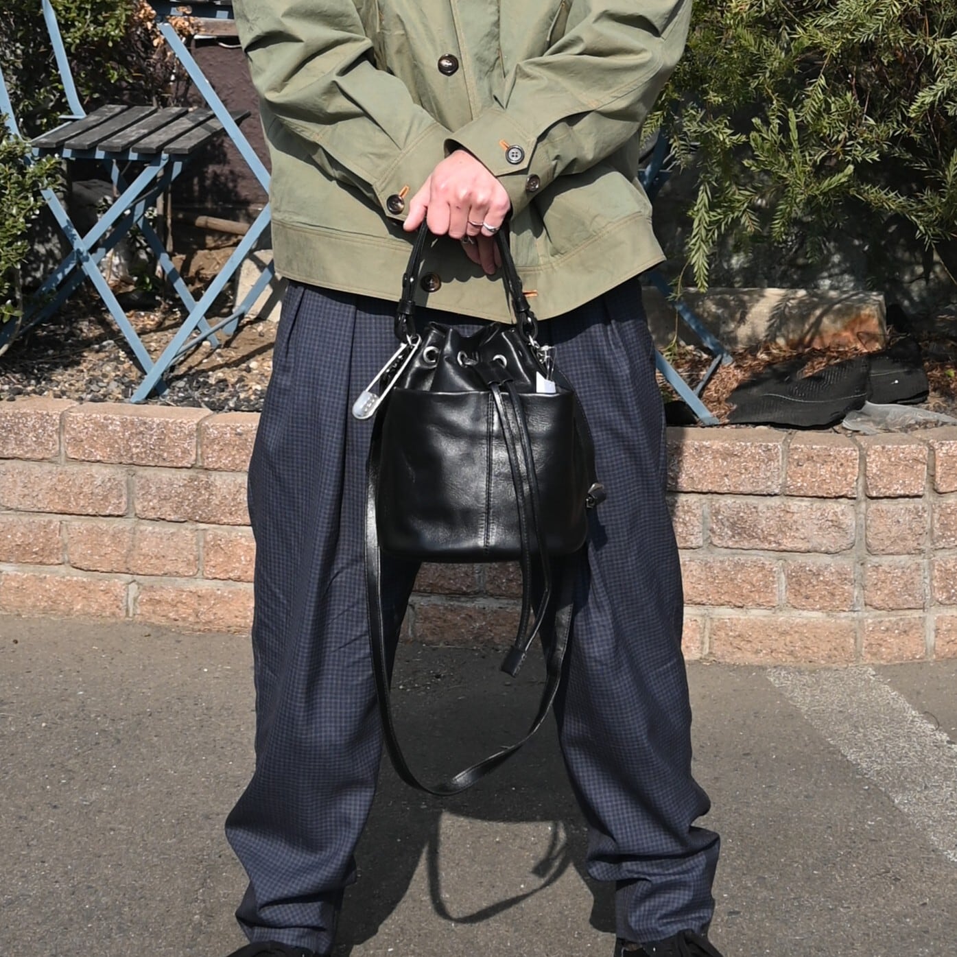 差し色でRACAL(ラカル)のグレージュカラーのフラットバイザーキャップを合わせ、CCU(シーシーユー)の巾着バッグを合わせて上品さをプラス。