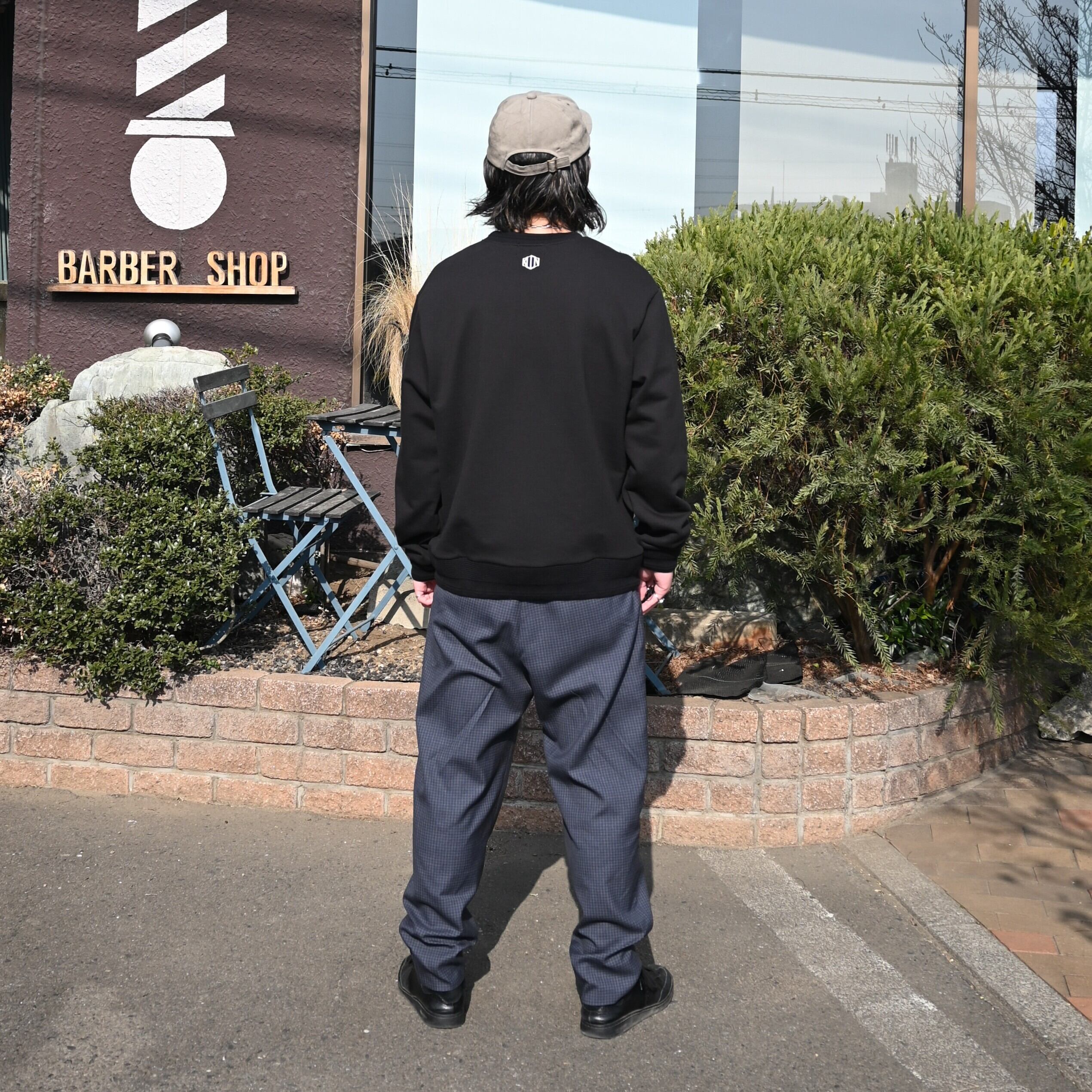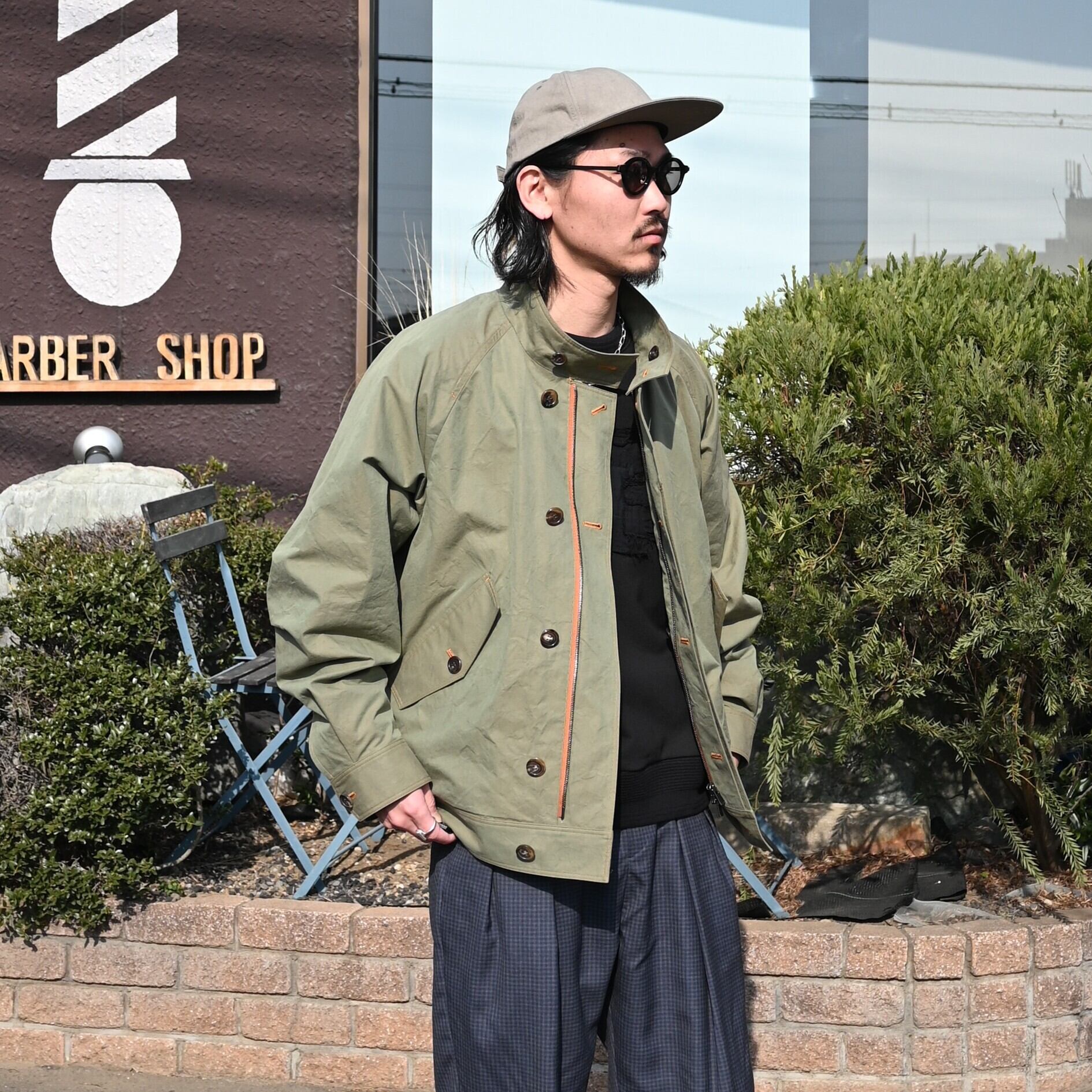 The outfit is centered around YAMUCHI’s ultra high-density shield cotton cloth semi-double zip jacket, paired with a KUON boro sweatshirt as the inner layer.