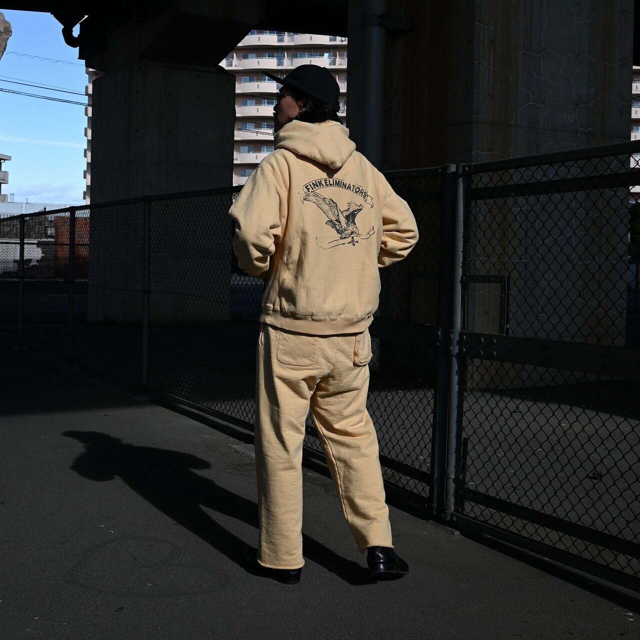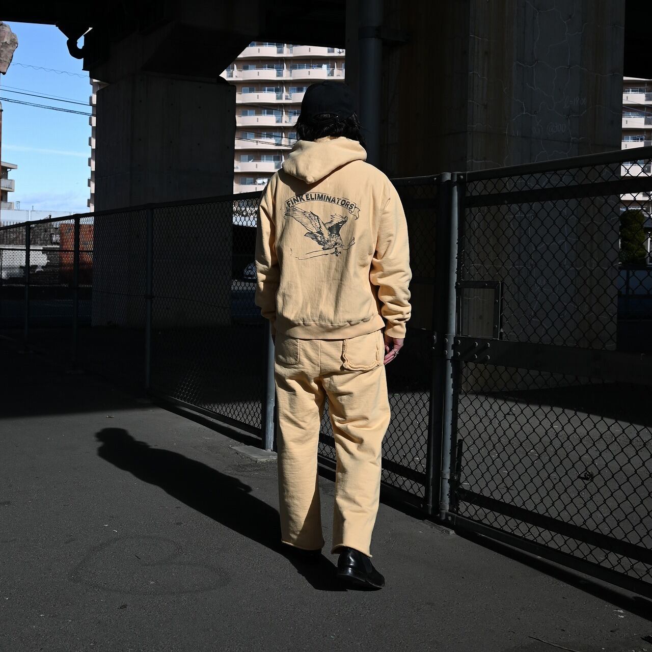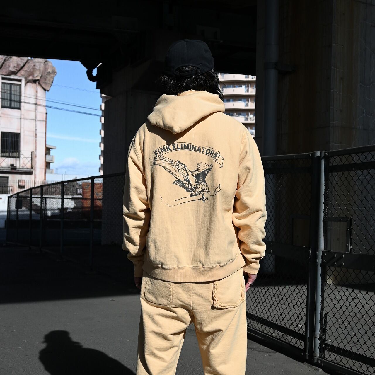 The hoodie features BOWWOW’s signature FINK-ELIMINATORS print, combining an eagle motif—an icon of motorcycle culture—with the message “YOU’RE GONNA LOVE IT.” It is matched with sweatpants finished with a cut-off hem, creating a look that reflects BOWWOW’s distinctive motorwear aesthetic.