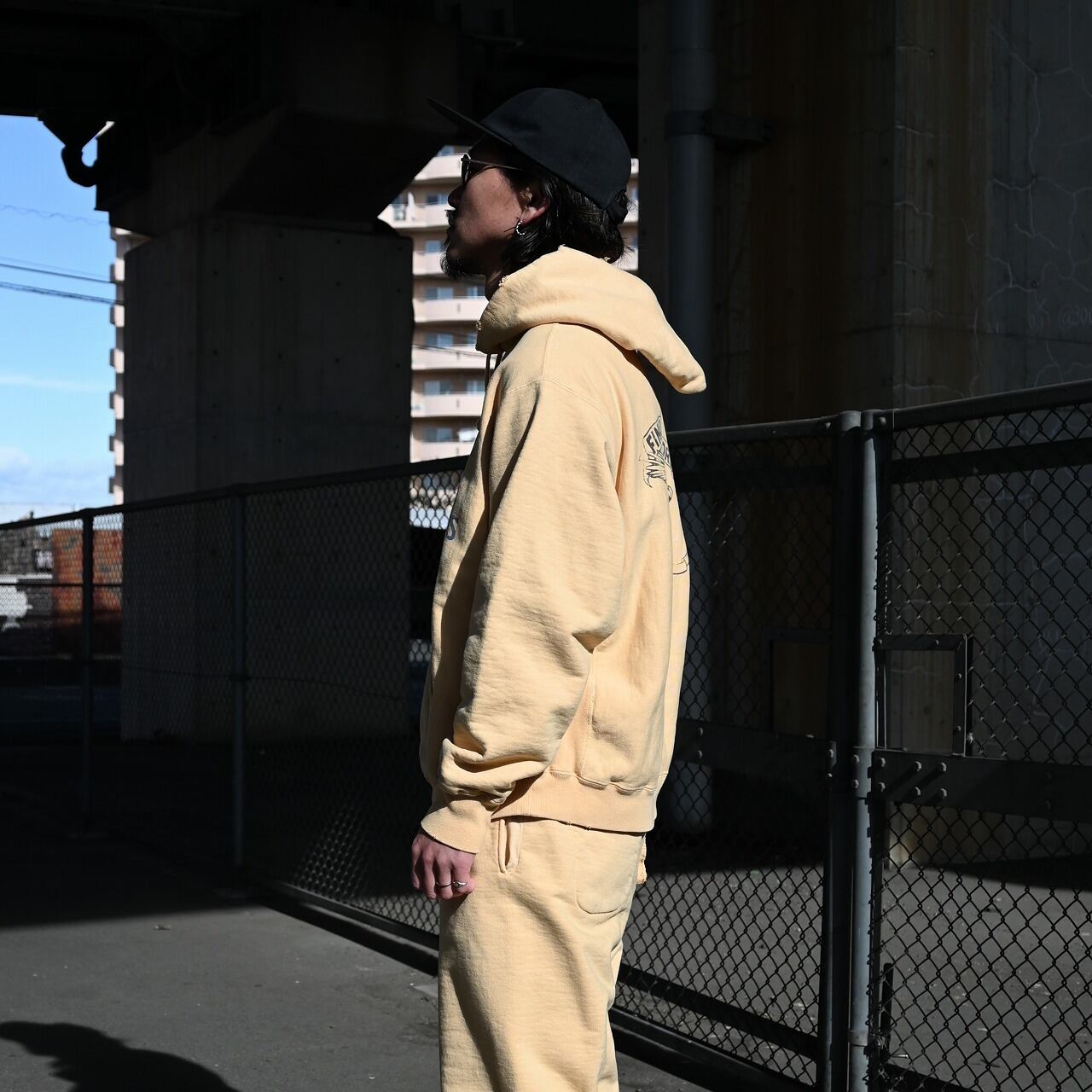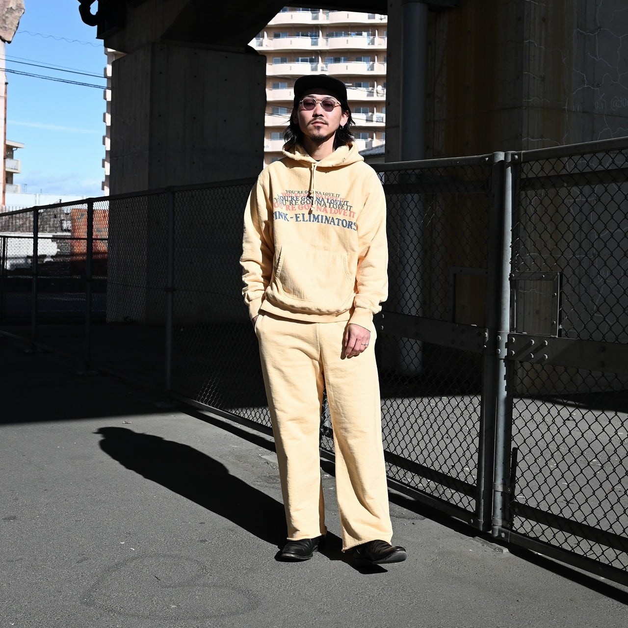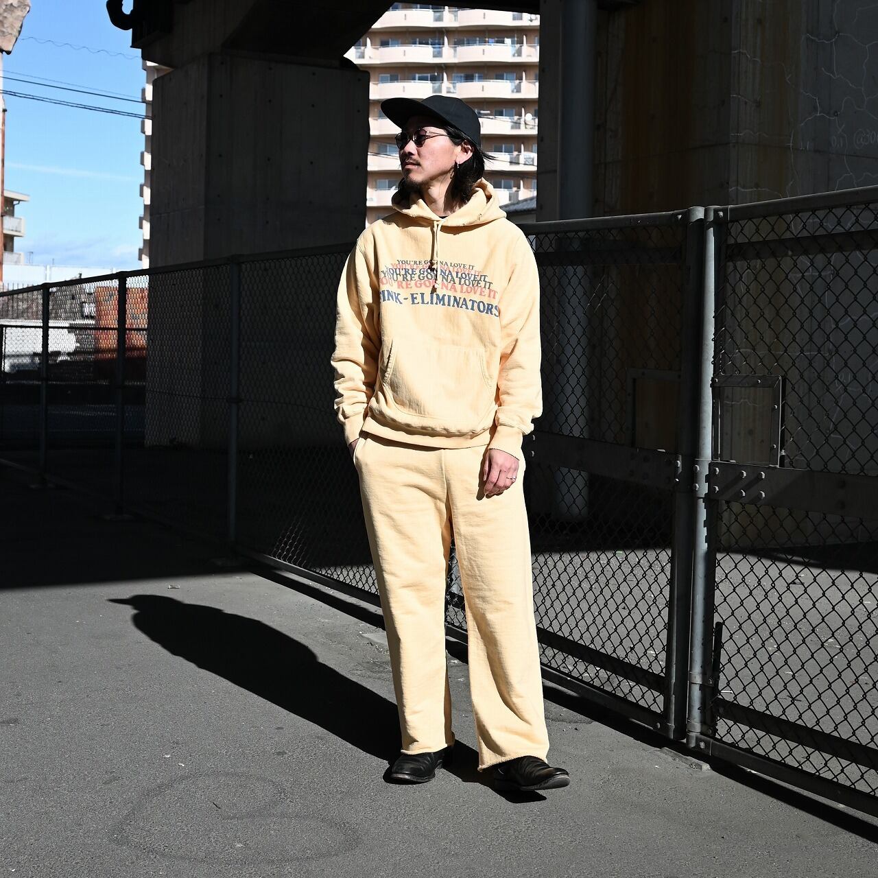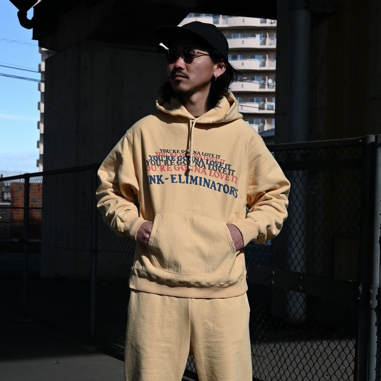 The hoodie features BOWWOW’s signature FINK-ELIMINATORS print, combining an eagle motif—an icon of motorcycle culture—with the message “YOU’RE GONNA LOVE IT.” It is matched with sweatpants finished with a cut-off hem, creating a look that reflects BOWWOW’s distinctive motorwear aesthetic.