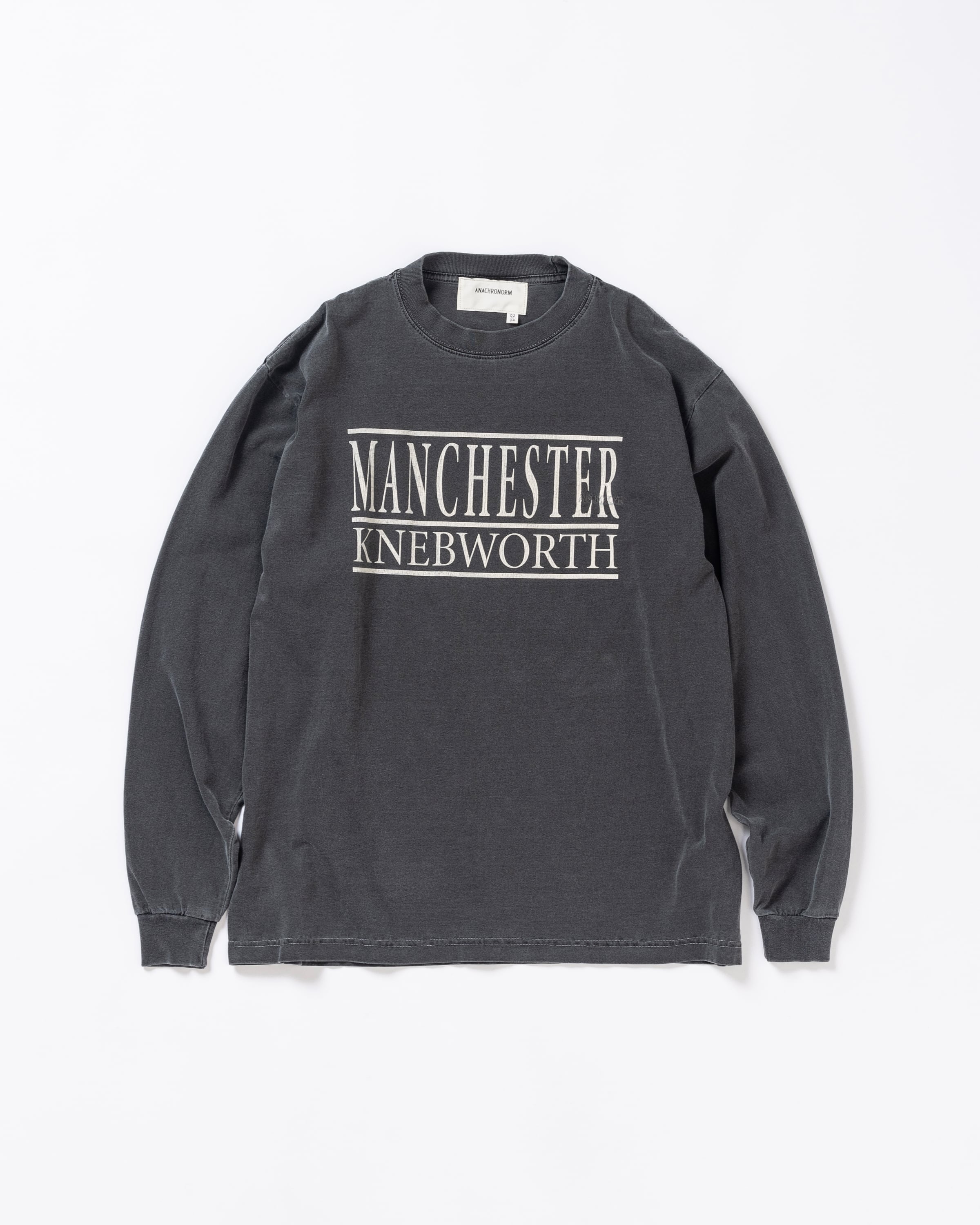 This long-sleeve T-shirt features a souvenir-style print design celebrating the birthplaces of “Manchester” and “Knebworth” culture.