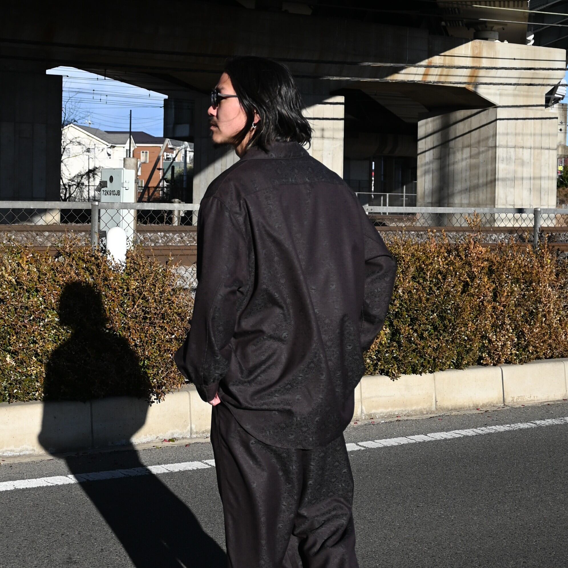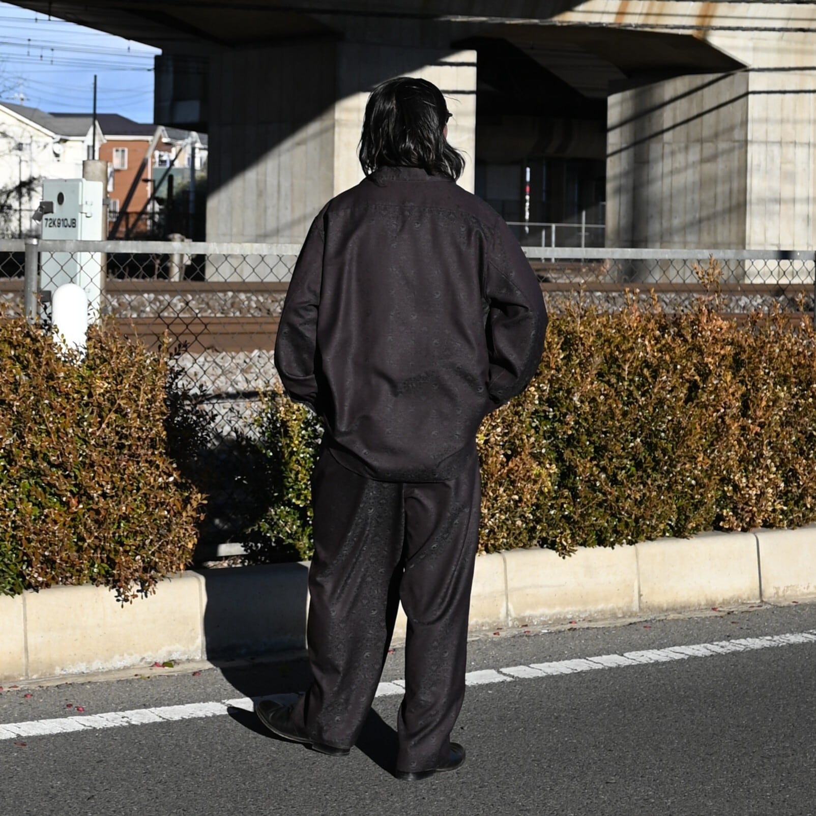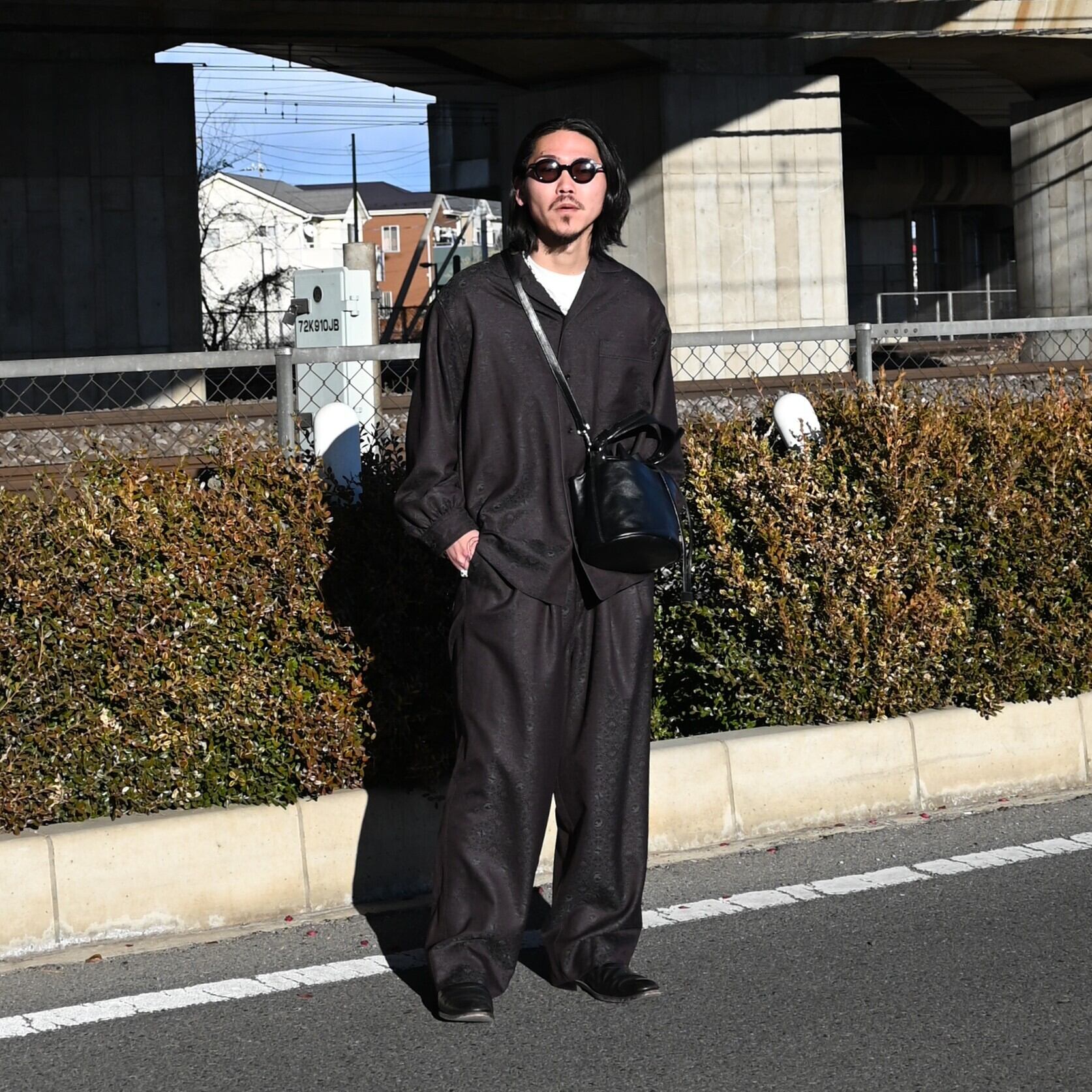 Nonnotte(ノノット)26SS新作となる、中世の古代装飾から着想を得たDormeuse柄のセットアップでコーディネート。個人的にモード感あるスタイルで見せたかったため、サングラスはkearny(カーニー)のブラックレンズのサングラス、小物にはレザー巾着バッグを合わせ、足元は革靴に。小物を無機質なものにすることで、ゆるさのあるスタイルを引き締めました。