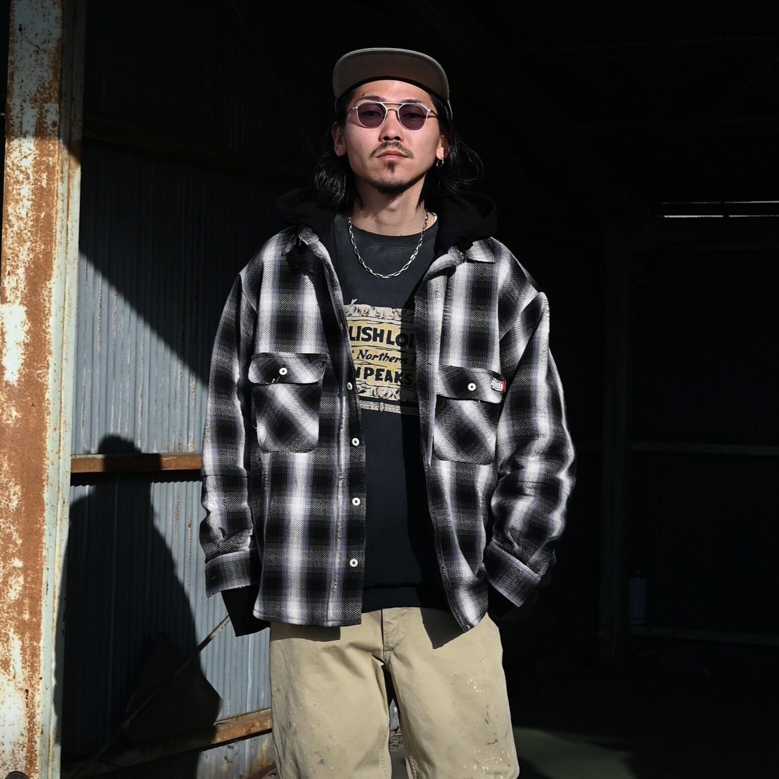 A coordinated look centered around BOWWOW’s Salish Lodge aged sweatshirt with a flocked print, layered with LEH’s Hoodie Layered Shirt as an outer piece, and paired with the aged 41 Khaki trousers scheduled for release next Saturday, February 7.