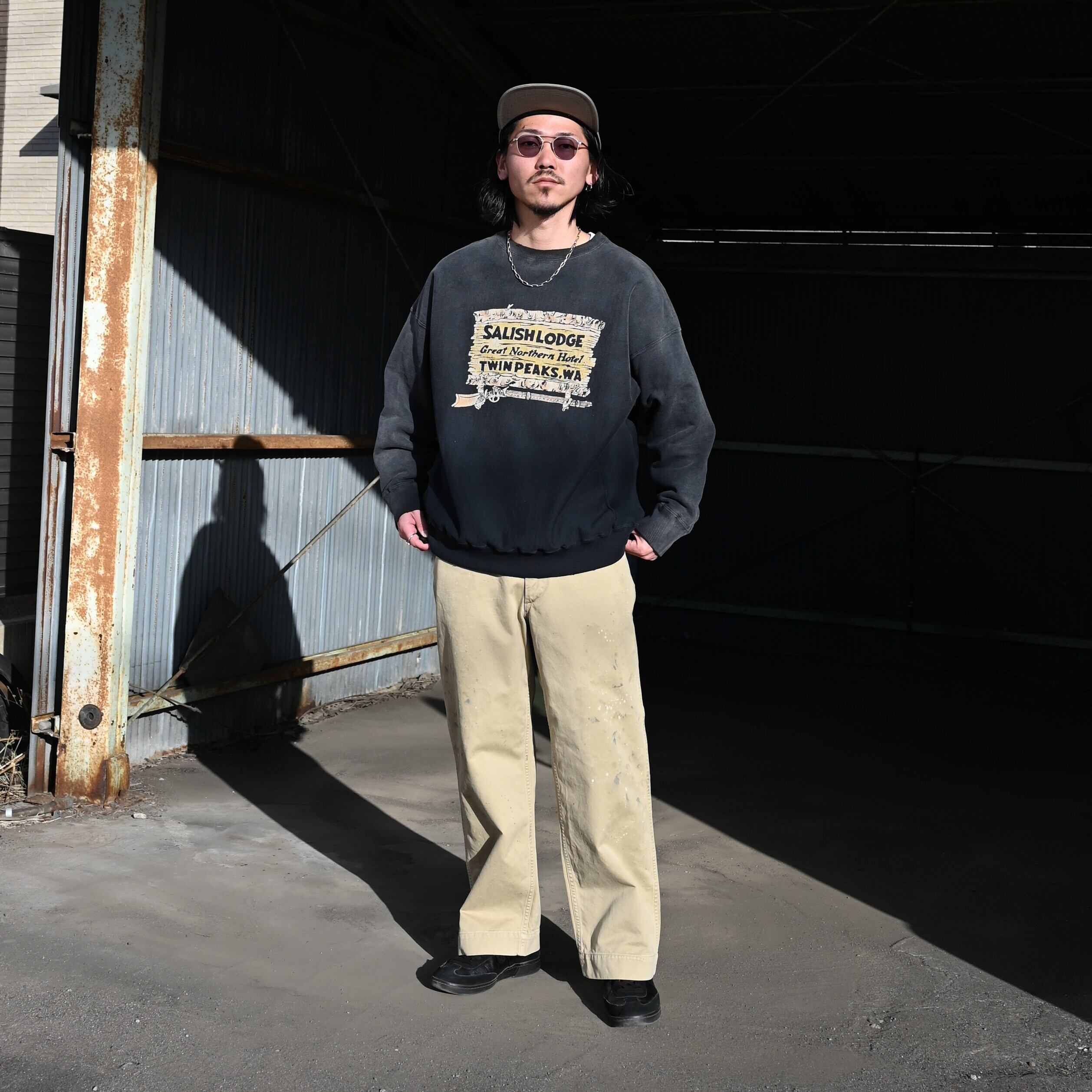 BOWWOW(バウワウ) のサリッシュロッジ、フロッキープリントの加工スウェットシャツをメインに羽織としてLEH(レー)の Hoodie Layered Shirtsを合わせ、来週の2月7日(土)発売予定である41カーキの加工パンツを合わせたコーディネート。 カーキのパンツとブラックスウェットの相性がとても良く、BOWWOWらしいコーディネートに。