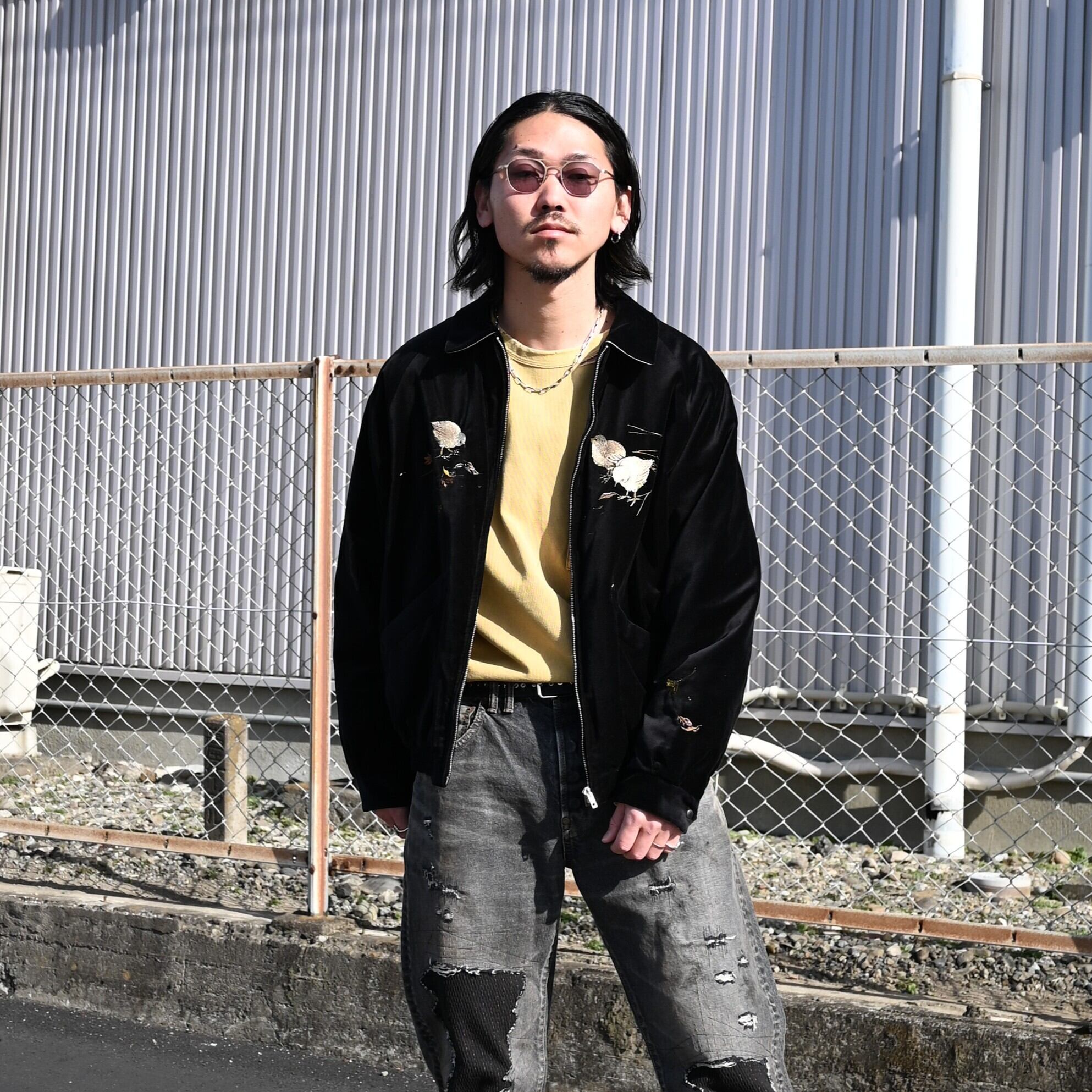 oldjoeのSTUNNING VELVET SOUVENIR JACKET(Niwatori to Hiyoko)をメインにインナーにはイベント限定アイテムのアナクロノーム、MOSS STITCH DAMAGED POCKET L/S T-Sを合わせました。