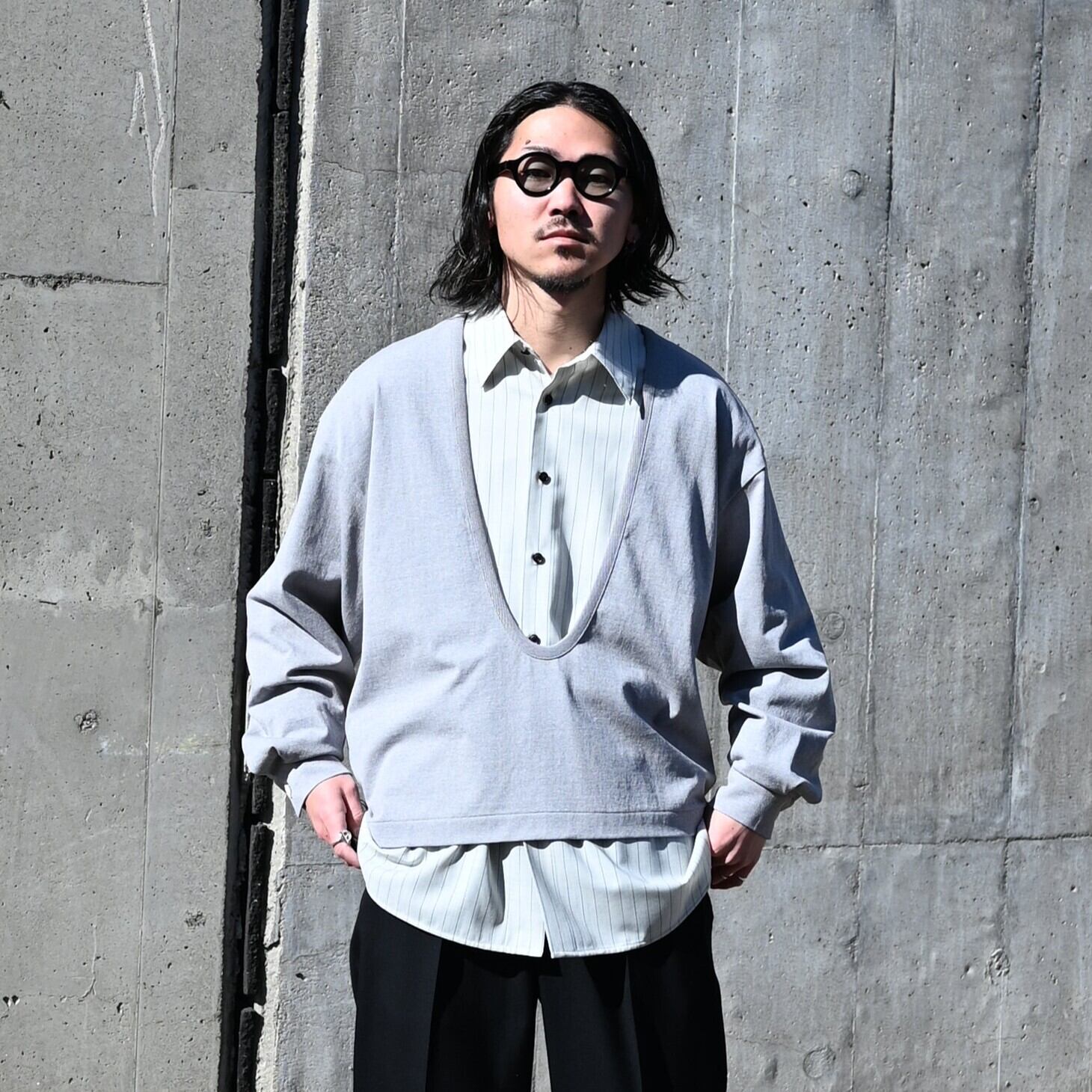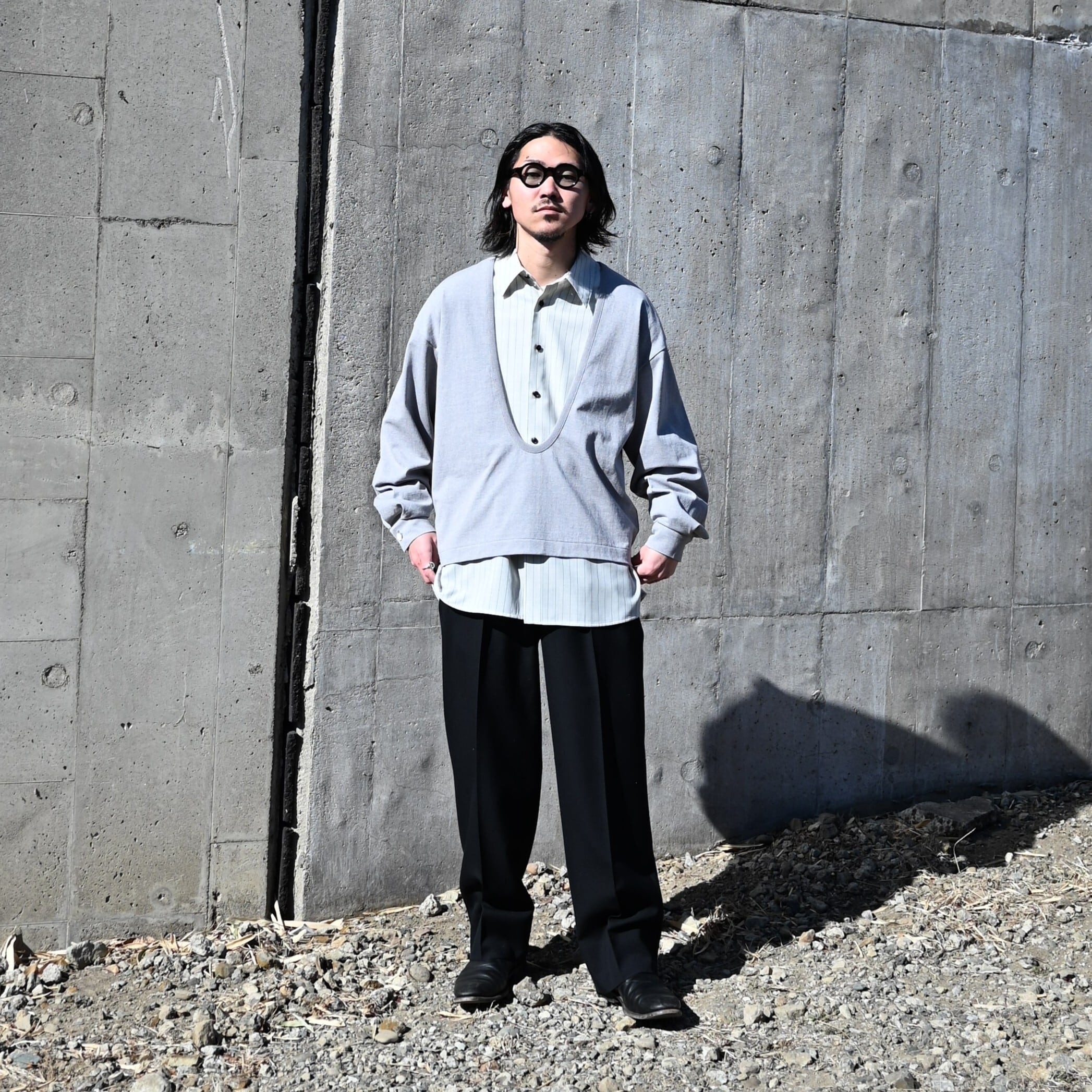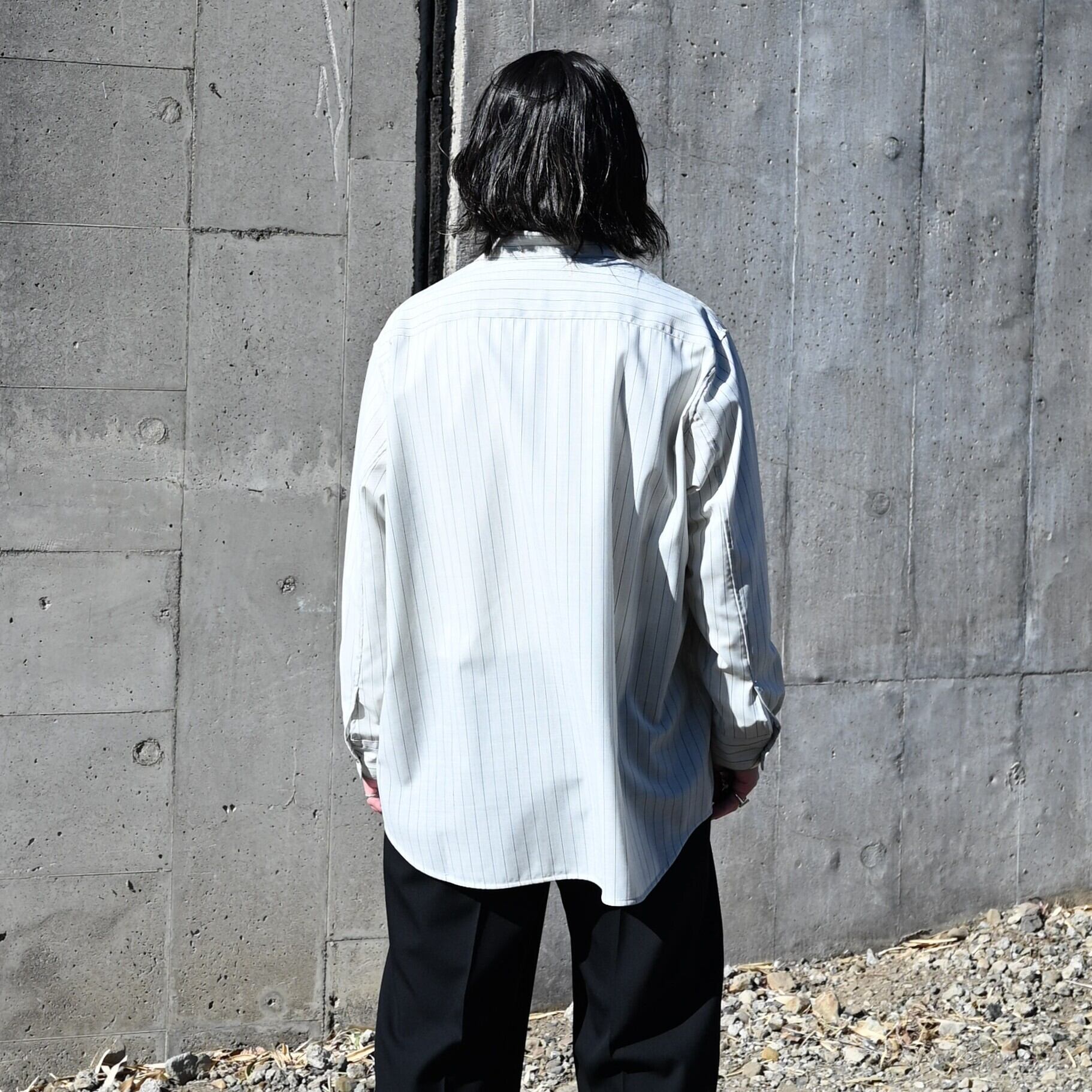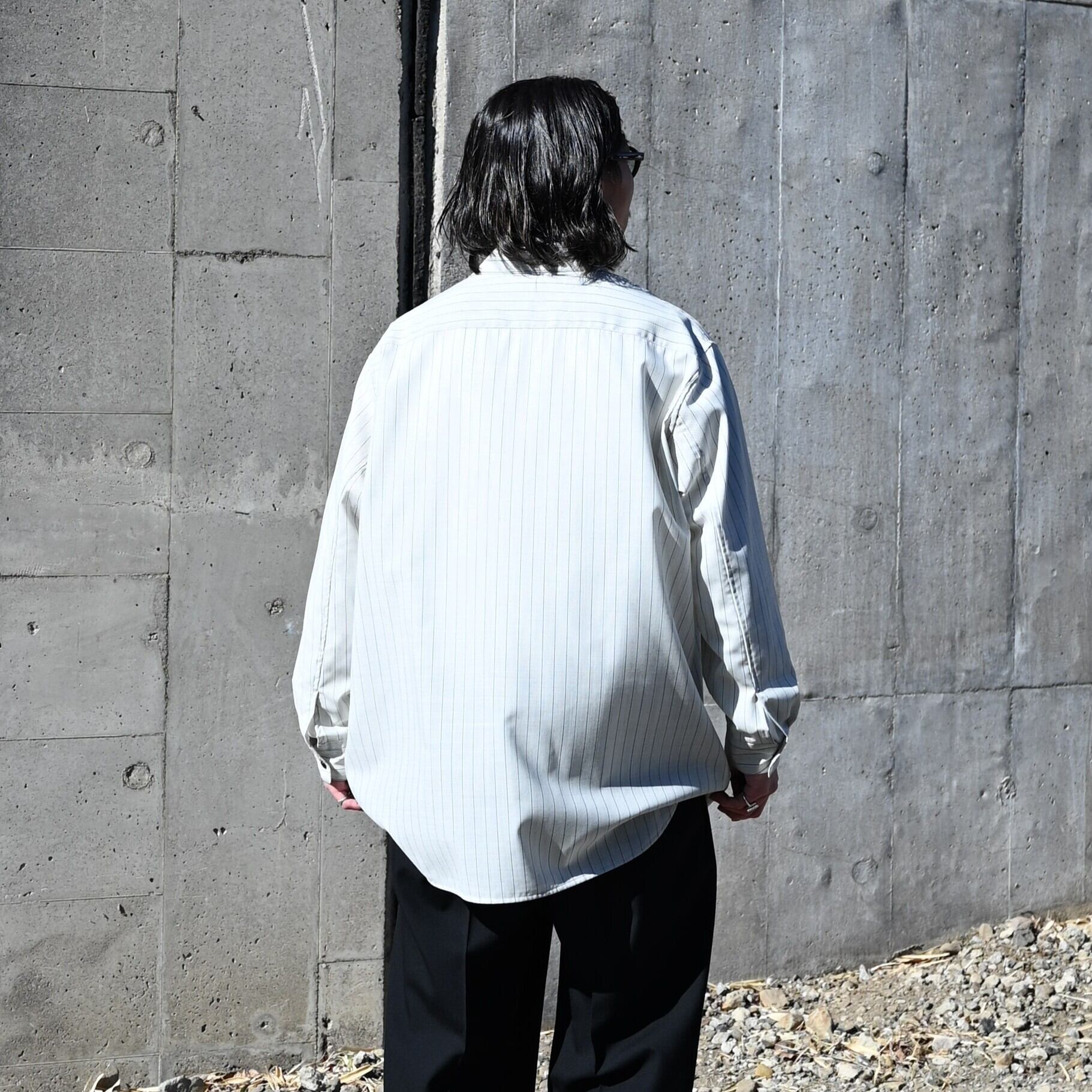 シルクのようにドライで滑らかな肌触りを体感できるバランス天竺のヴァルーズ、水のように透けるような質感をイメージしたOversized Shirtを合わせました。INTERIM(インテリム)のMILITARY WOOL SERGE 1-TUCK FRENCH ARMY WIDE TAPERED TROUSERを合わせたきれいめスタイルです。