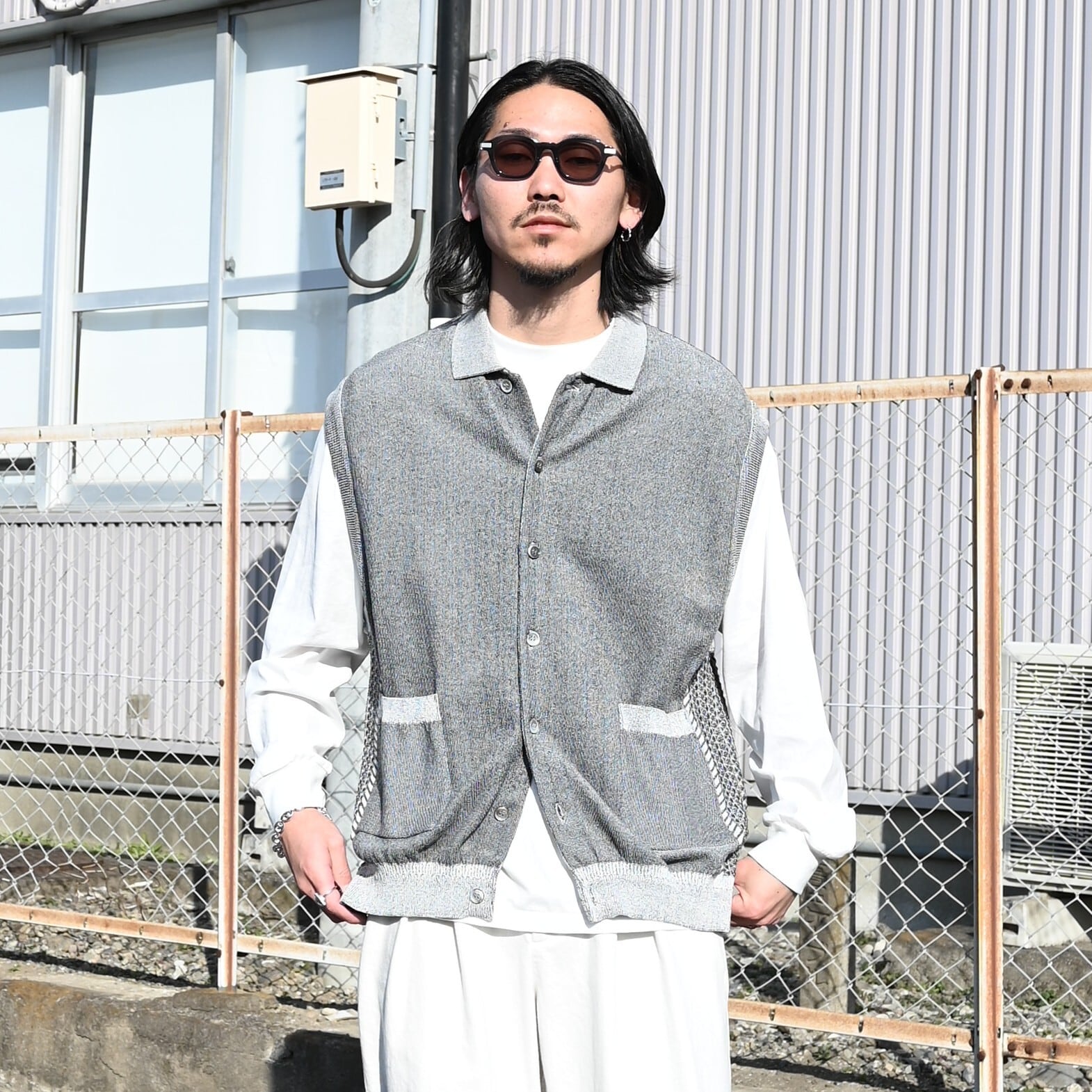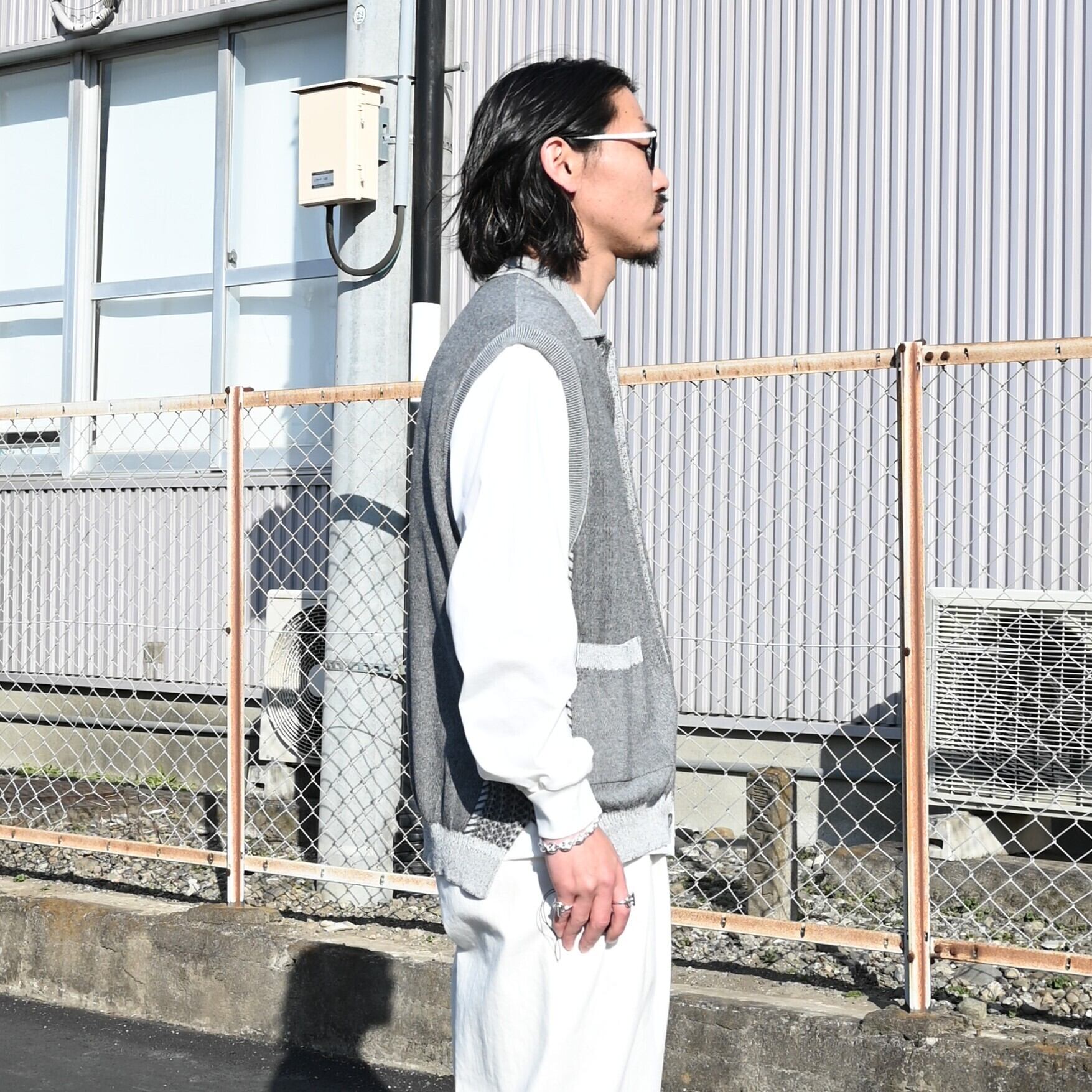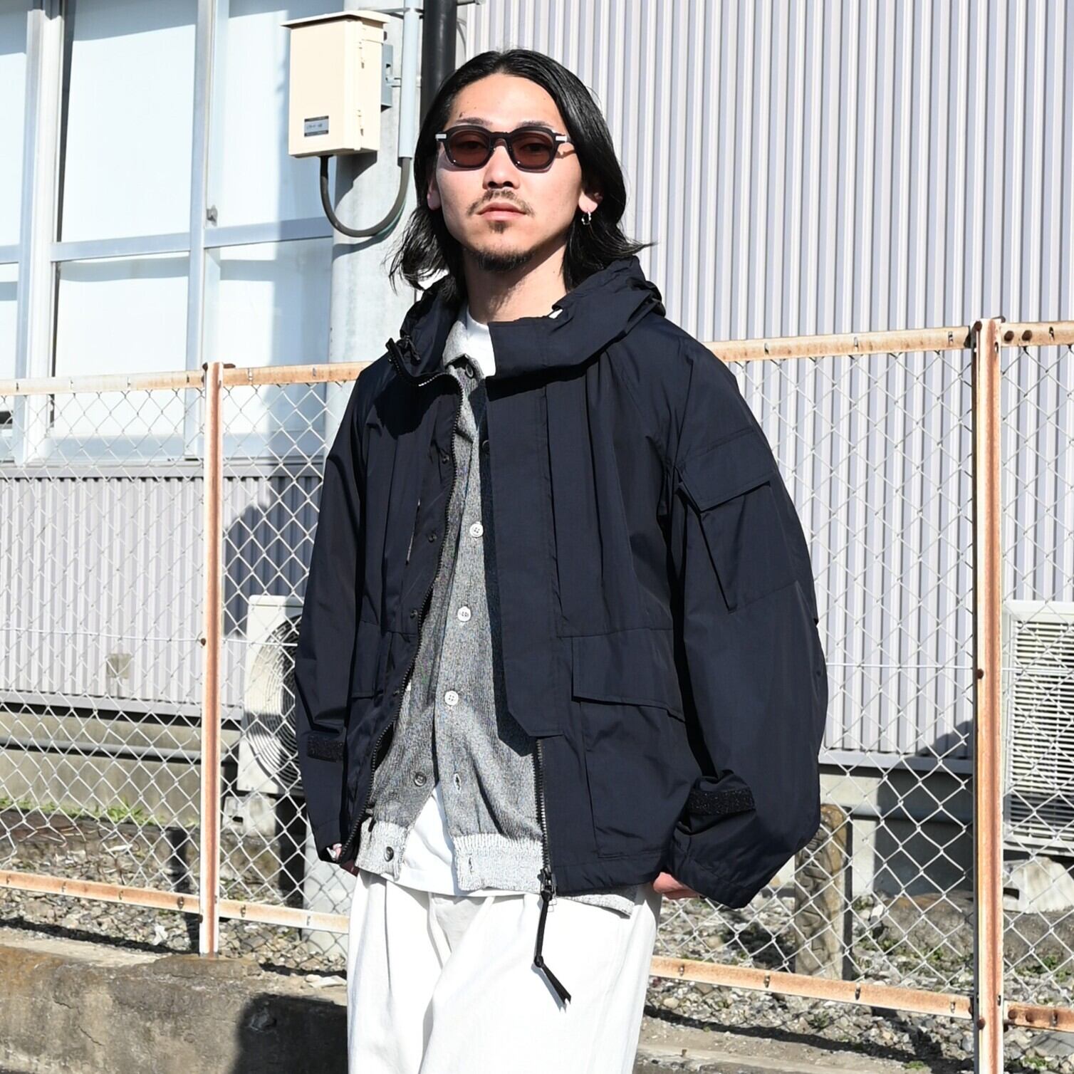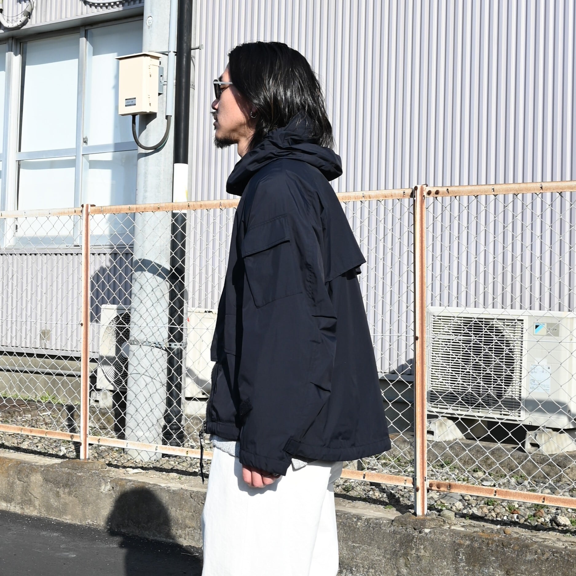 YASHIKI SAYATOMO(ヤシキサヤトモ) の 2-Tack Cutoff Wide Denim Pantsをメインにコーディネート。Product Twelve(プロダクトトゥエルブ)P12 Rain Jacketを合わせ、インナーに Kinkai Collar Vestを合わせました〇