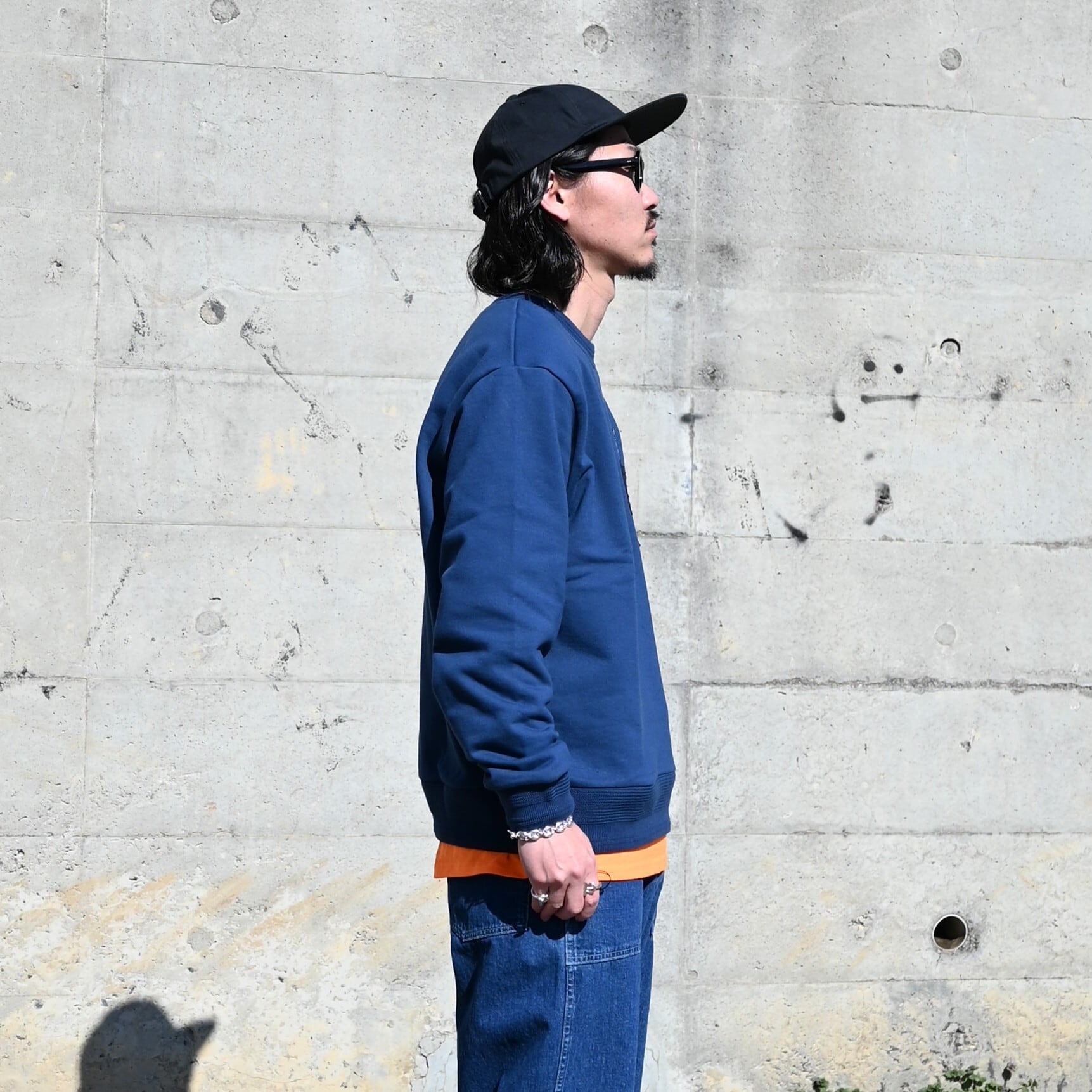 For the inner layers, a KUON Boro Sweatshirt and INTERIM USED SLUB YARN DENIM BAKER PANTS are paired to create a sport-casual look. While the styling leans casual, the cotton–silk blouson adds a refined, mature elegance, keeping the overall impression sophisticated.