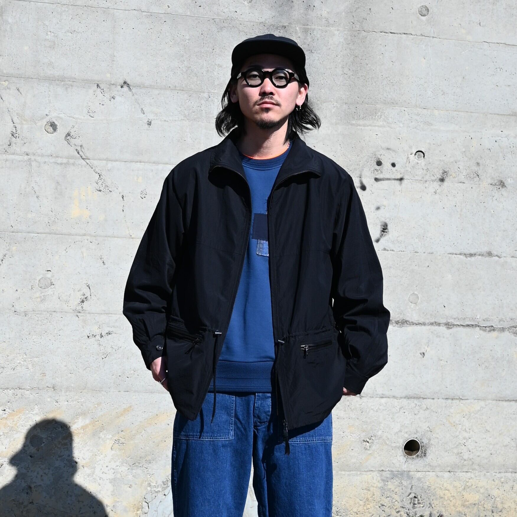 インナーにはKUON(クオン)の Boro Sweatshirt、INTERIM(インテリム)のUSED SLUB YARN DENIM BAKER PANTSを合わせたスポーツカジュアルライクな合わせながら、ブルゾンはコットンシルク生地のため、ほどよく大人の品を残したジャケットになっております。