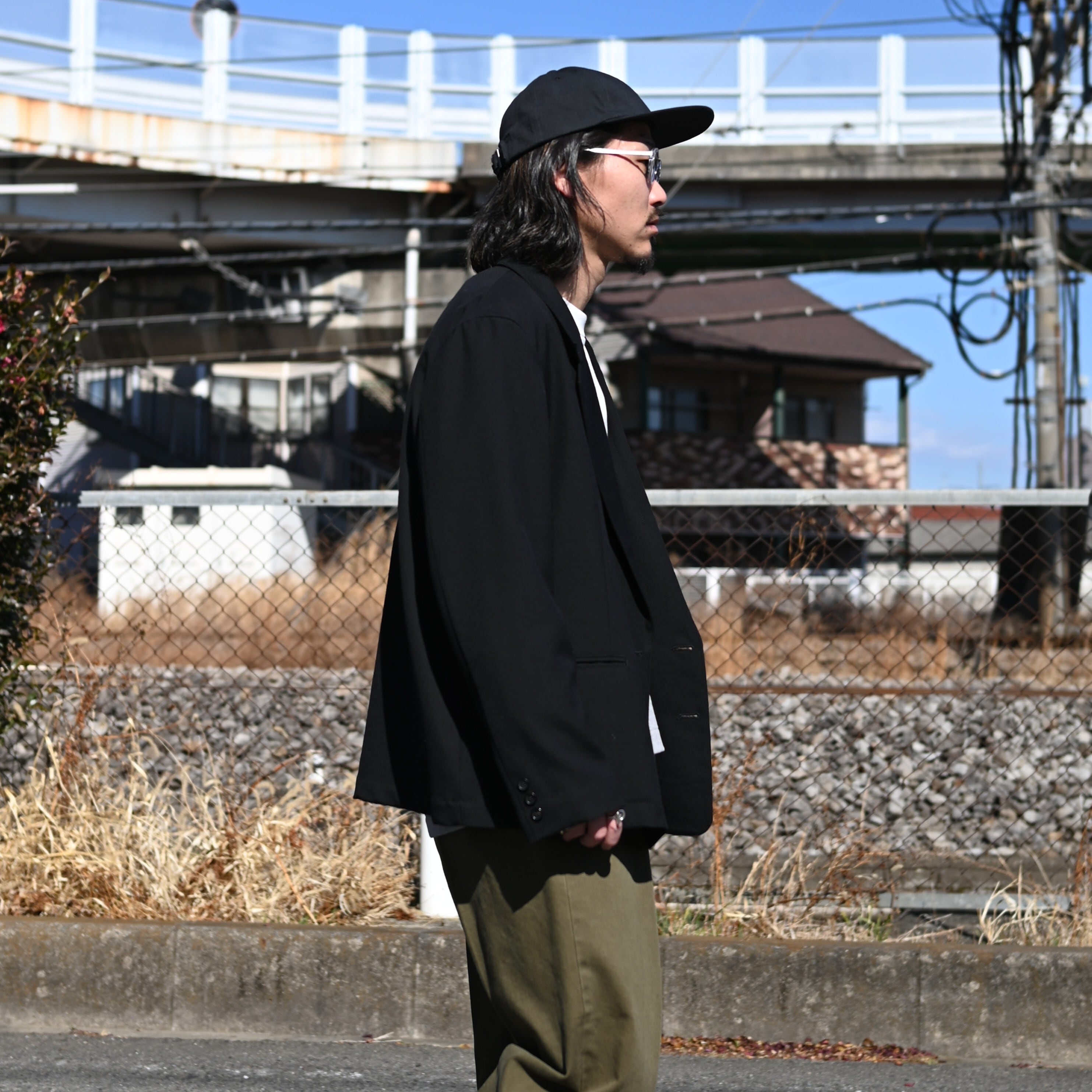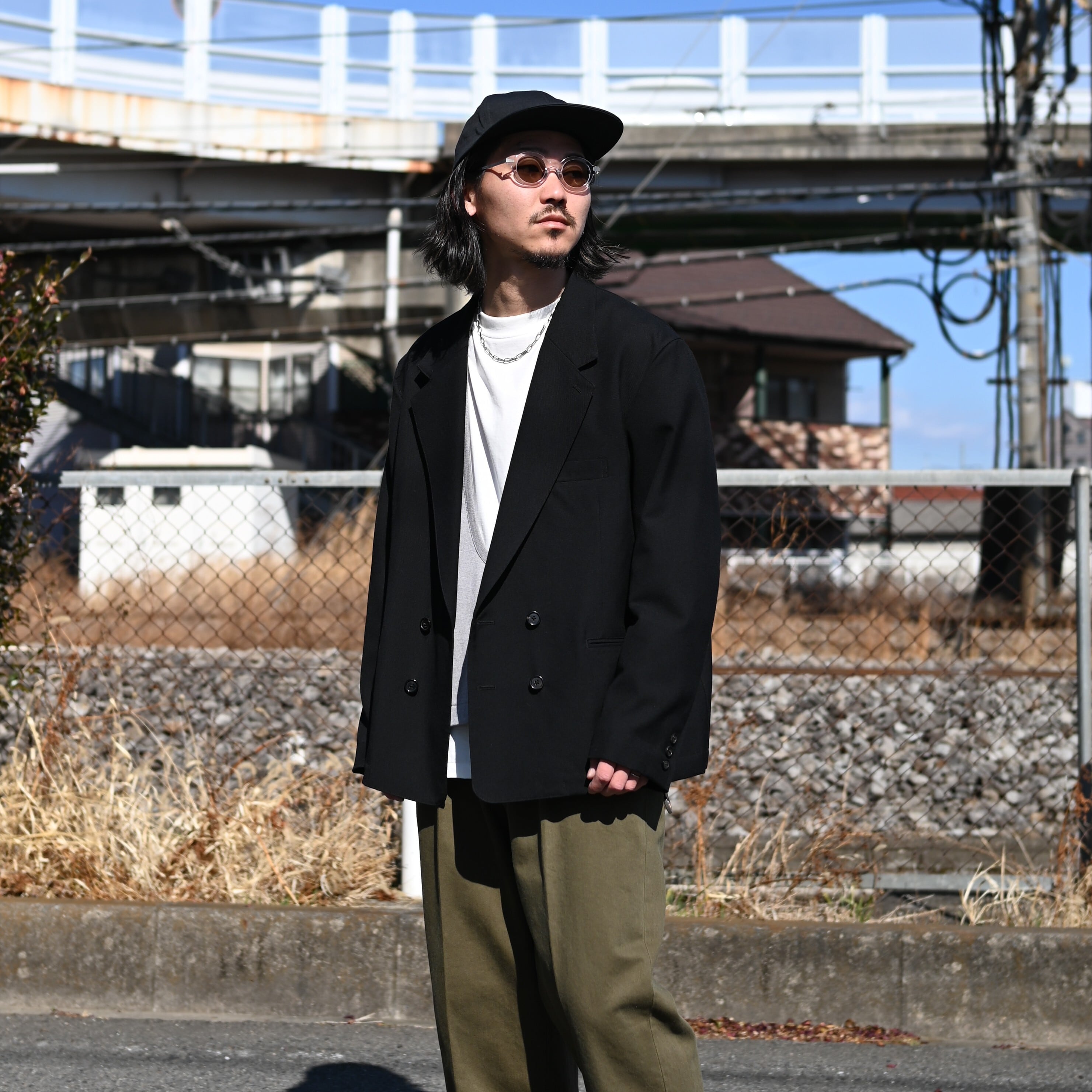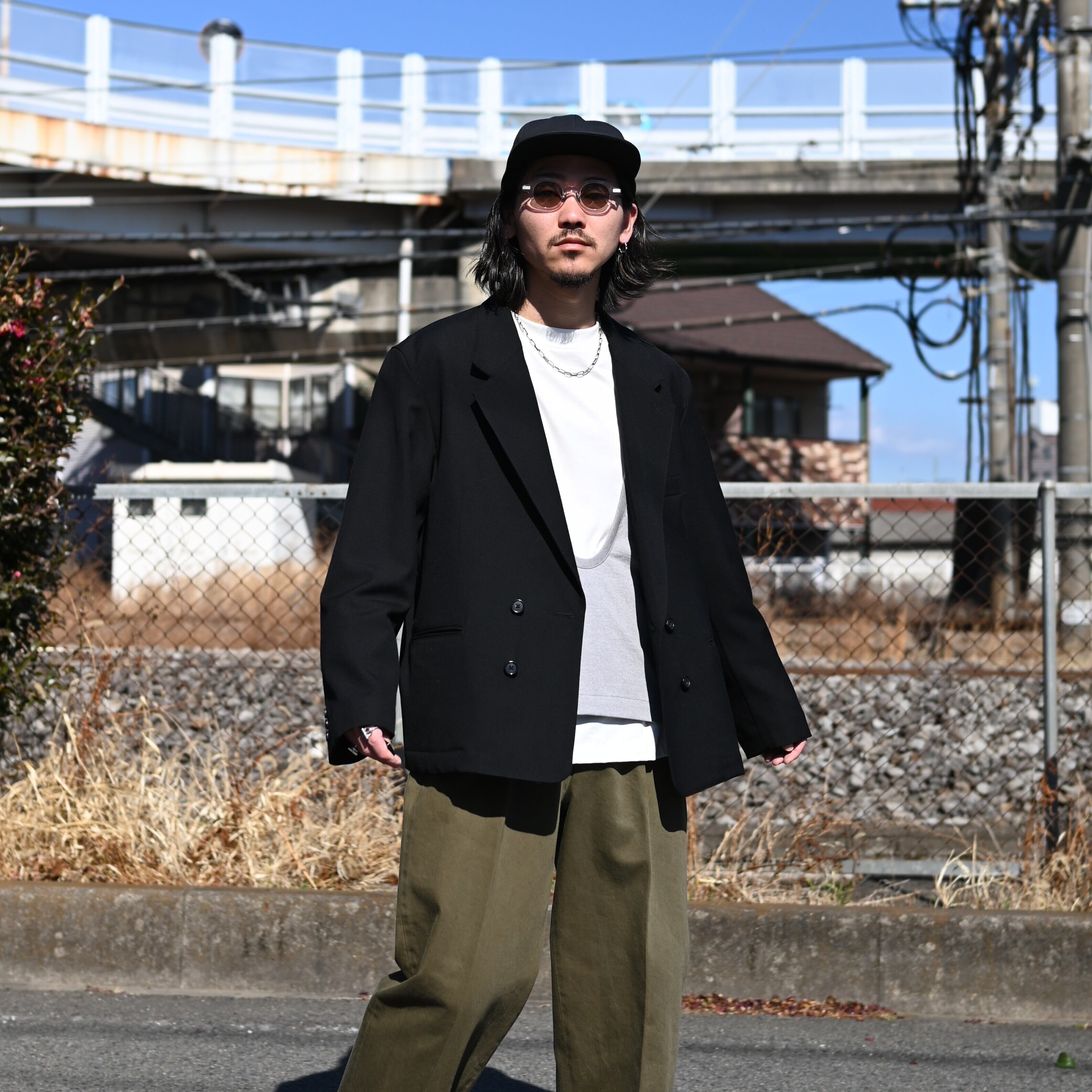 The double jacket serves as the main piece, layered with the varouse underneath. The key point of the styling is the addition of khaki chino slacks, which bring a subtle, spring-like freshness to the outfit.