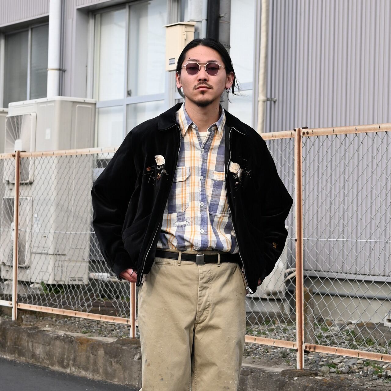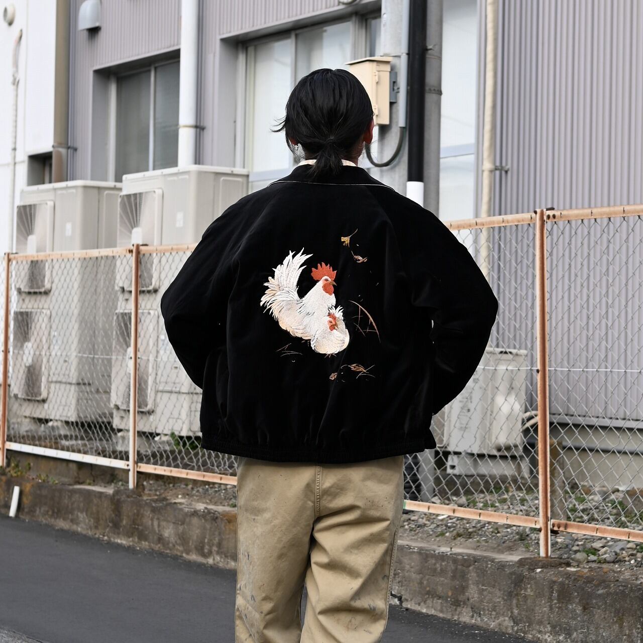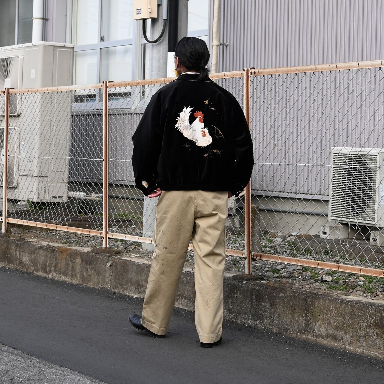 For the outer layer, we paired OLDJOE’s STUNNING VELVET SOUVENIR JACKET (Niwatori to Hiyoko), with a TUBE TEE (Crew-Neck) worn as the inner layer.
