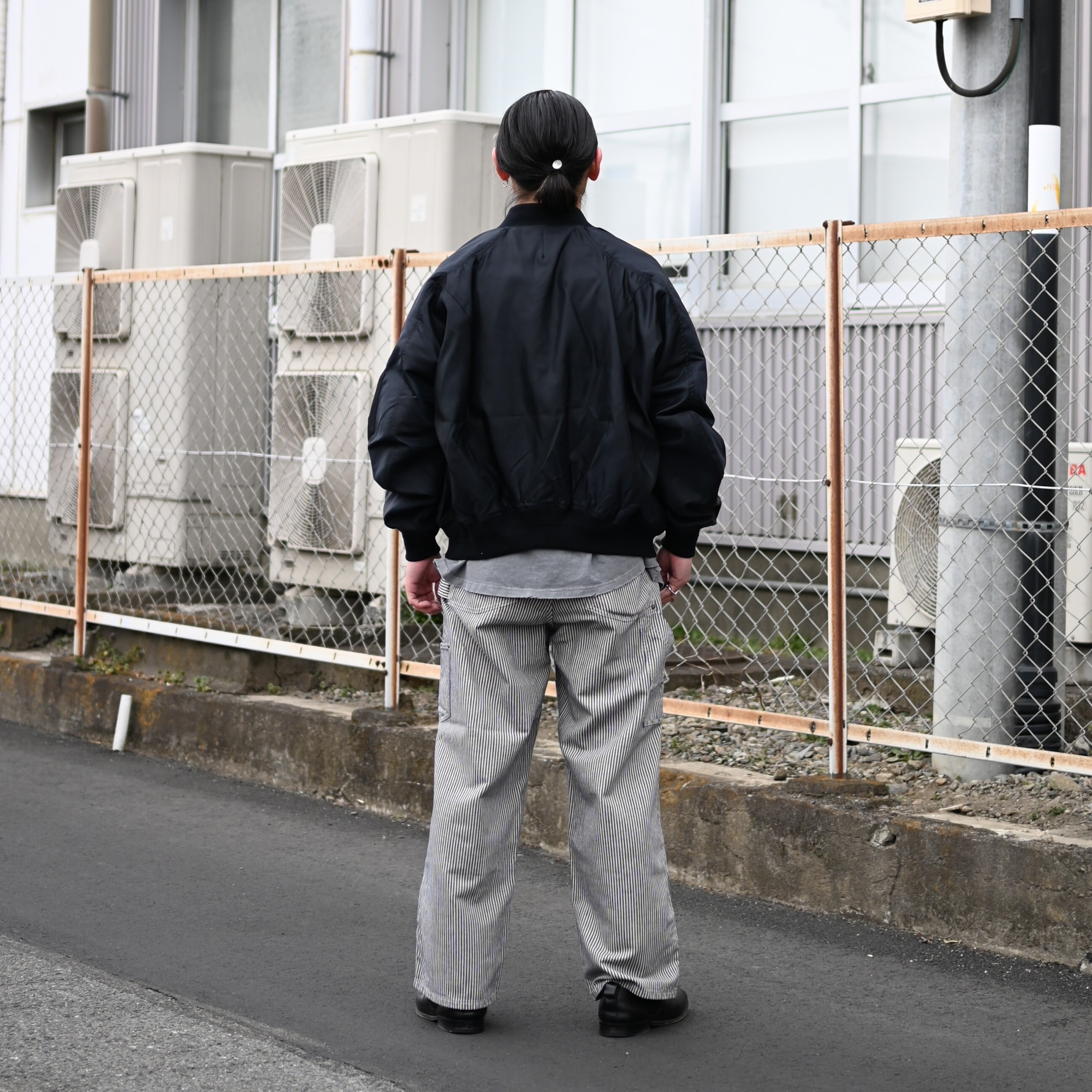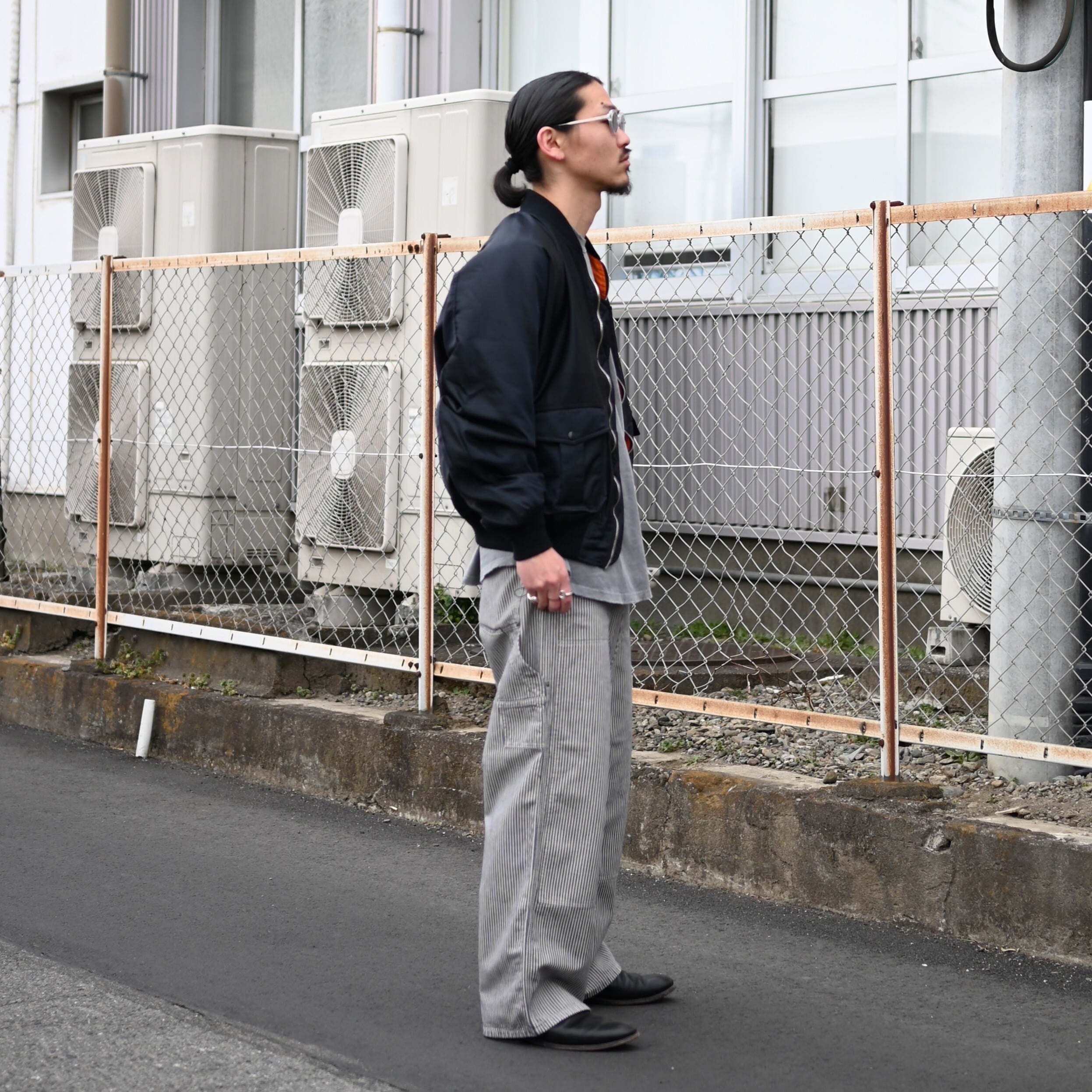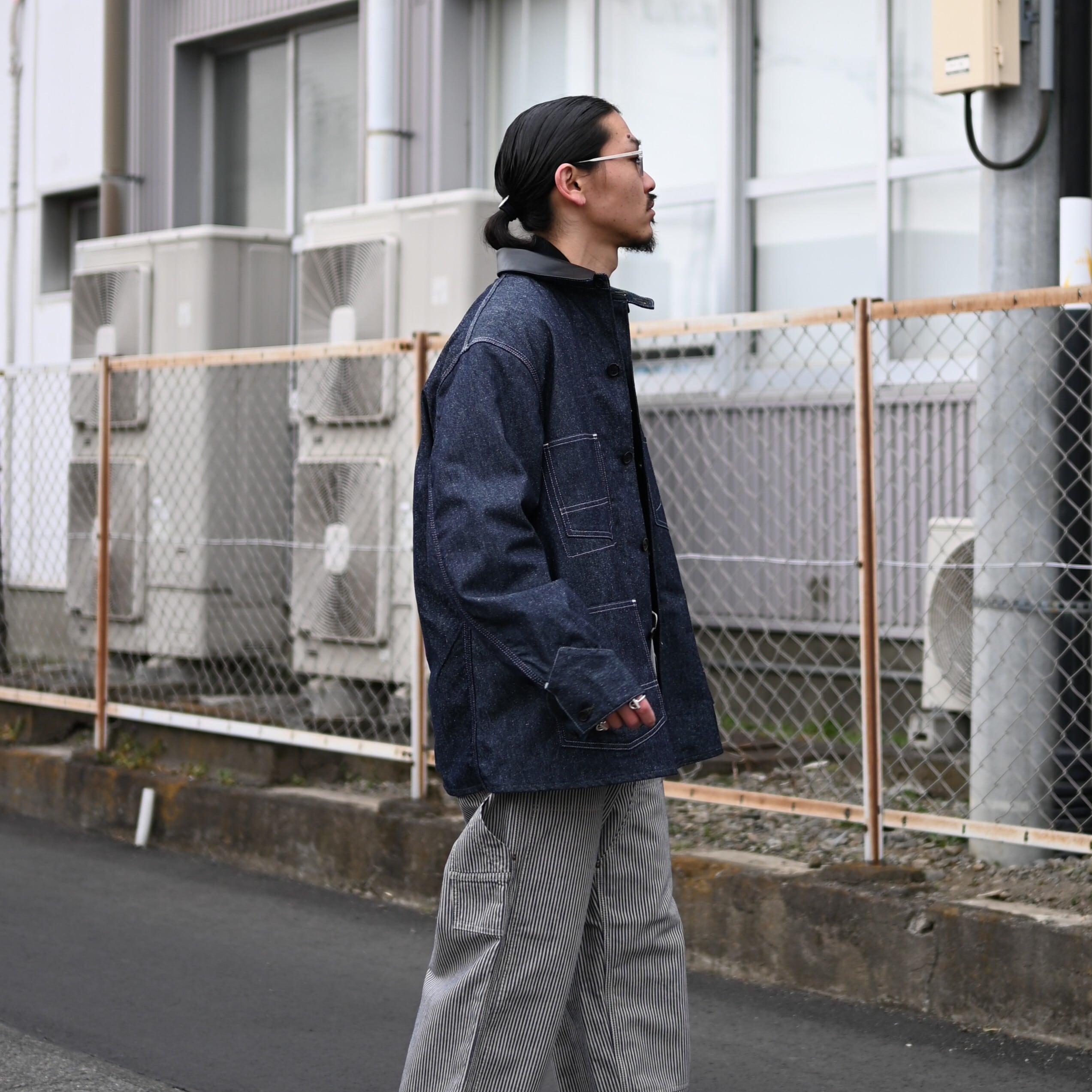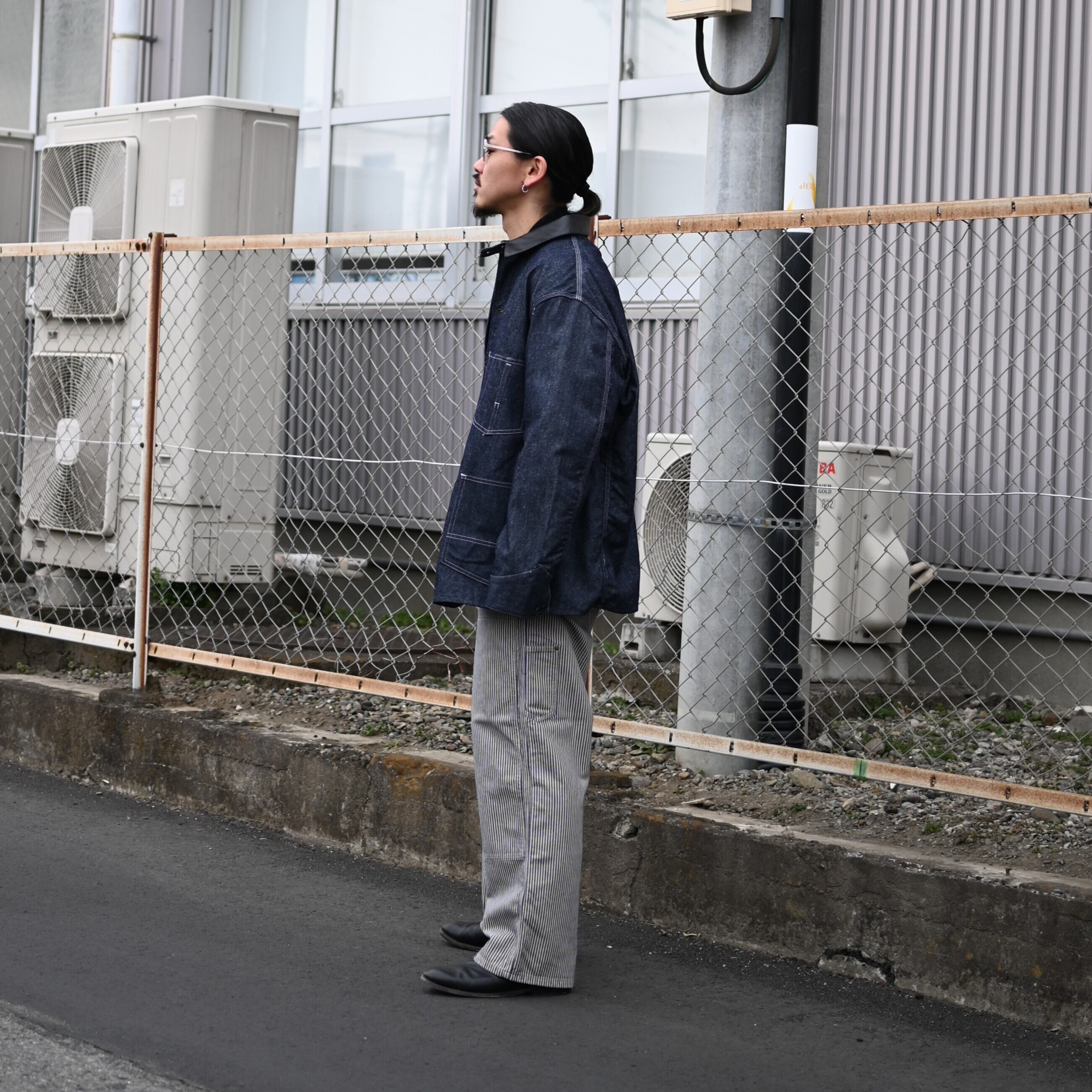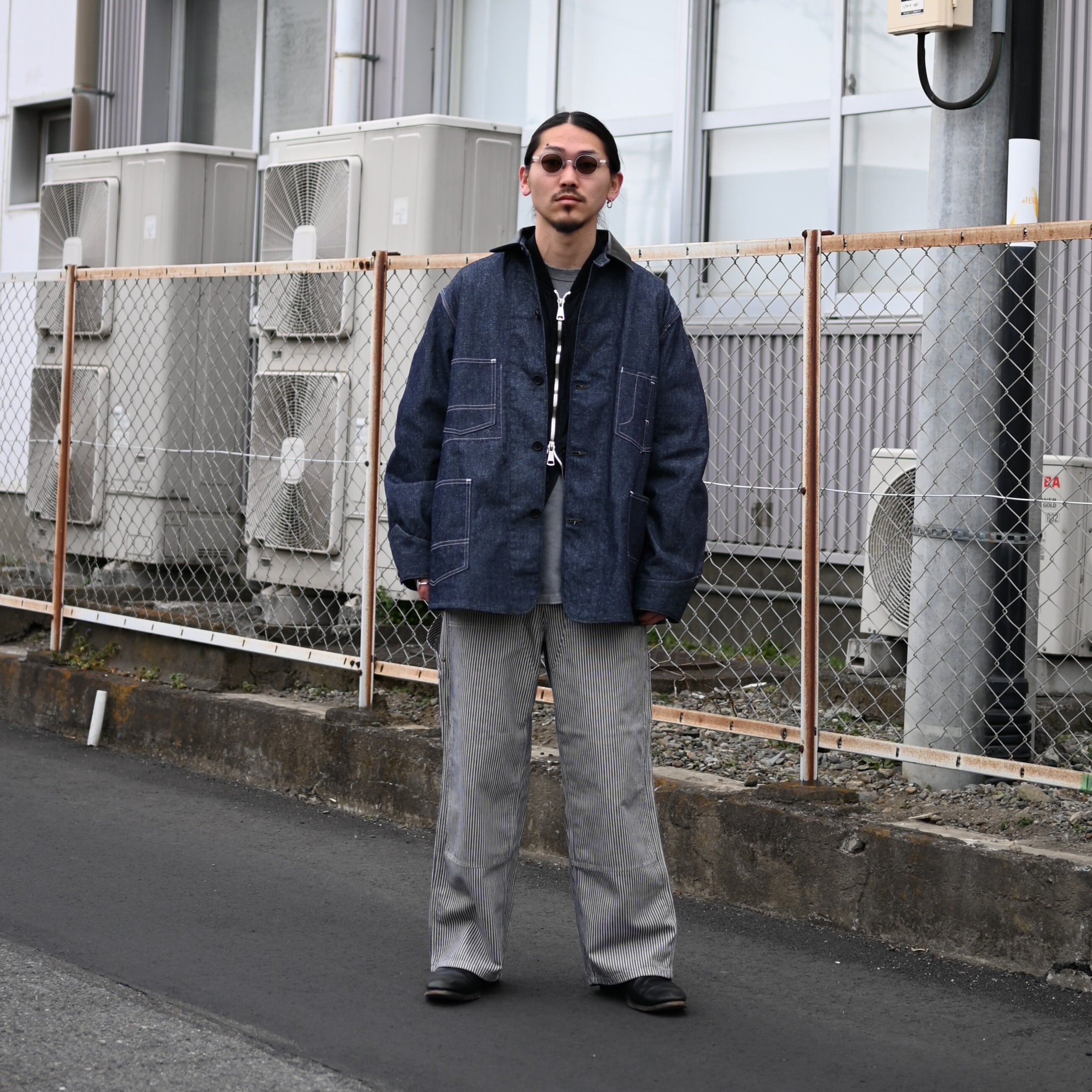 INTERIM(インテリム)襟レザーカバーオール、AUBERGE(オーベルジュ)ヒッコリーストライプパンツコーディネート