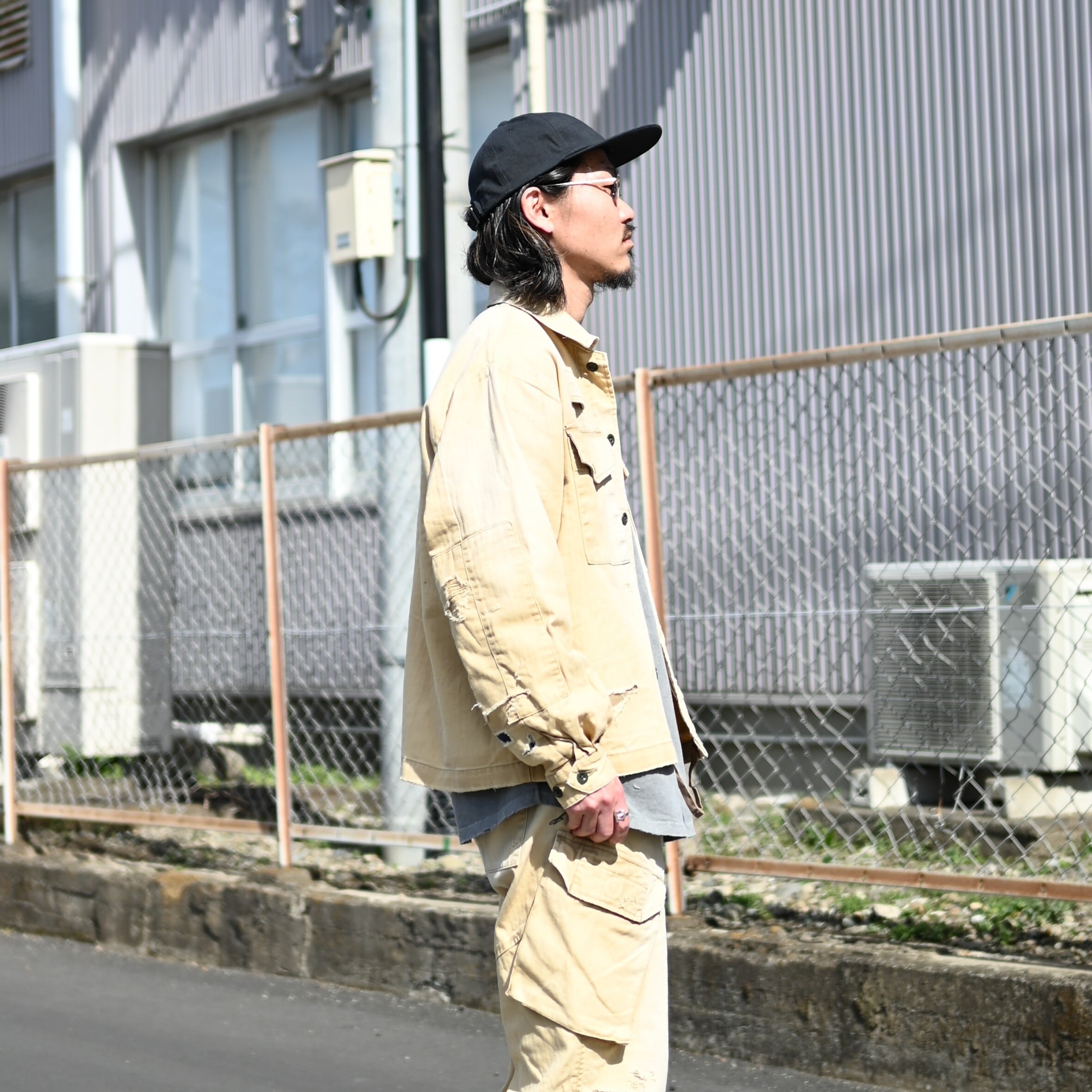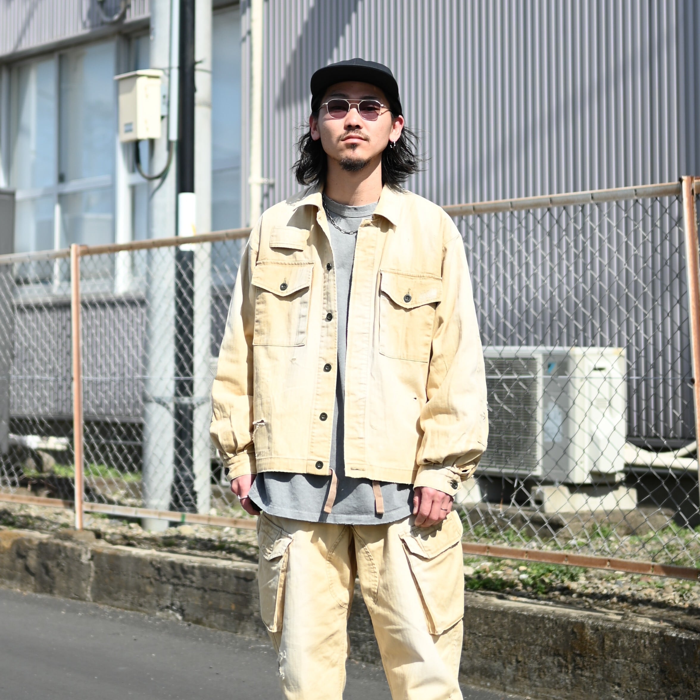 ANACHRONORM (アナクロノーム)の特殊エイジング加工/サンフェードダメージ加工を施したミリタリーシャツジャケットとコンバットパンツをセットアップ着用。
