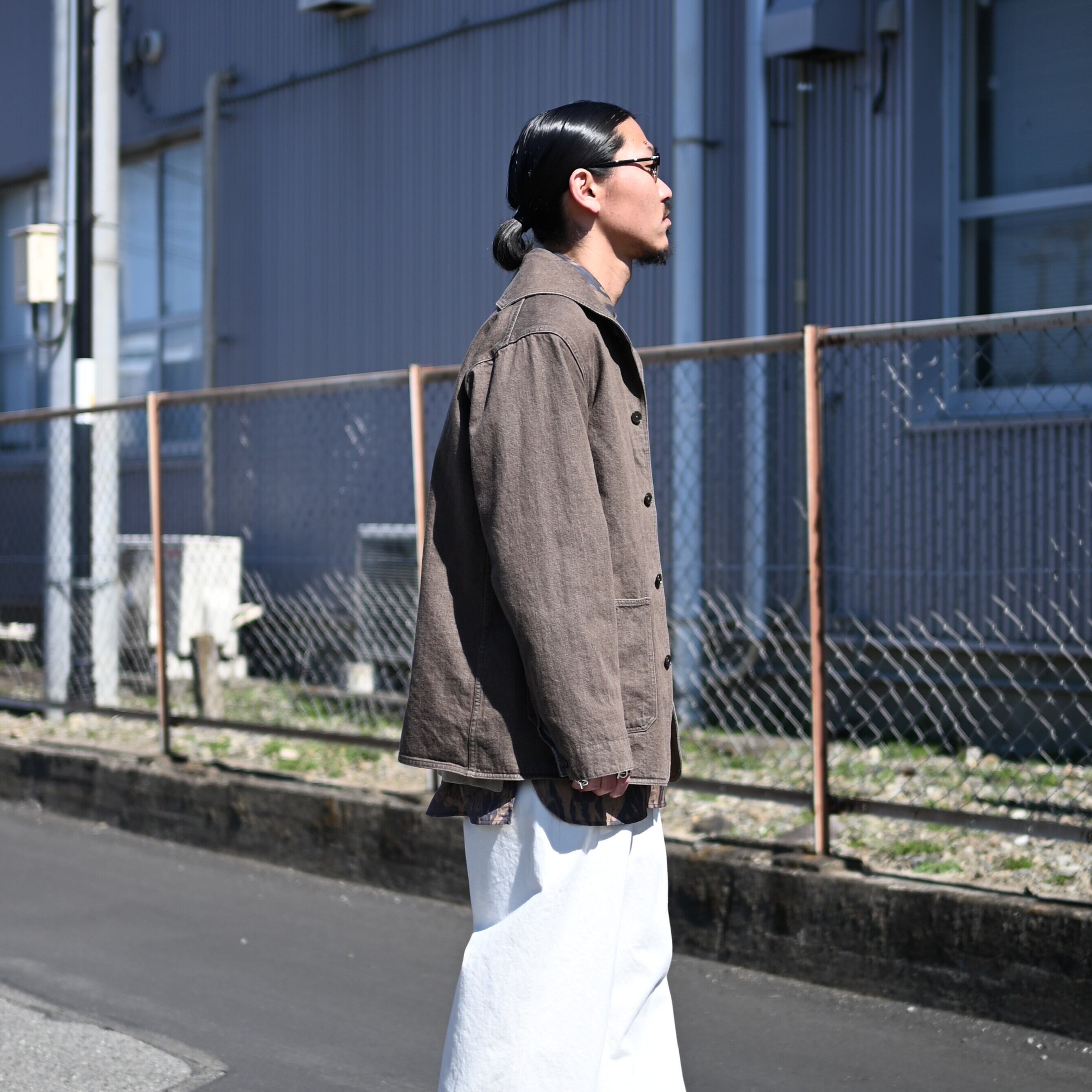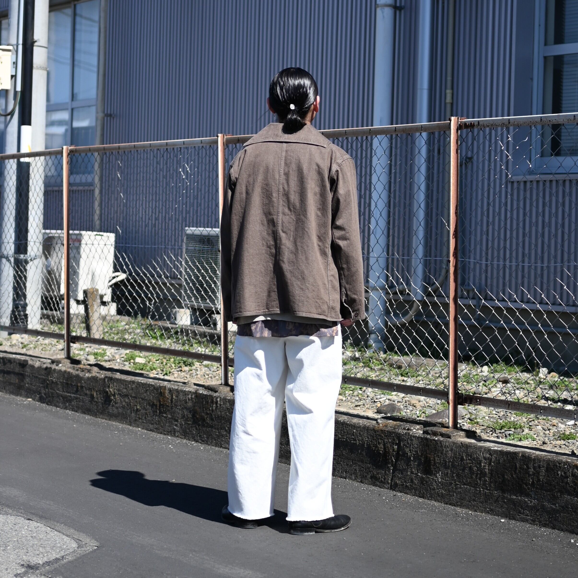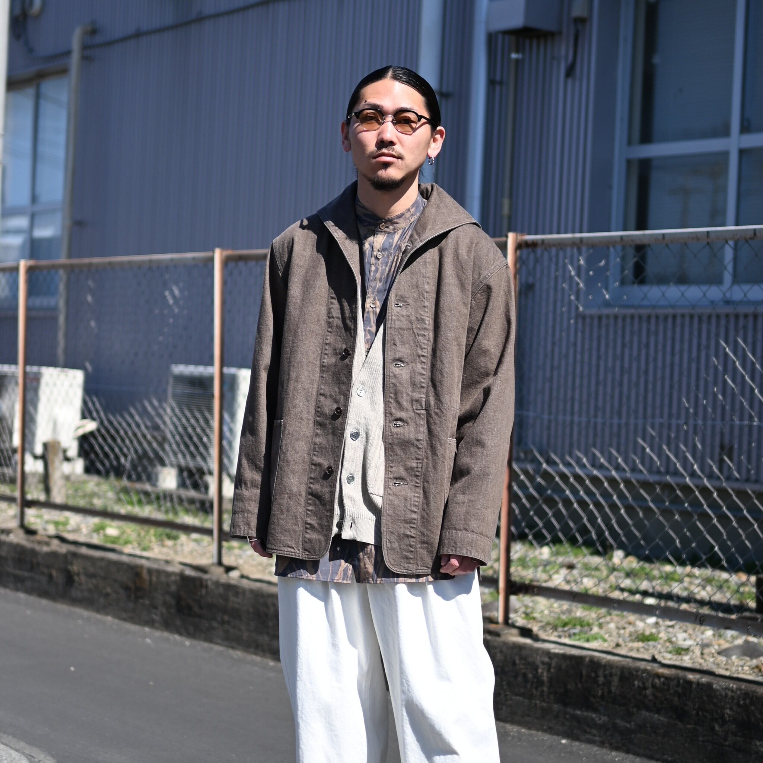 For this look, I styled it with a sailor collar jacket from OLD JOE, a special-order vest from YASHIKI, and white cut-off denim from SAYATOMO.