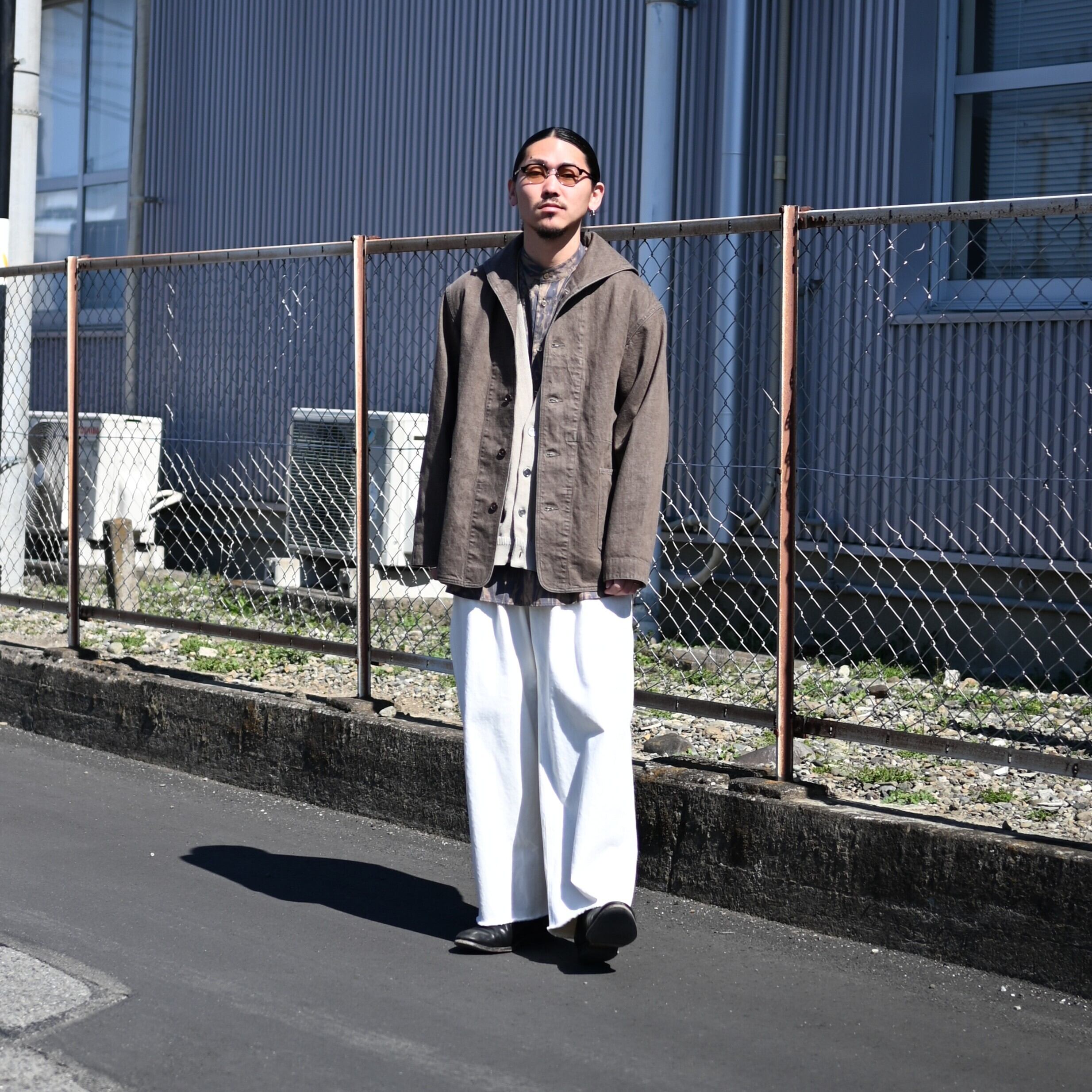 今回はOLDJOEのセーラーカラージャケット、YASHIKI別注のベストとSAYATOMOのホワイトカットオフデニムを合わせました〇