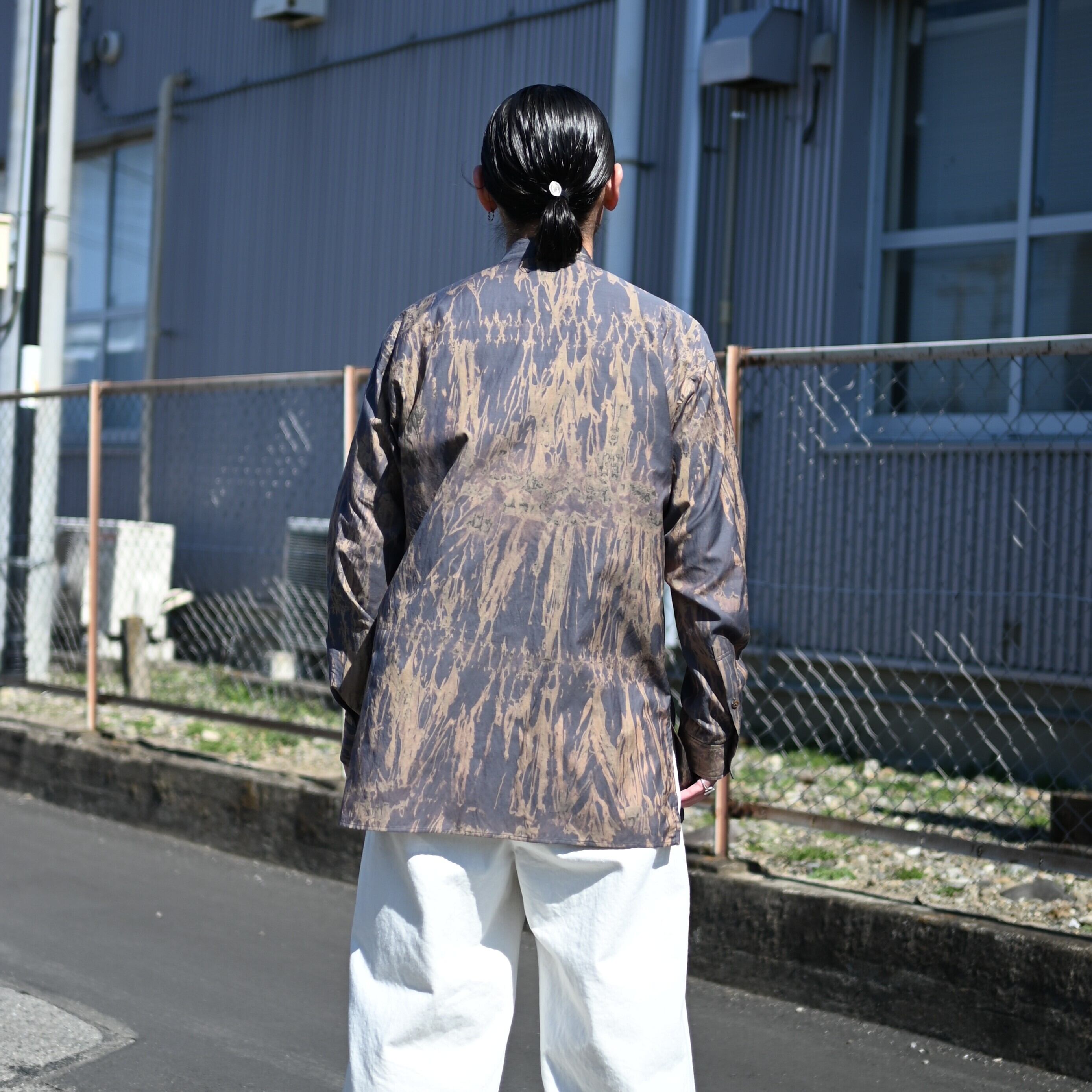山内(ヤマウチ)から流し染めコットンキュプラツイルシャツ スタンドカラーが入荷。リスクを背負った一発勝負のテキスタイル、コットンキュプラツイル・有松絞りにより製作されたこちらのシャツはメイン使いはもちろんのことインナー使いでも存在感がございます。