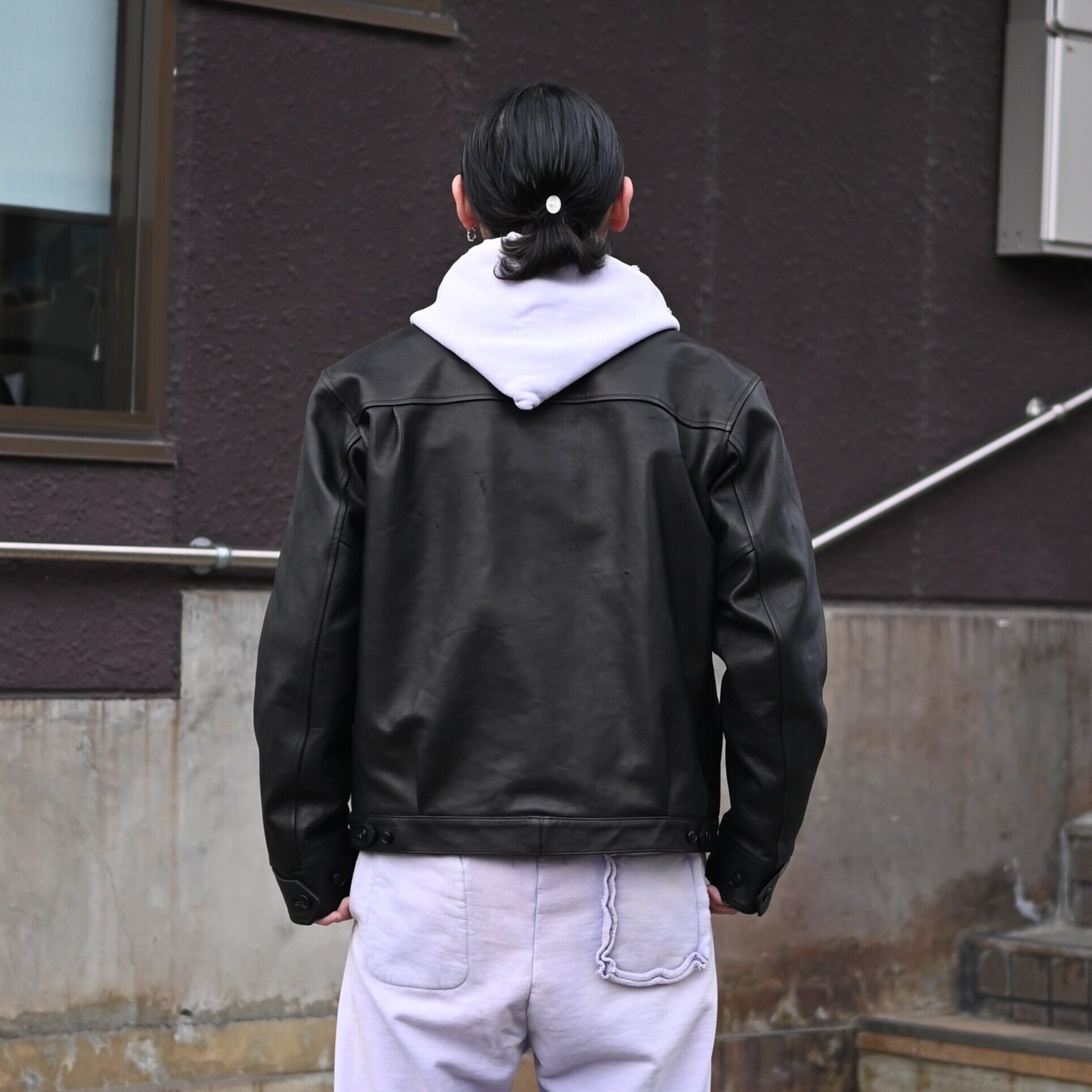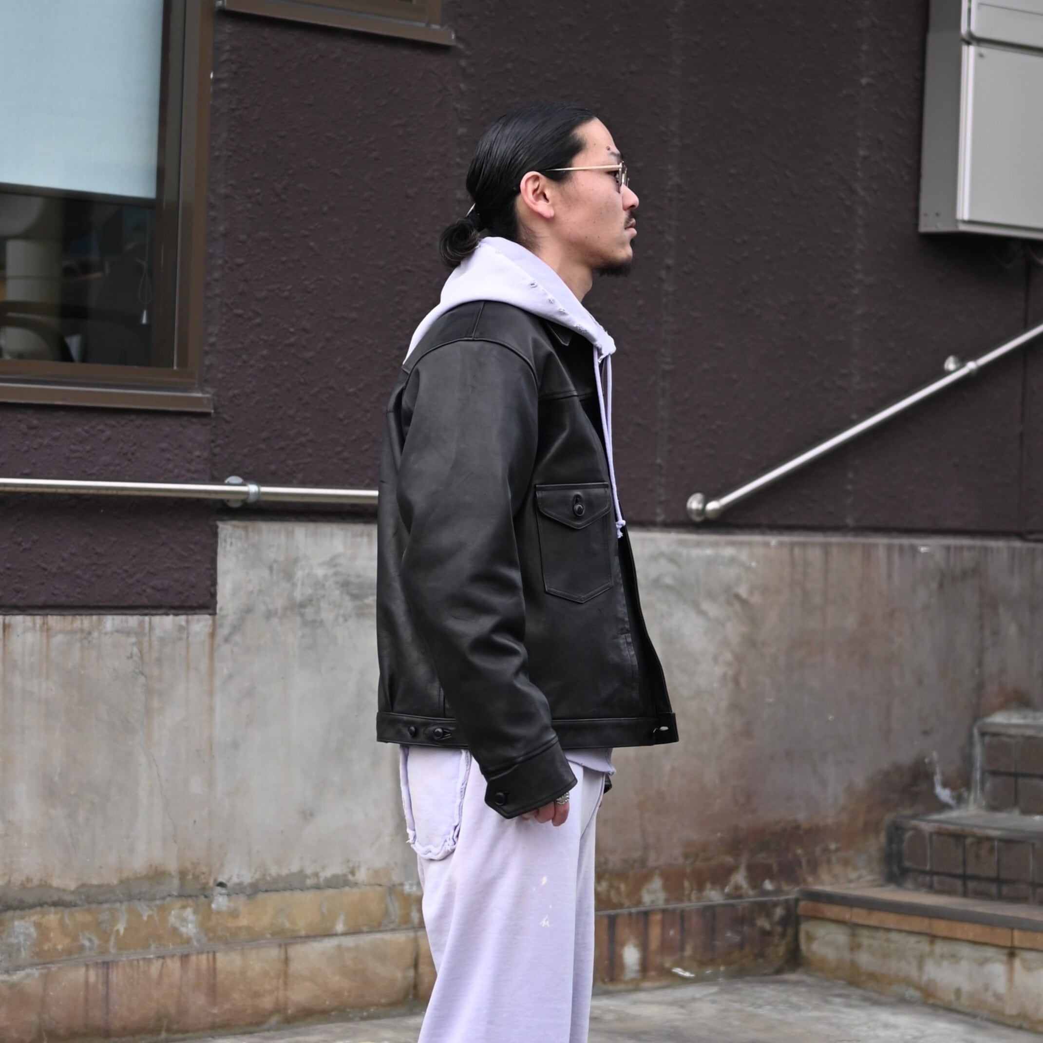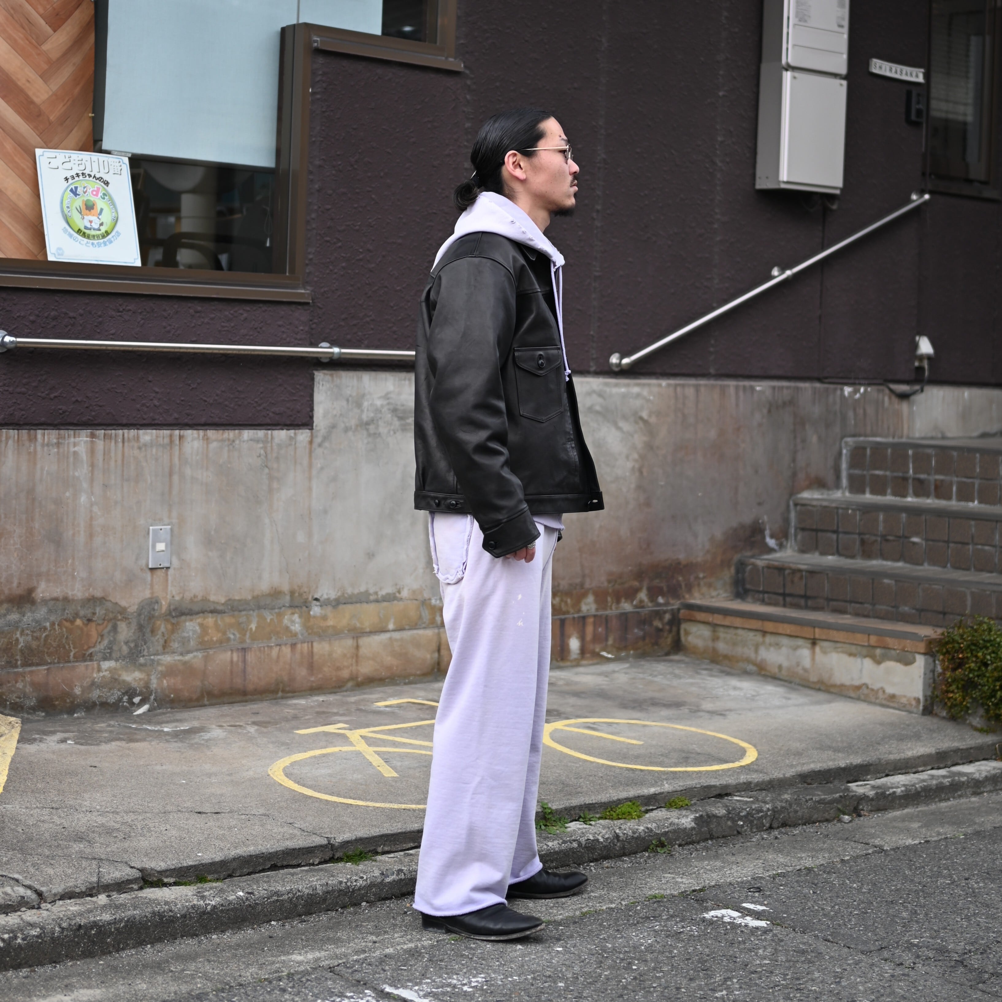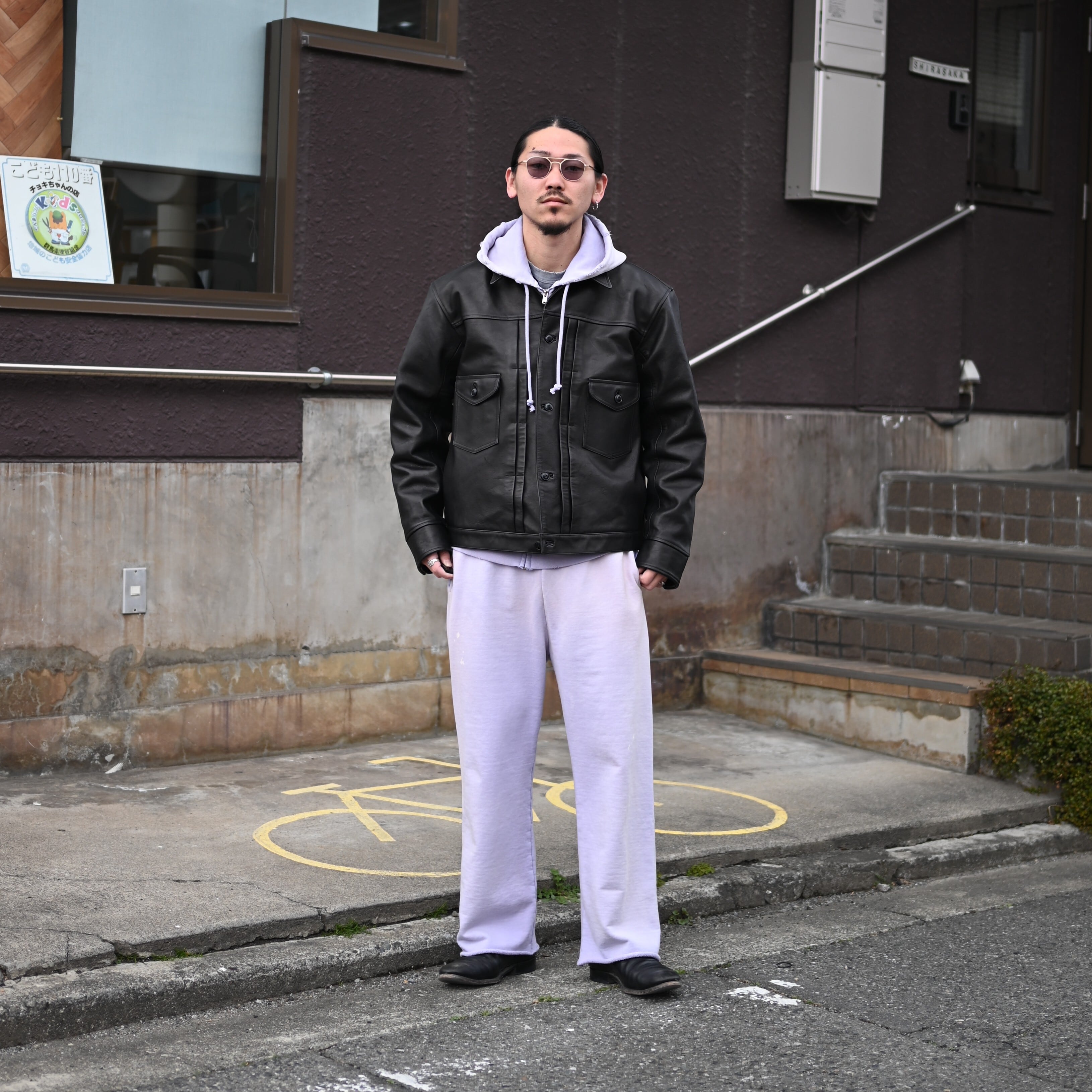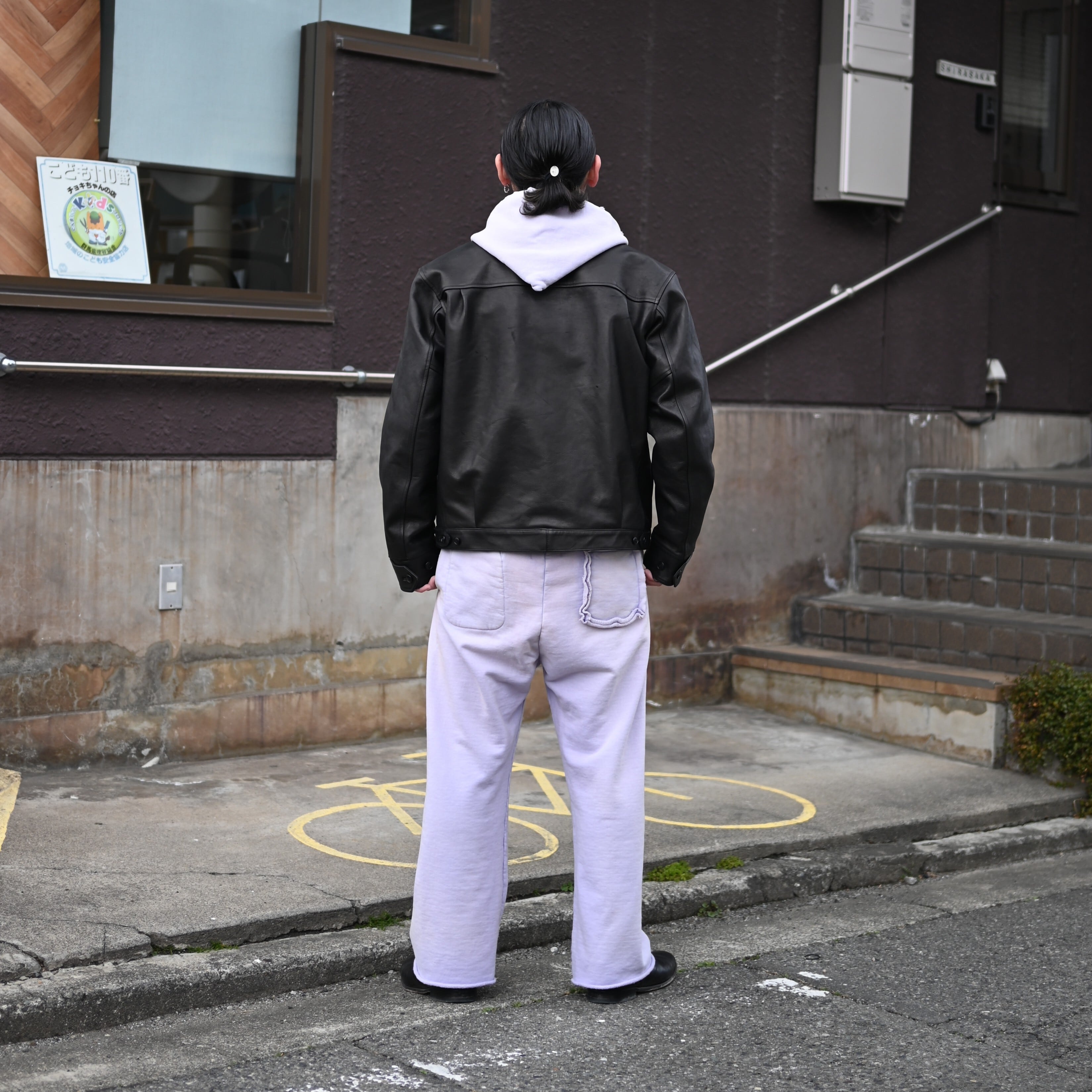 To balance the soft impression of the sweatshirt set, I paired it with the PATINA HORSE-HIDE JEAN JACKET from OLD JOE, which adds structure and sharpness to the overall look.