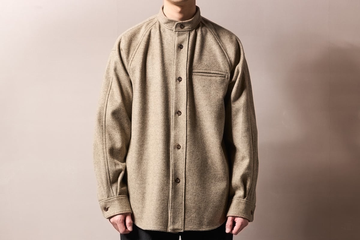 このシャツはネップウールシャギーの生地がとてもよく仕入れました。素材本来のよさが際立つベージュカラーのスタンドカラーシャツ。