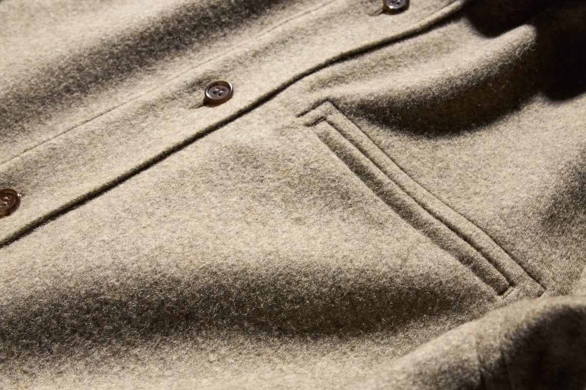 Unlike Yamauchi’s usual worsted wool textiles, this fabric is woven using nep-infused spun yarn, then fulled and brushed to create a shaggy wool texture