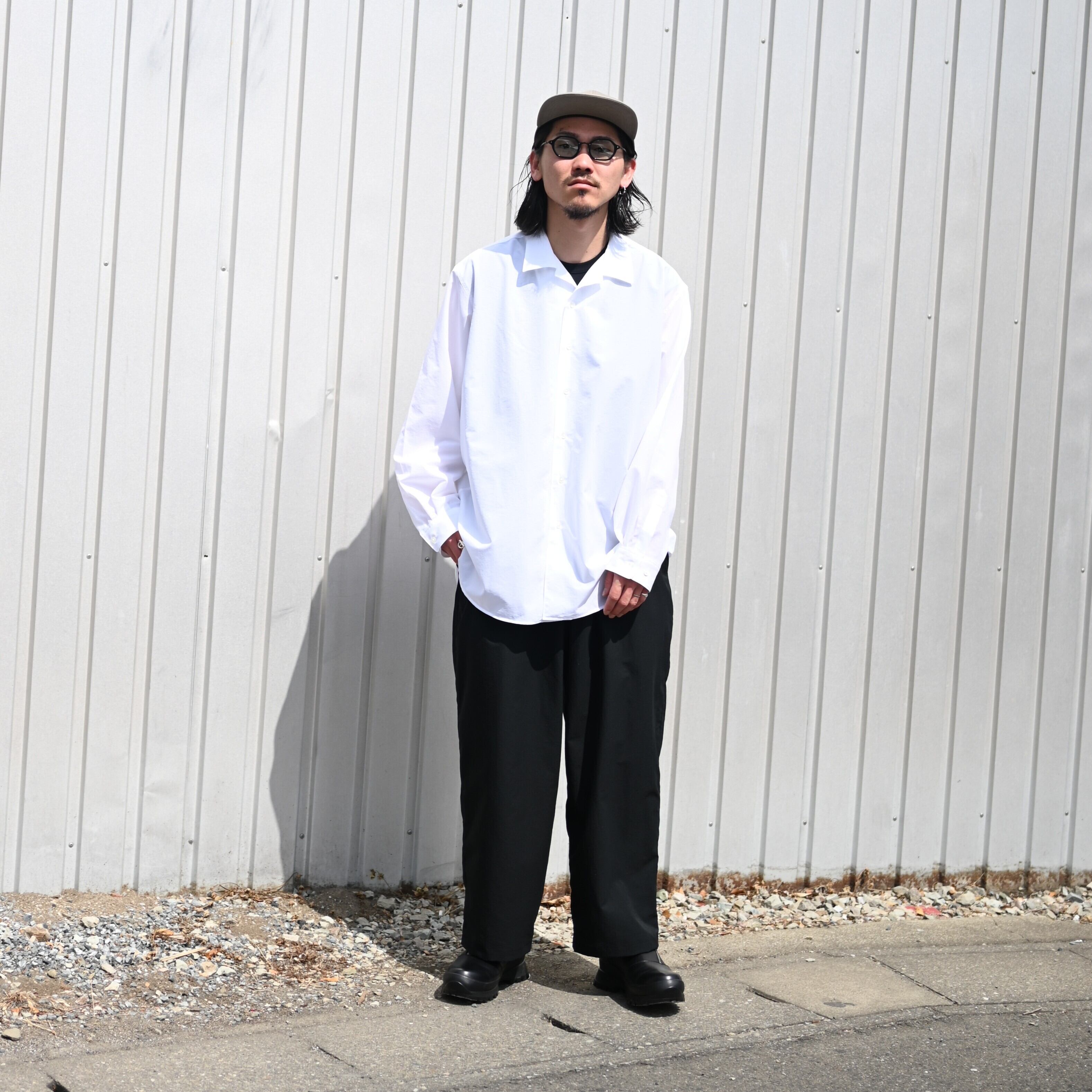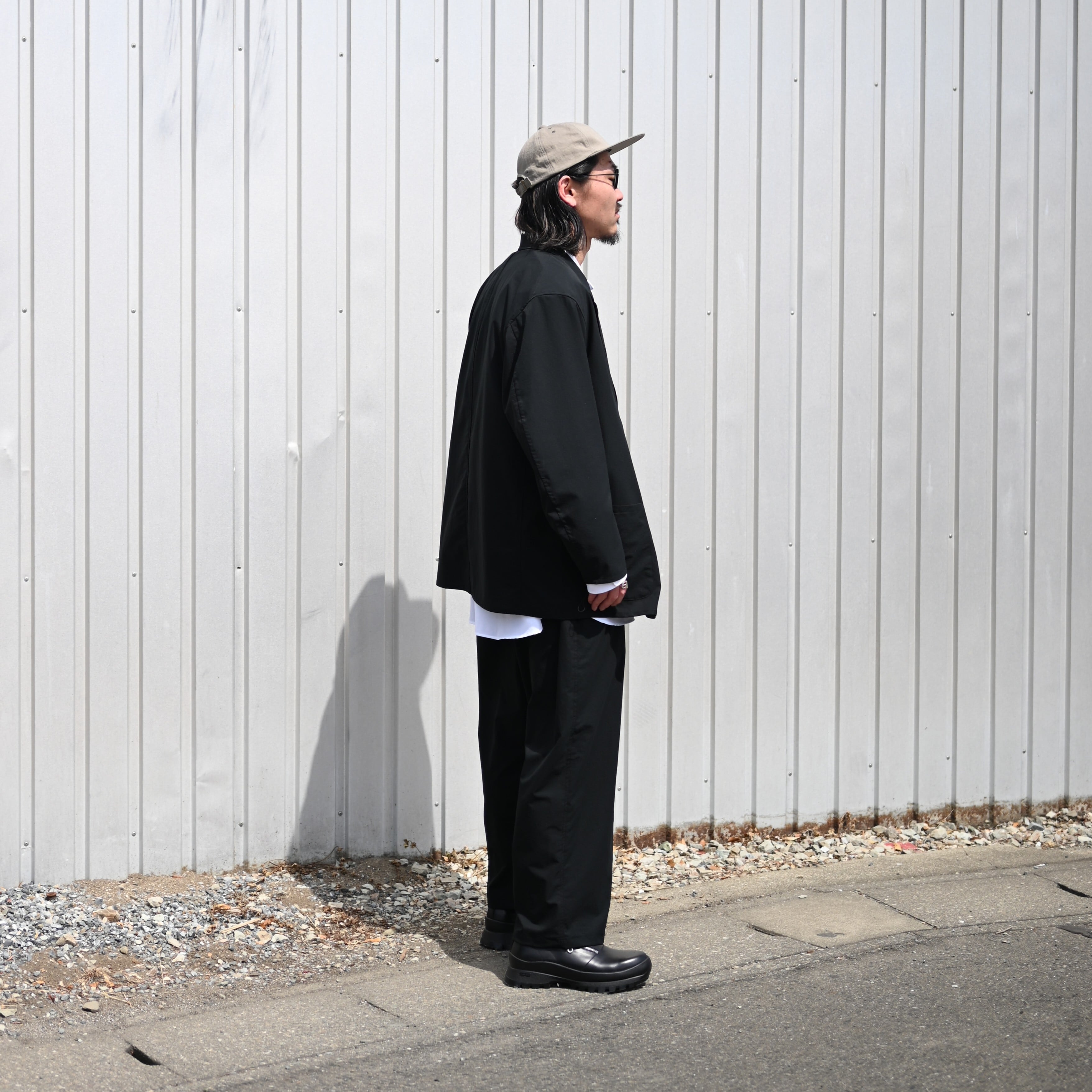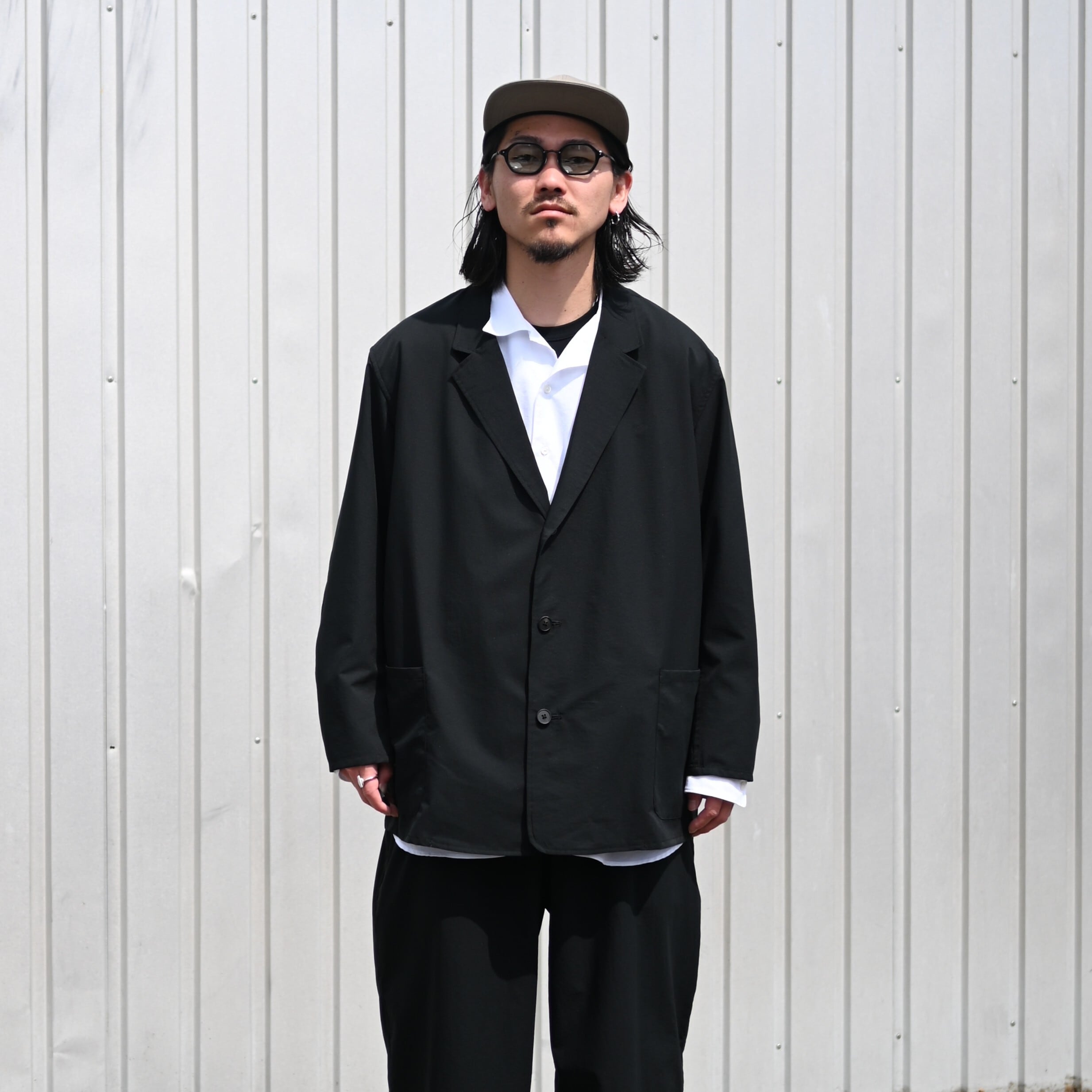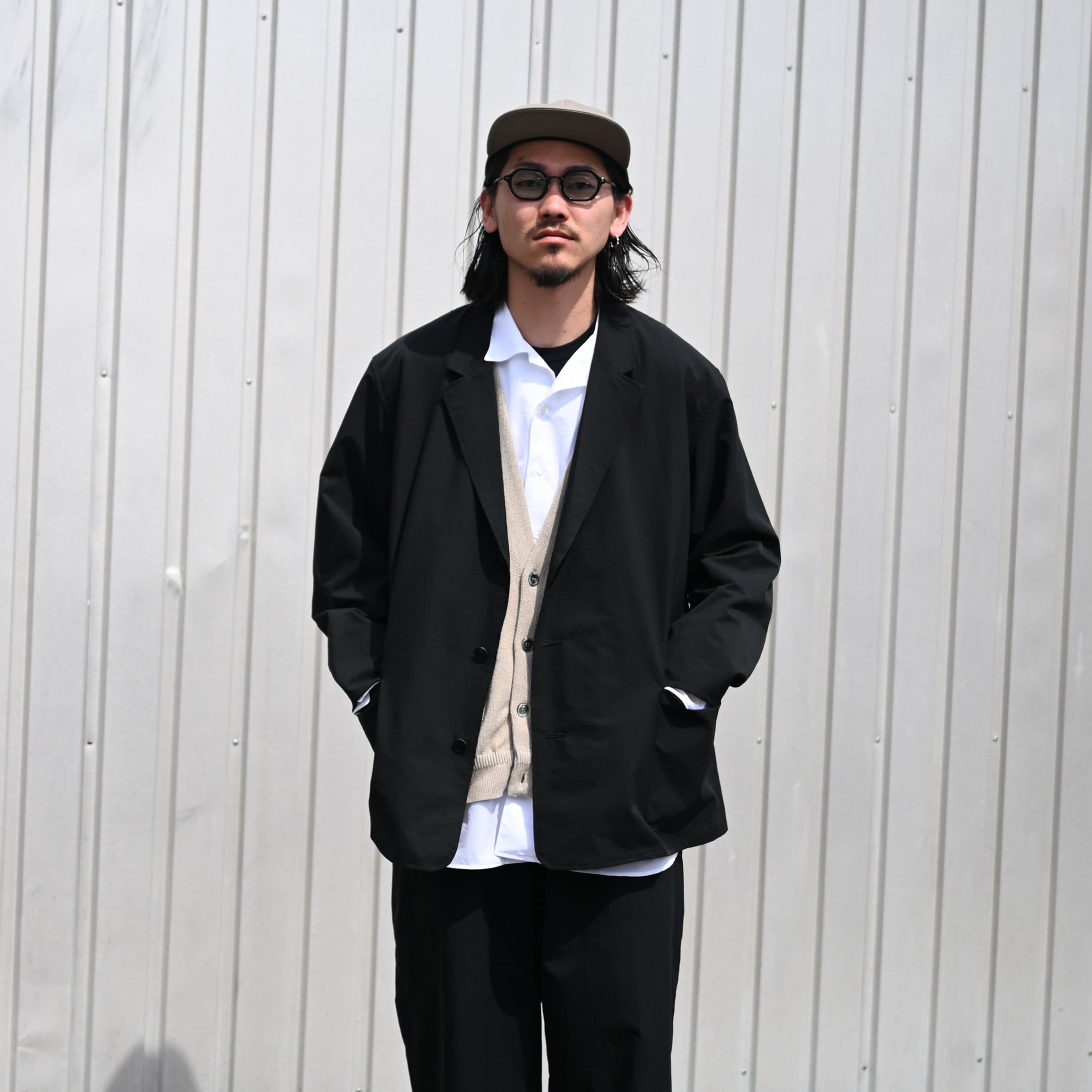 Wearing the newly arrived “ultimate everyday wear” from THE DAY — the QUICK DRY STRETCH setup, consisting of a tailored jacket and easy slacks. The inner open-collar shirt is also a new piece from THE DAY.