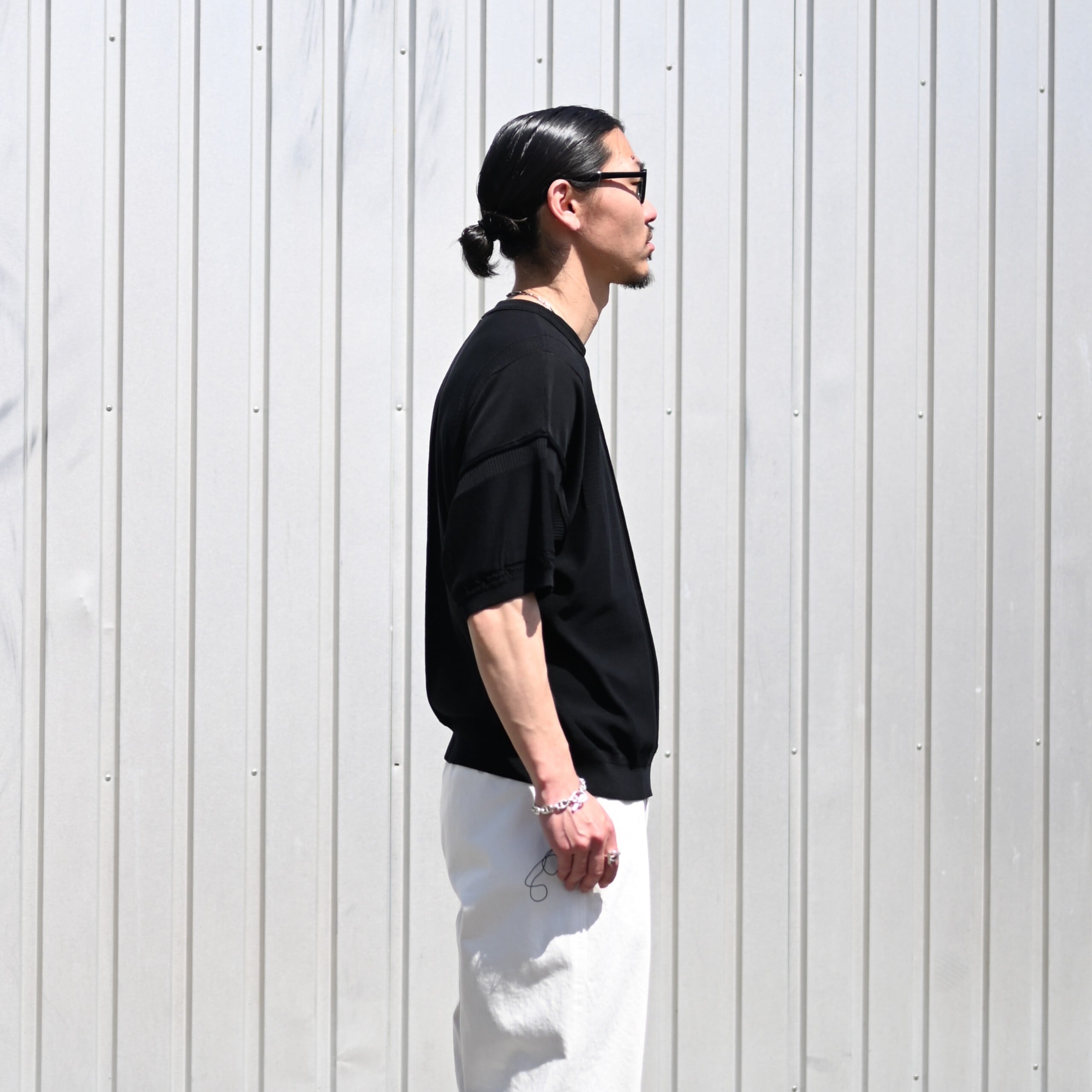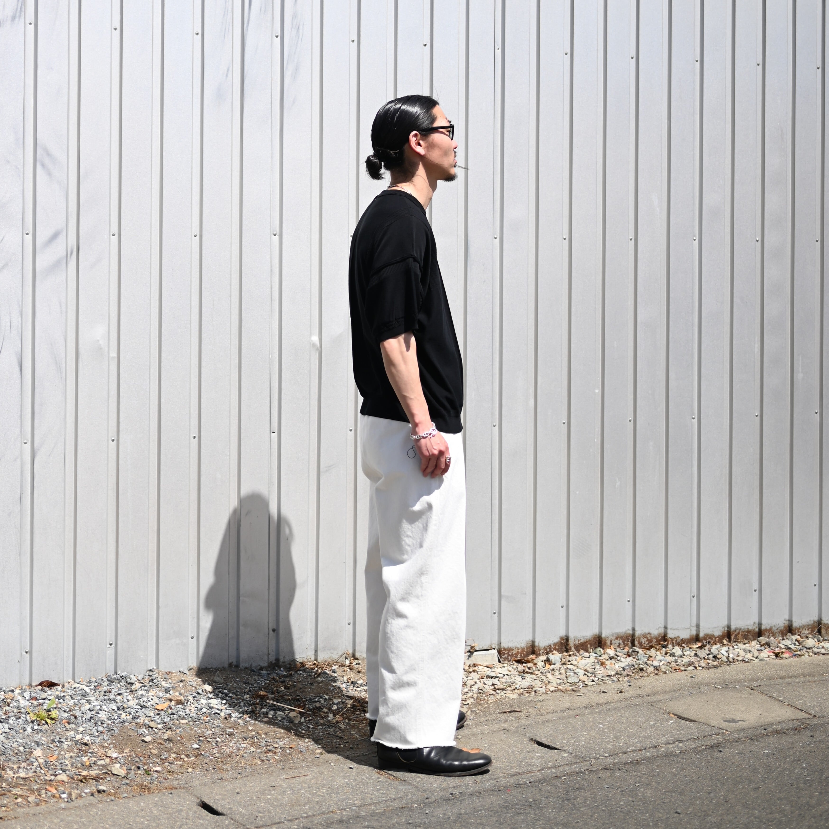 インナーにはYASHIKI(ヤシキ)新作のMebuki S/S Knitを合わせ、SAYATOMO(サヤトモ)の 2-Tack Cutoff Wide Denim Pantsを着用しました。