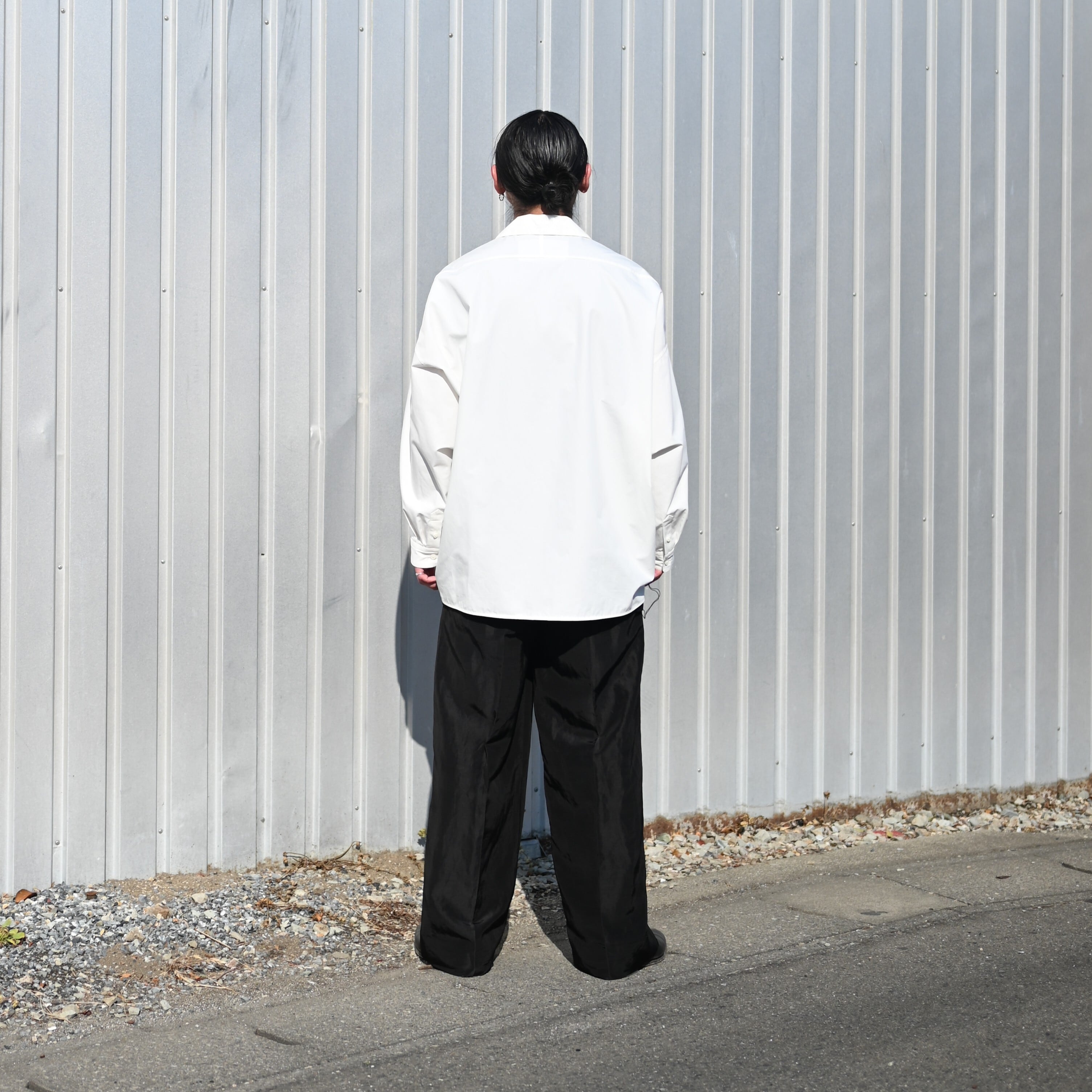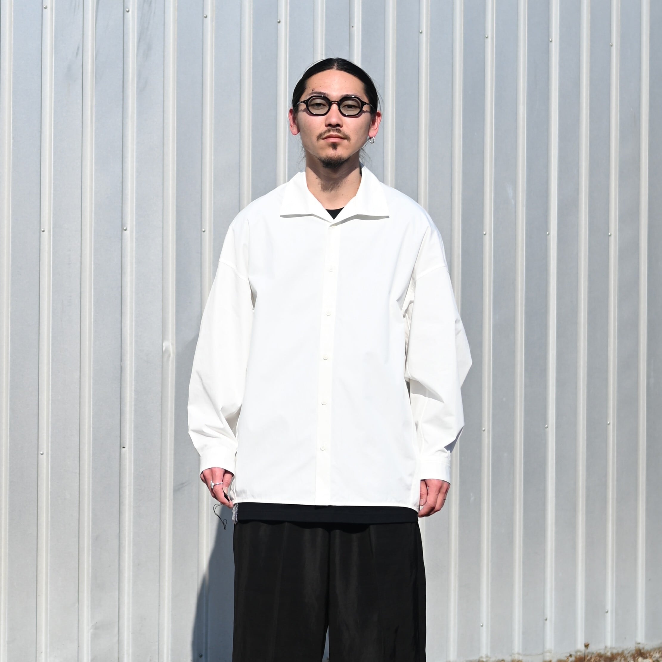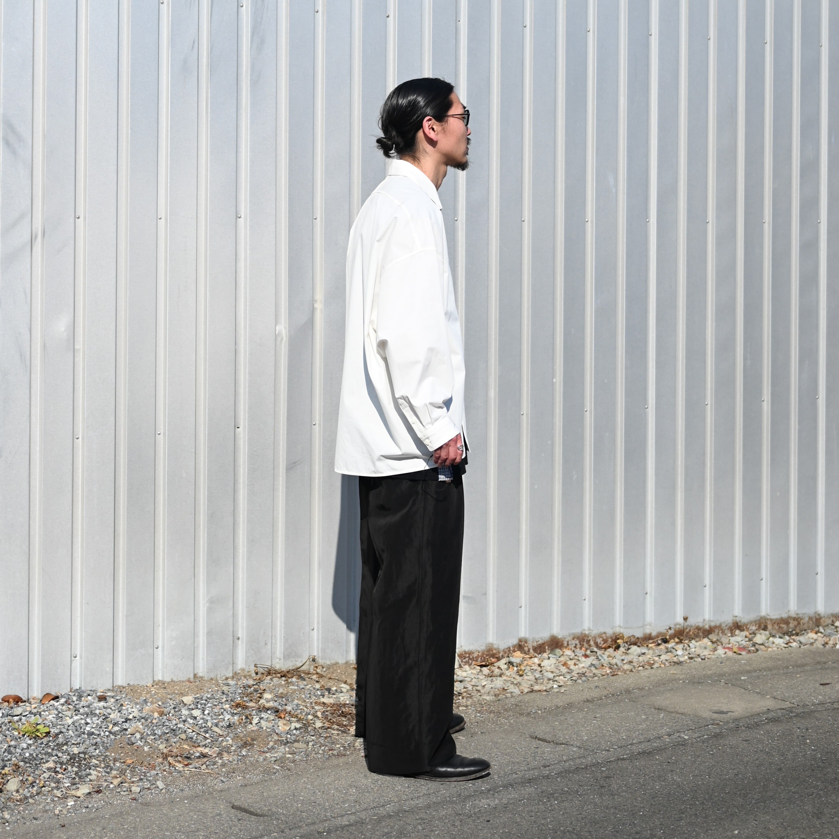 Styled around the Draping Open Collar Shirt Type A by Nonnotte. The designer himself has worn this shirt for five years, yet the fabric still retains its strength—truly a testament to its exceptional quality and durability.