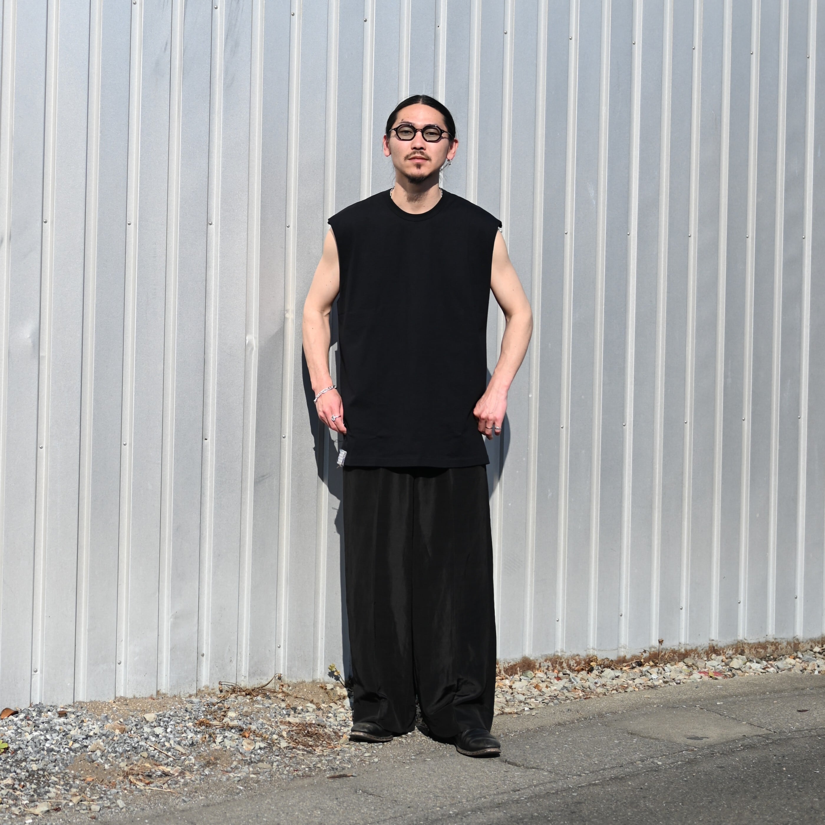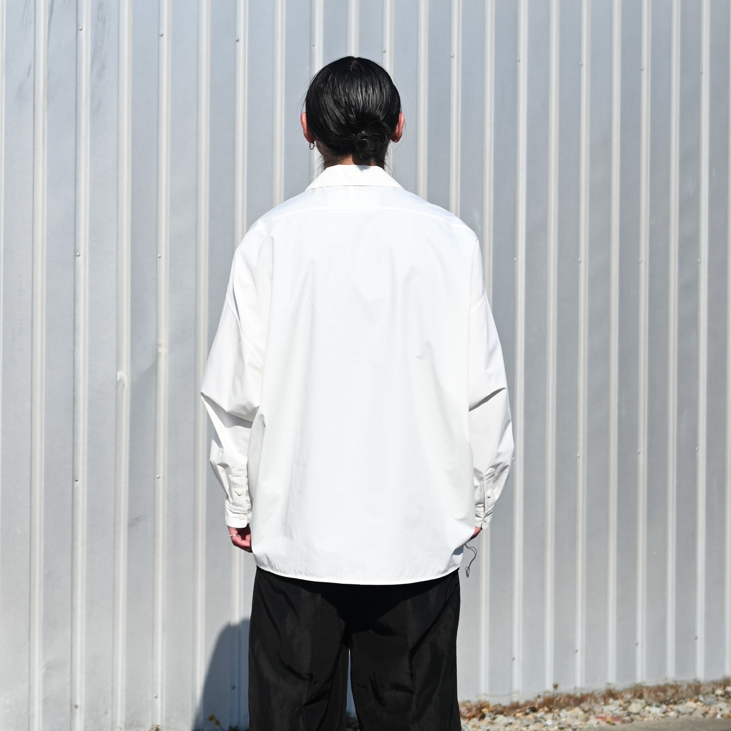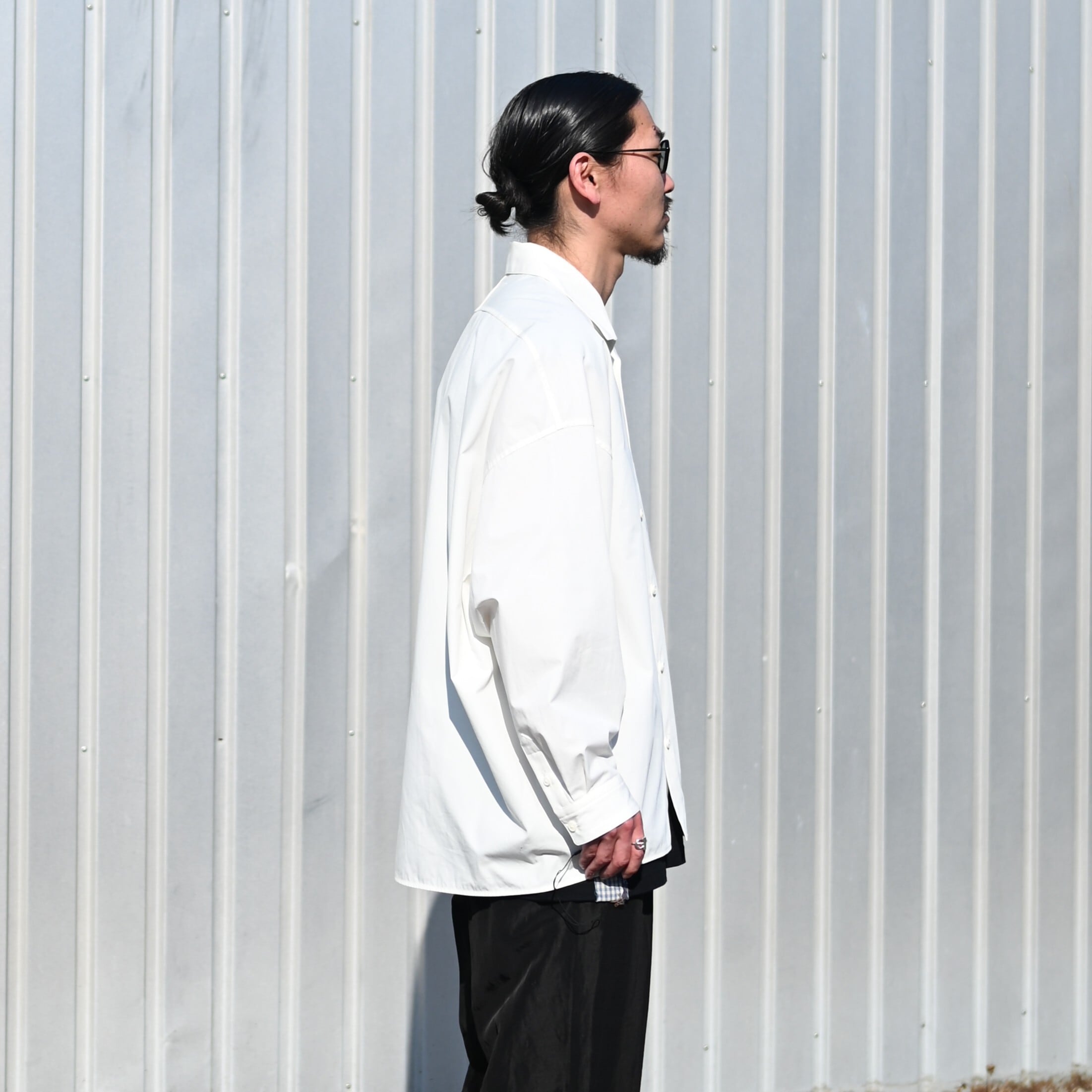 Styled around the Draping Open Collar Shirt Type A by Nonnotte. The designer himself has worn this shirt for five years, yet the fabric still retains its strength—truly a testament to its exceptional quality and durability.