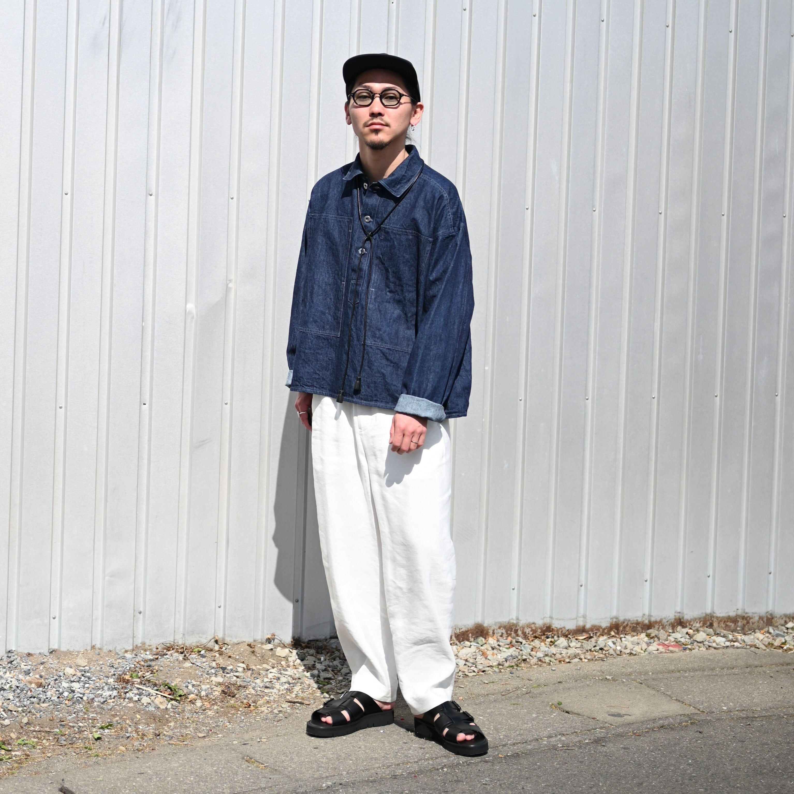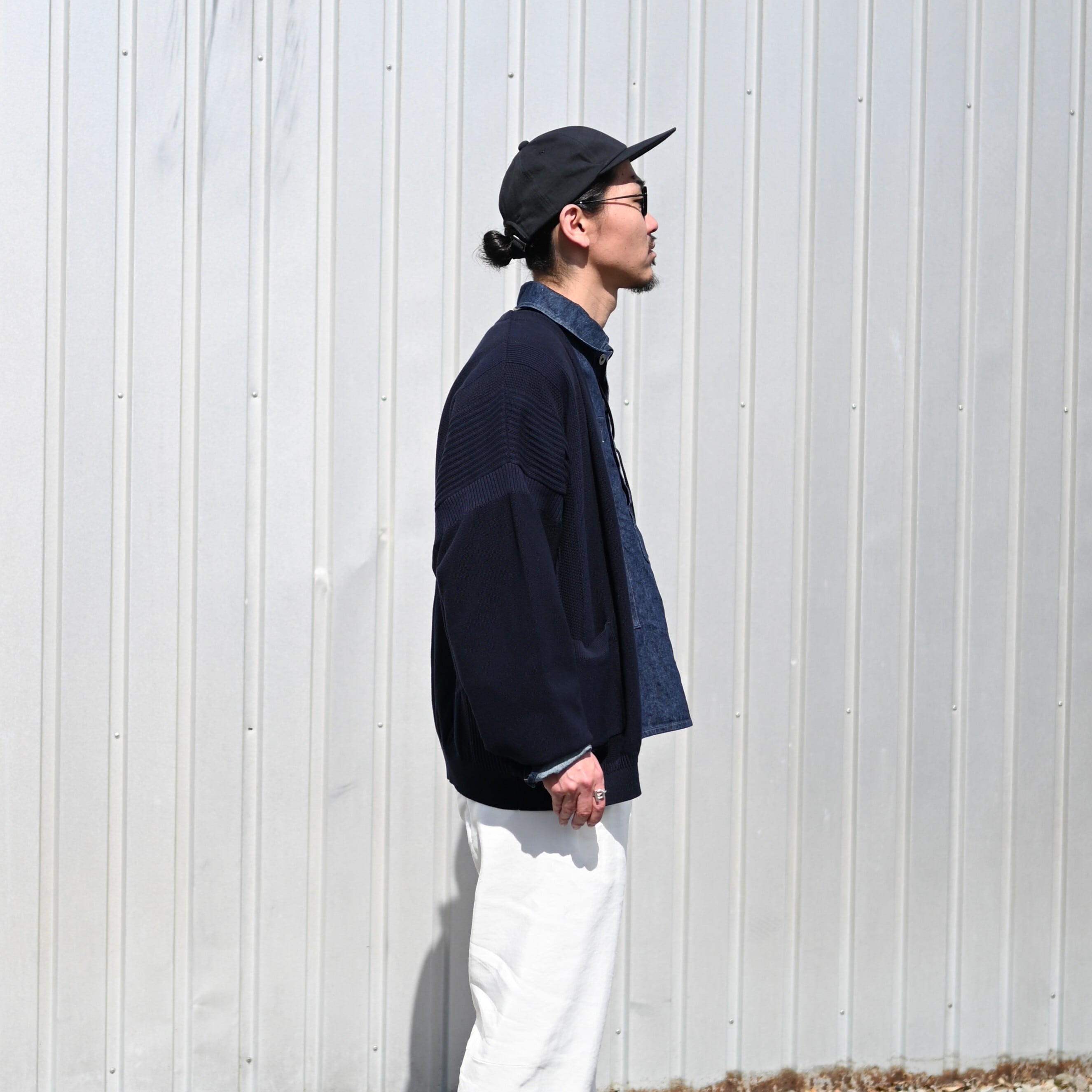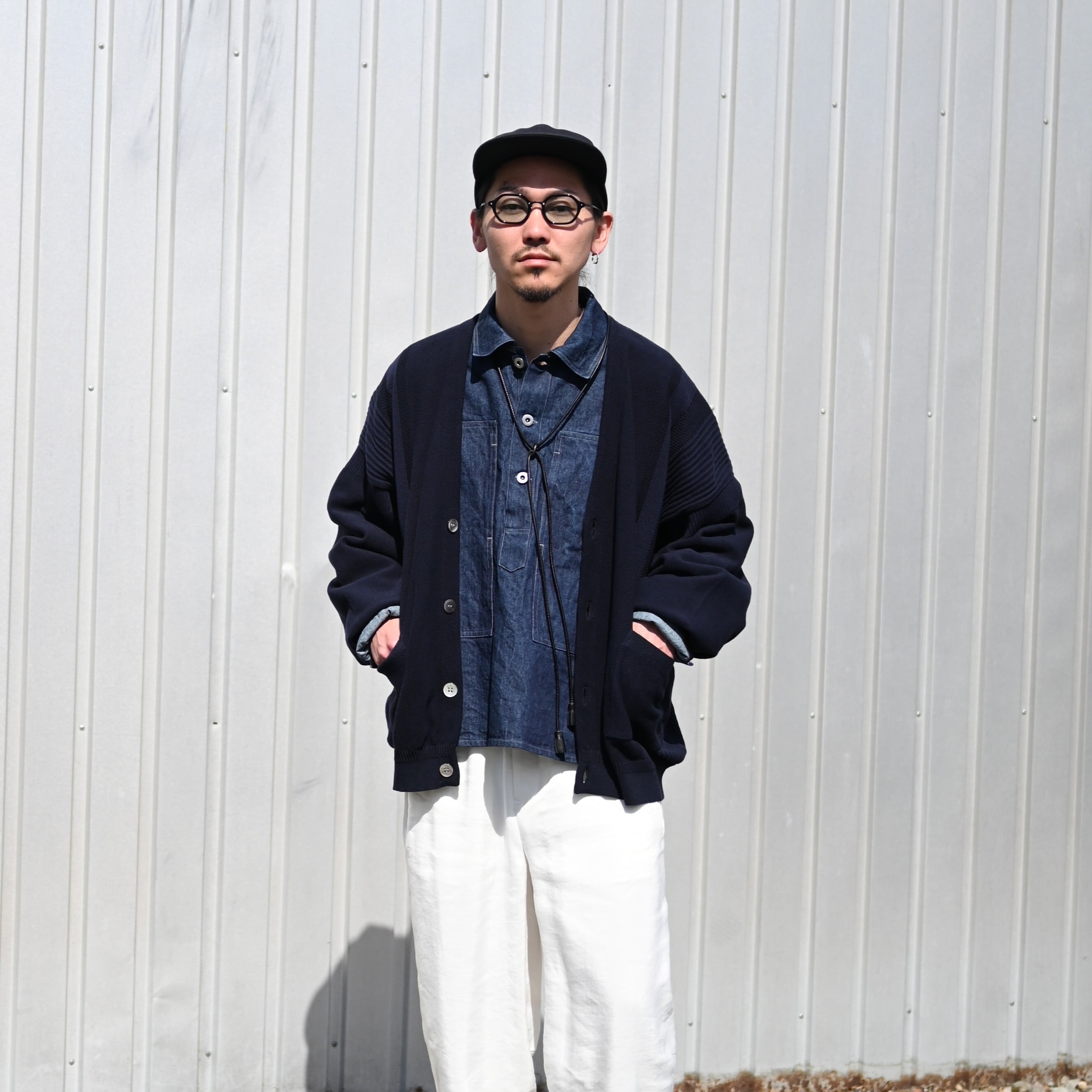 YASHIKI(ヤシキ)のShunko Cardiganネイビー、インテリム 9.3oz HEMP ORGANIC DENIM HYPER BIG SINGLE NEEDLE US ARMY PULLOVER JACKETをメインにコーディネート。