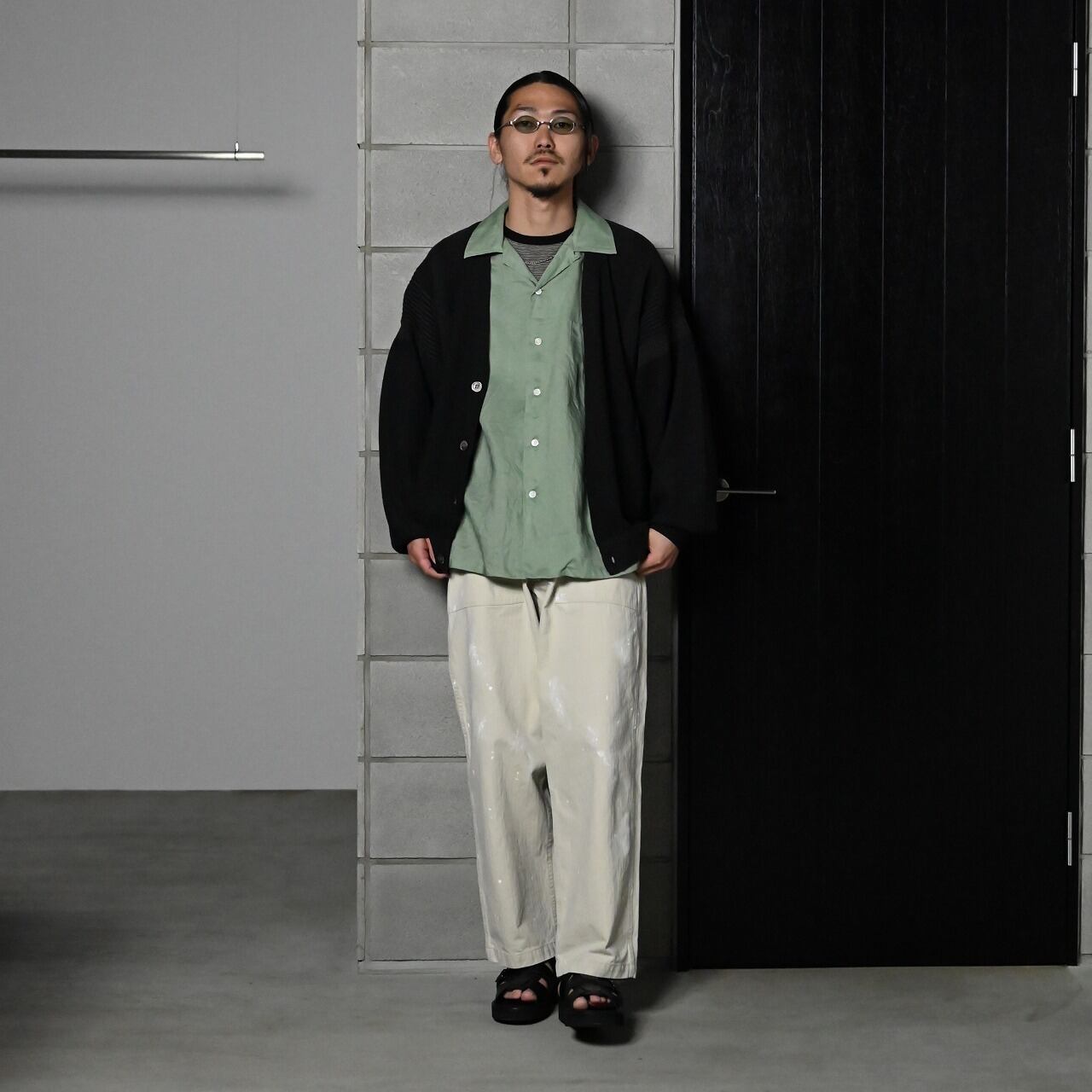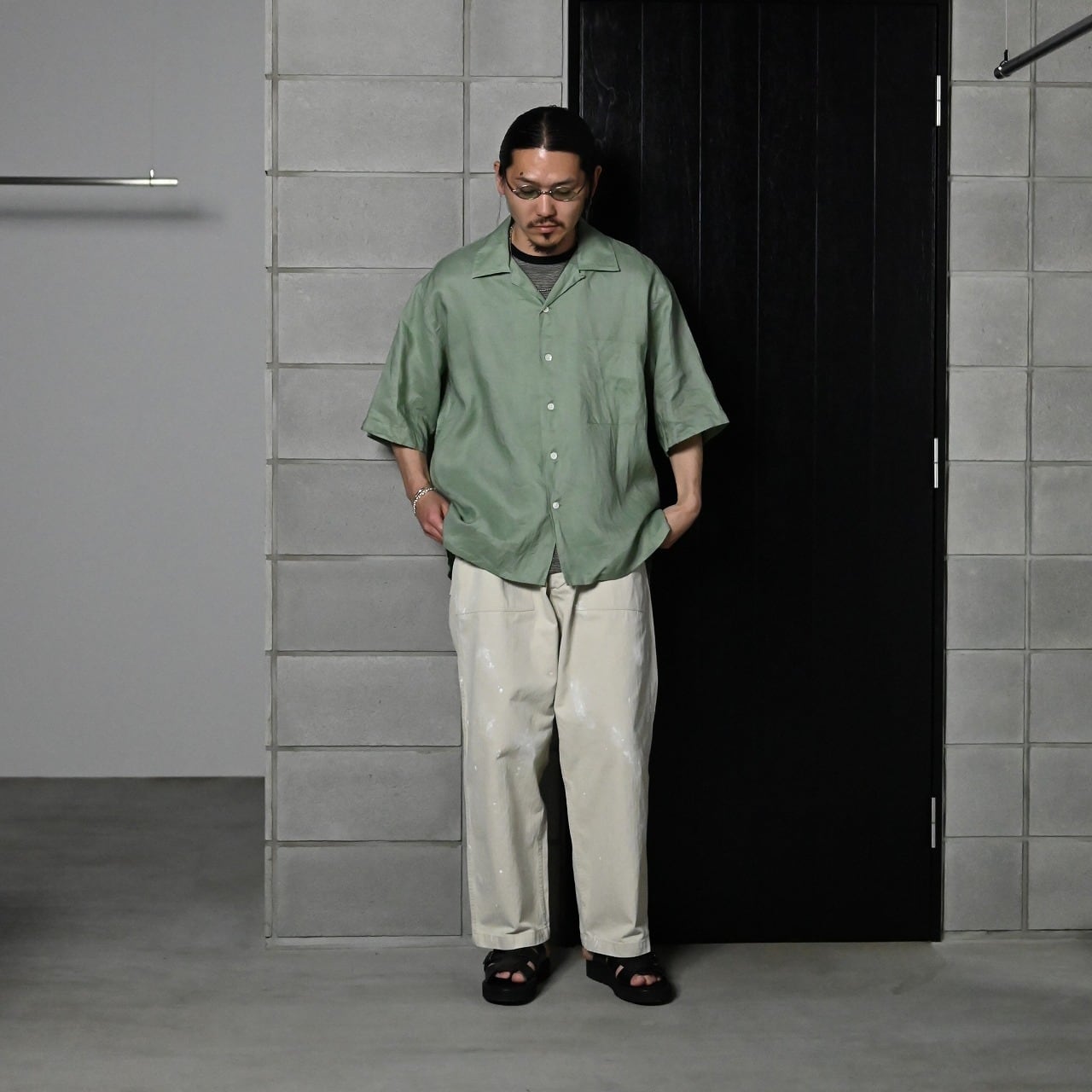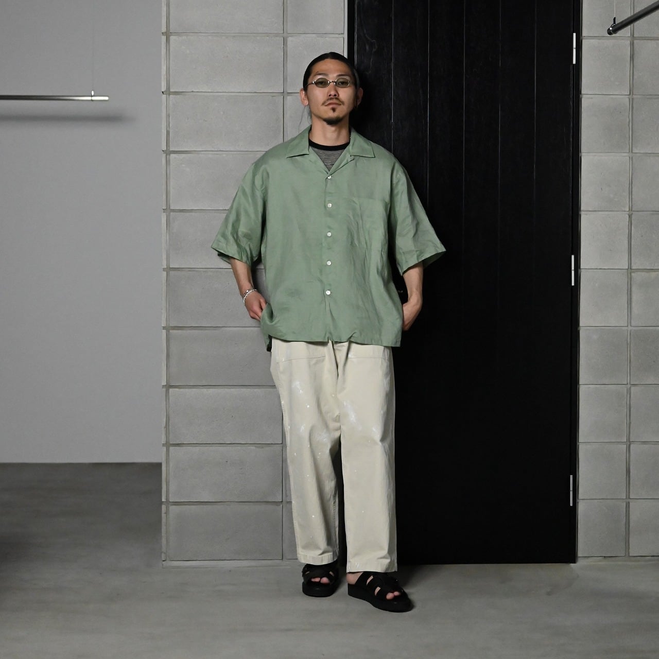 今シーズン待ちに待っていたインテリムのミルクウォッシュペイントが施されたヘリンボーン生地のベイカーパンツ。アイボリーを着用しており、合わせにミントカラーが魅力的なラミー100%の半袖シャツを合わせてます。