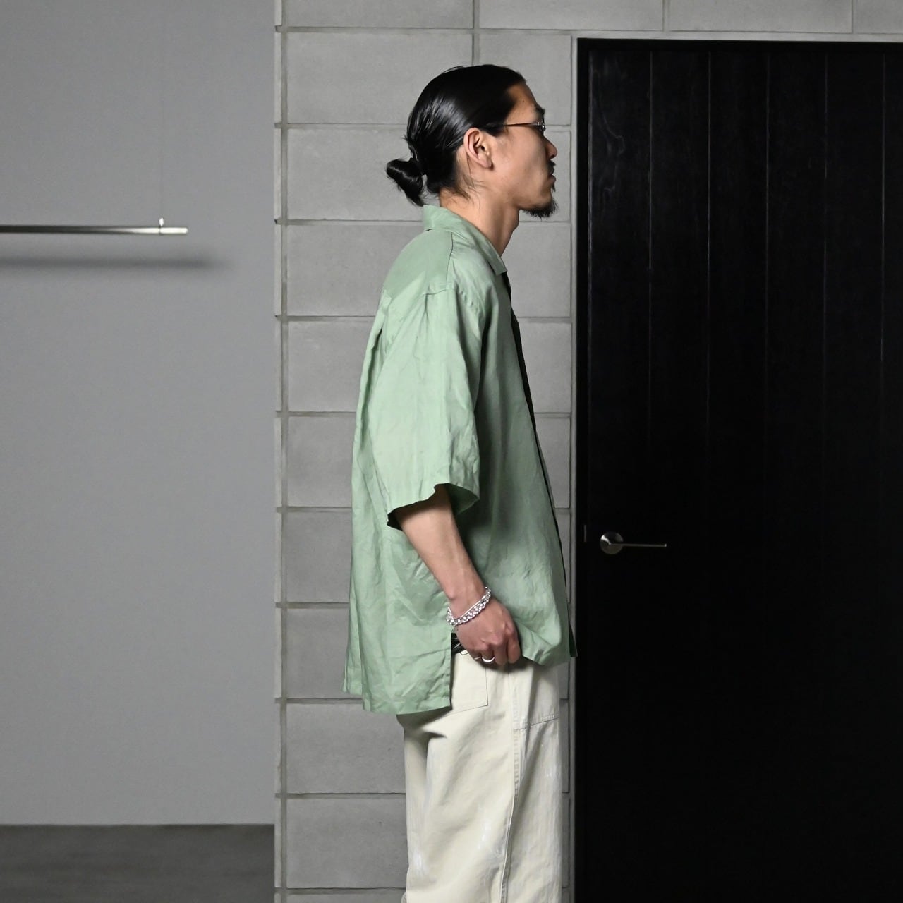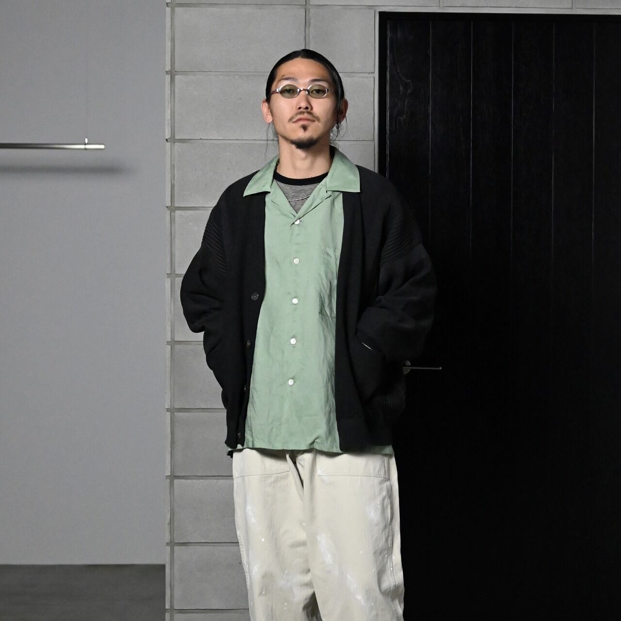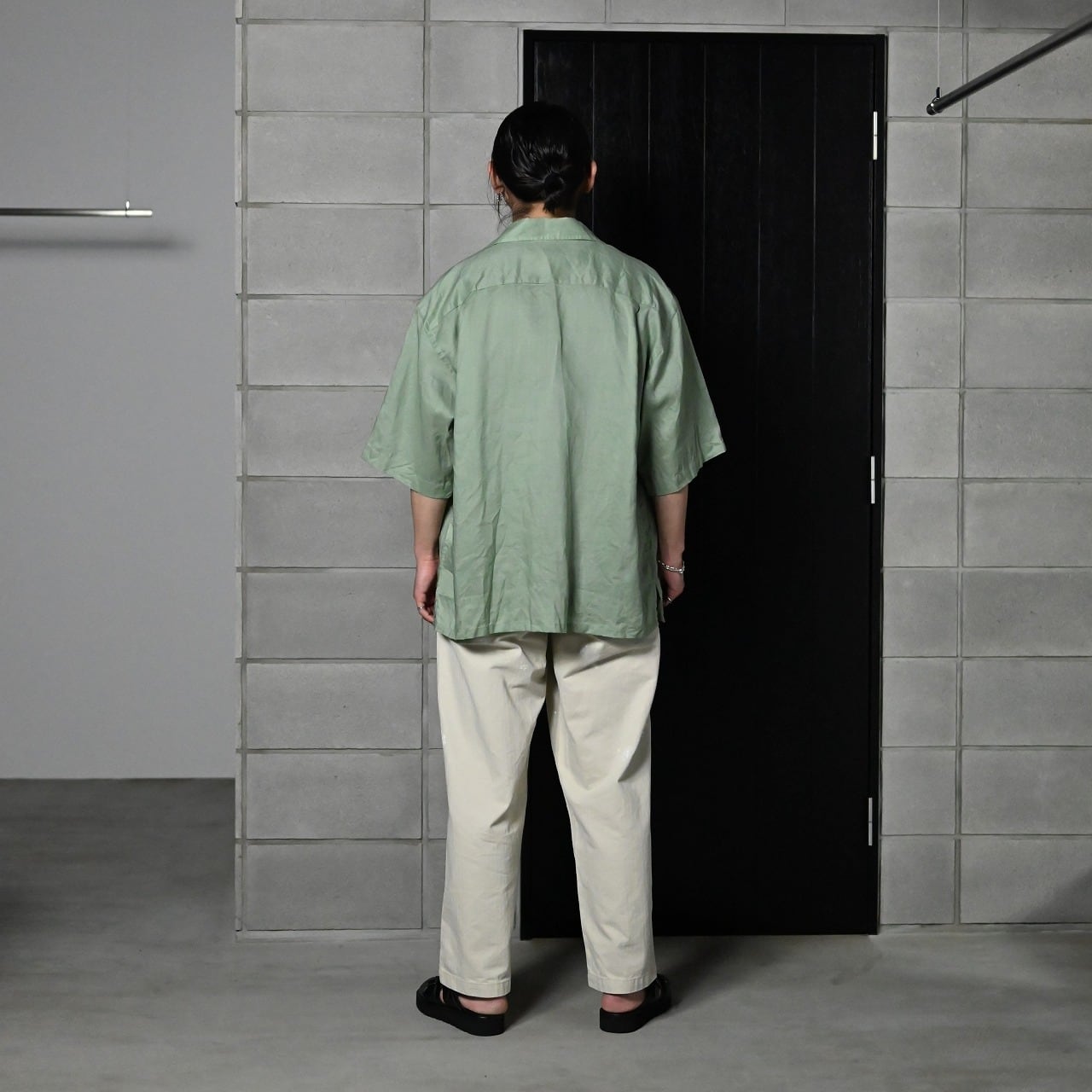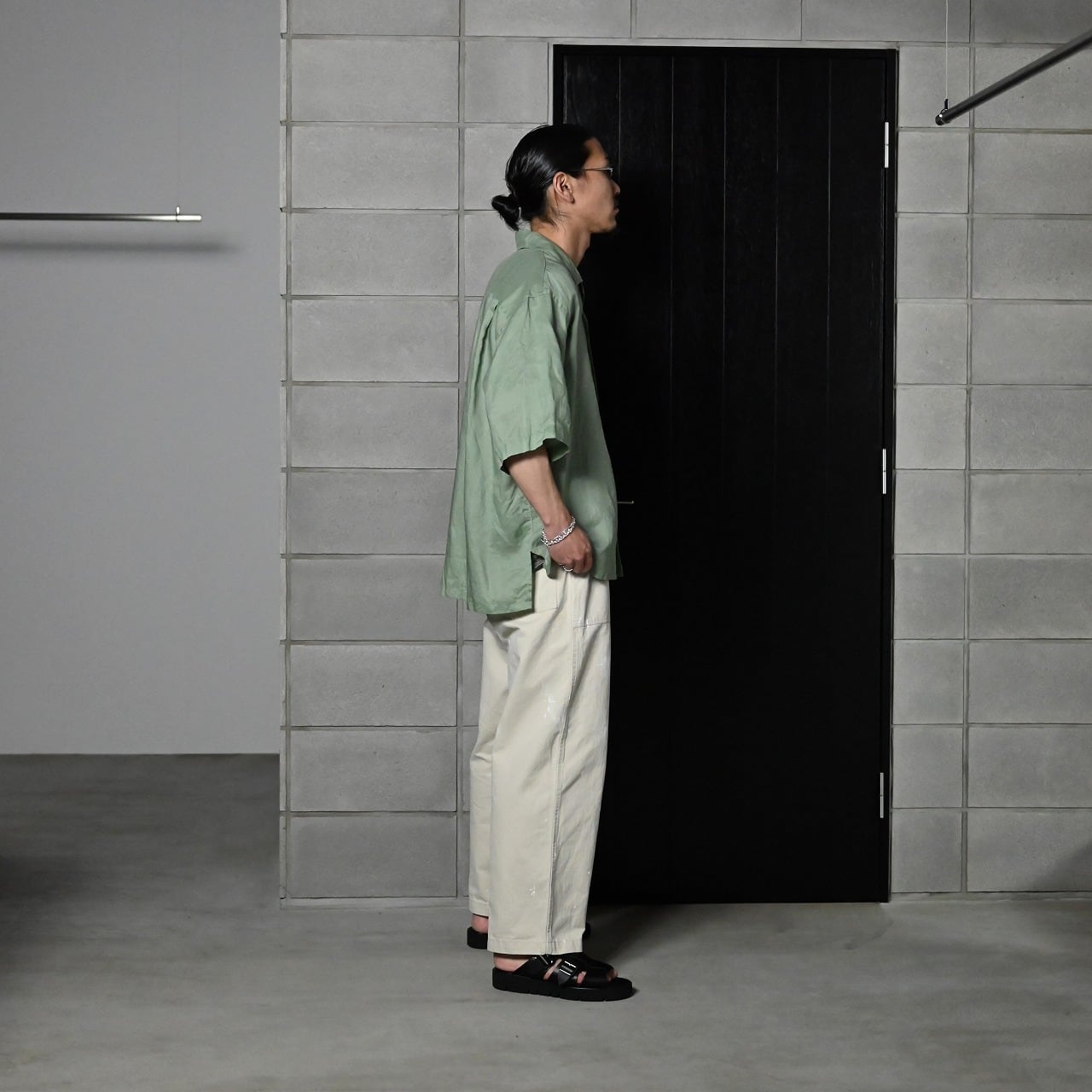 今シーズン待ちに待っていたインテリムのミルクウォッシュペイントが施されたヘリンボーン生地のベイカーパンツ。アイボリーを着用しており、合わせにミントカラーが魅力的なラミー100%の半袖シャツを合わせてます。