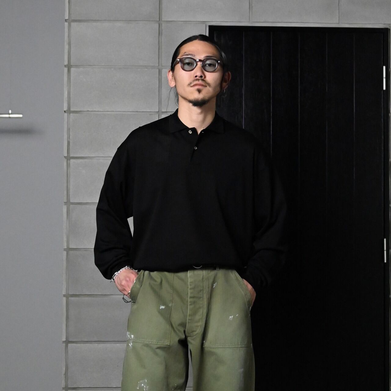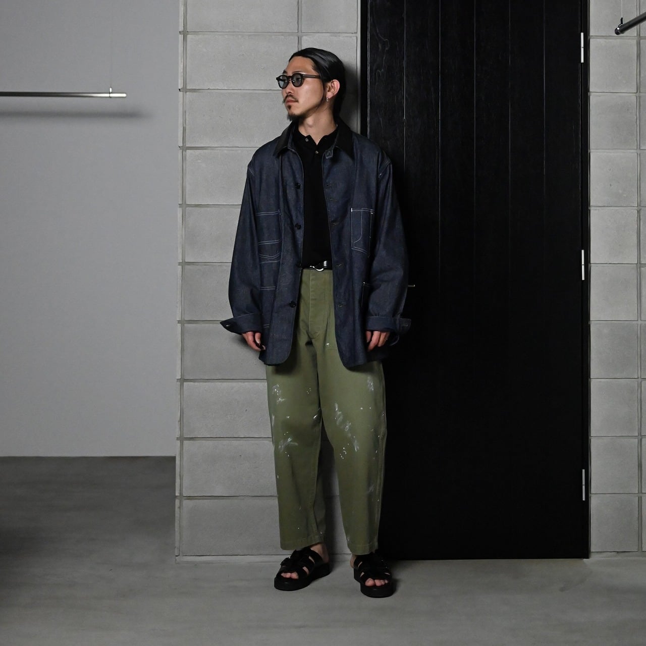 INTERIM(インテリム)襟レザーカバーオール、ミルクウォッシュペイントベイカーパンツコーディネート