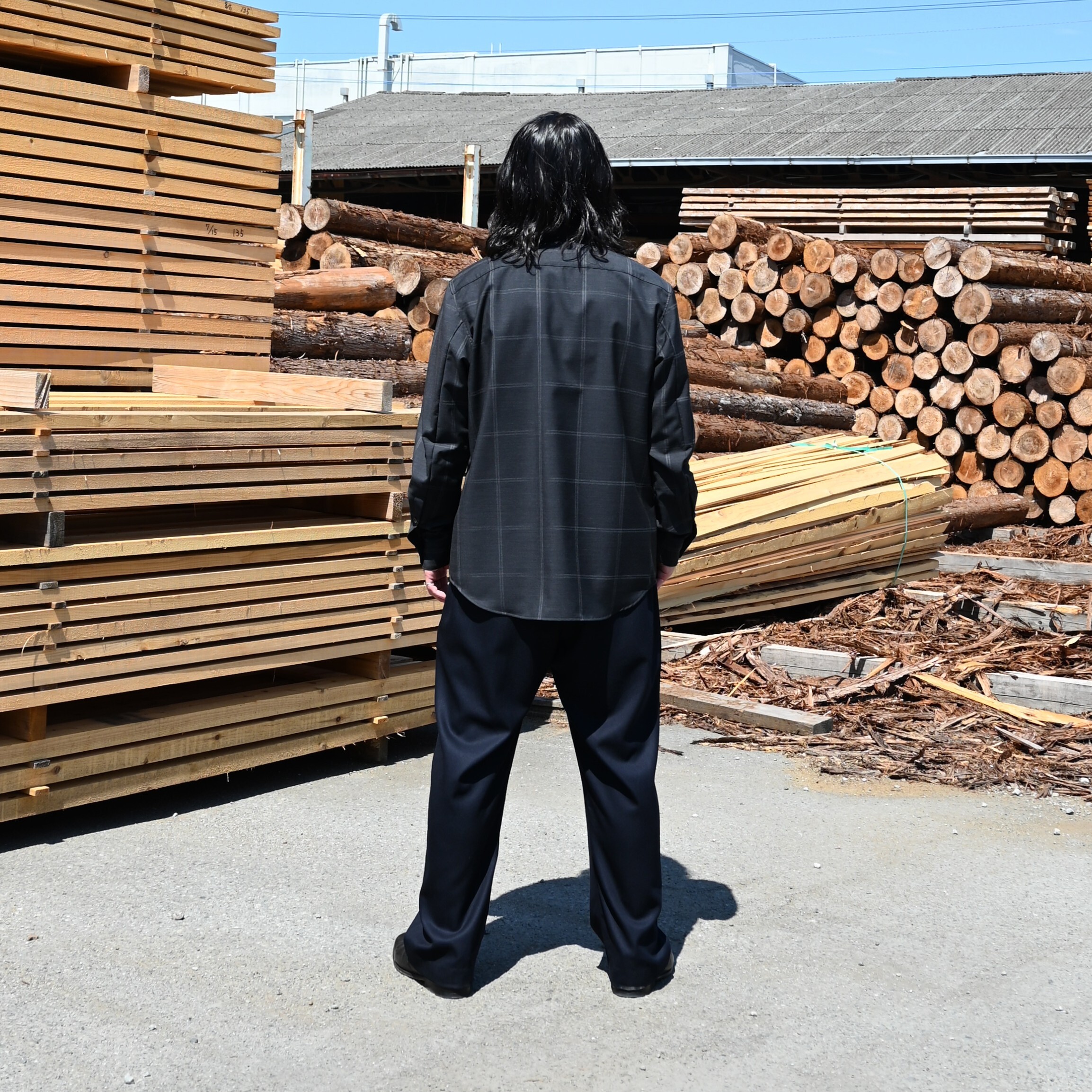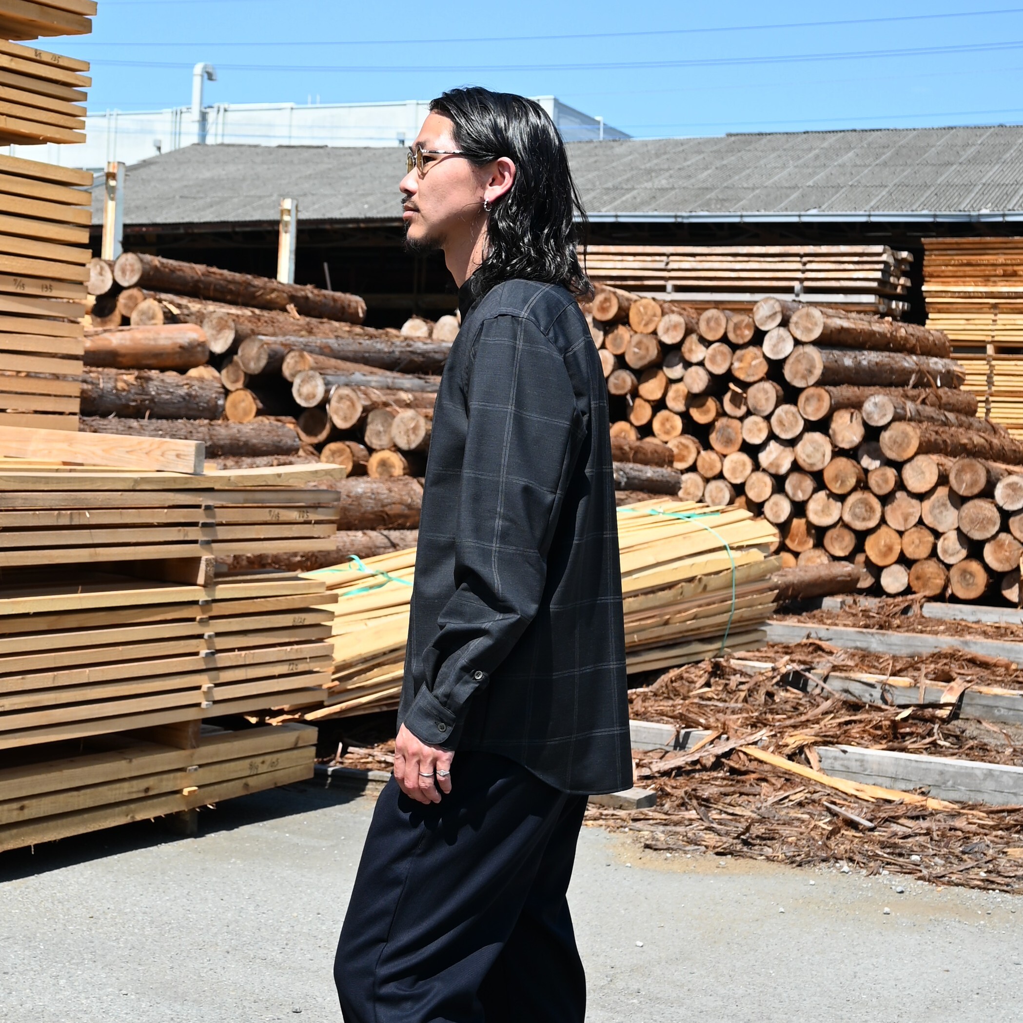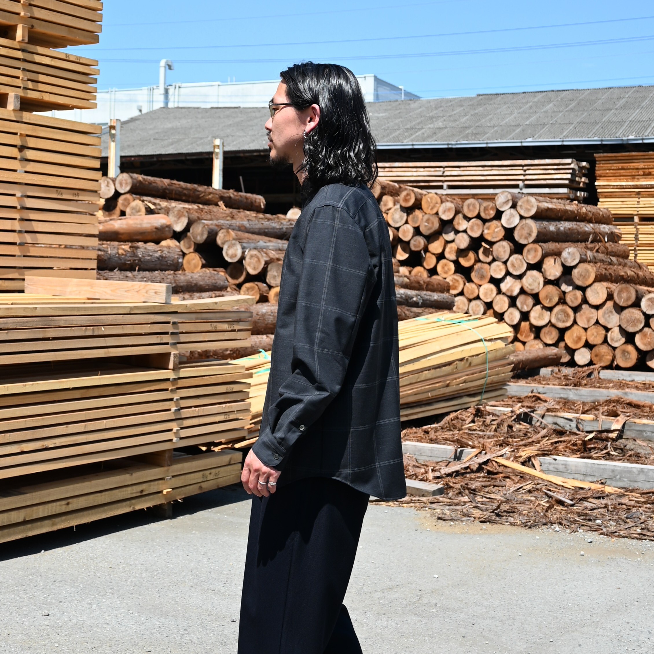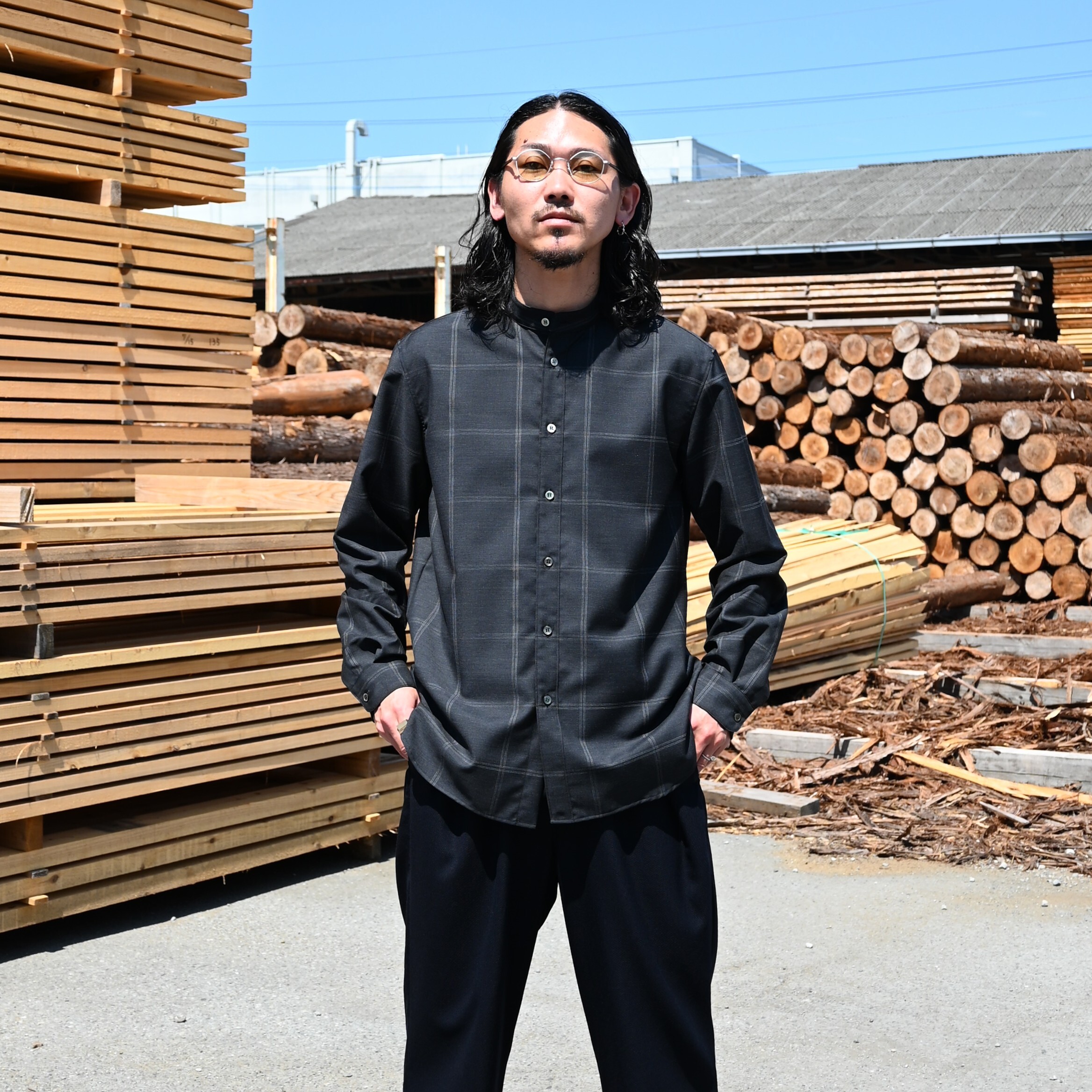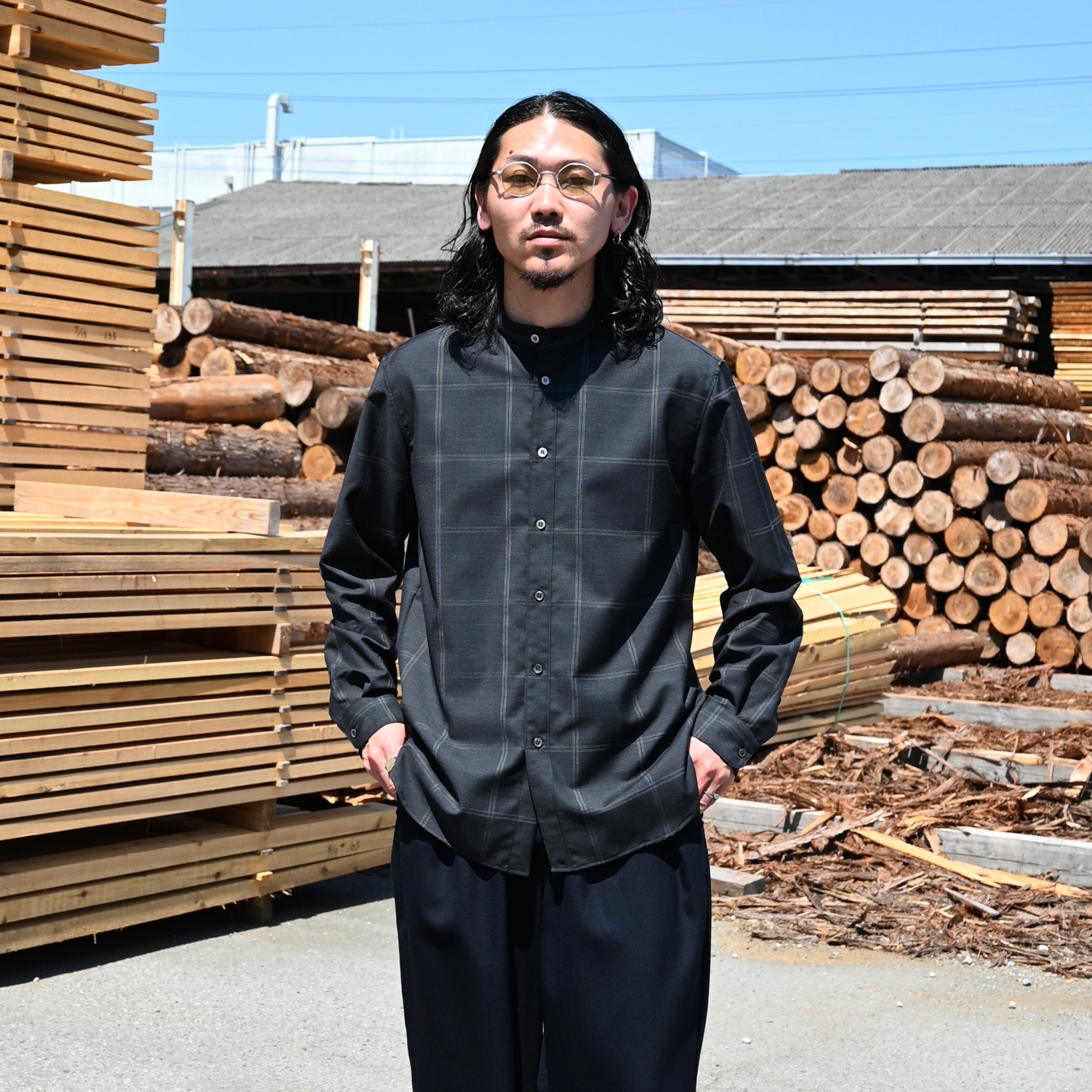 山内 / ノーミュールシングウール・ビッグウィンドウペンシャツ スタンドカラー