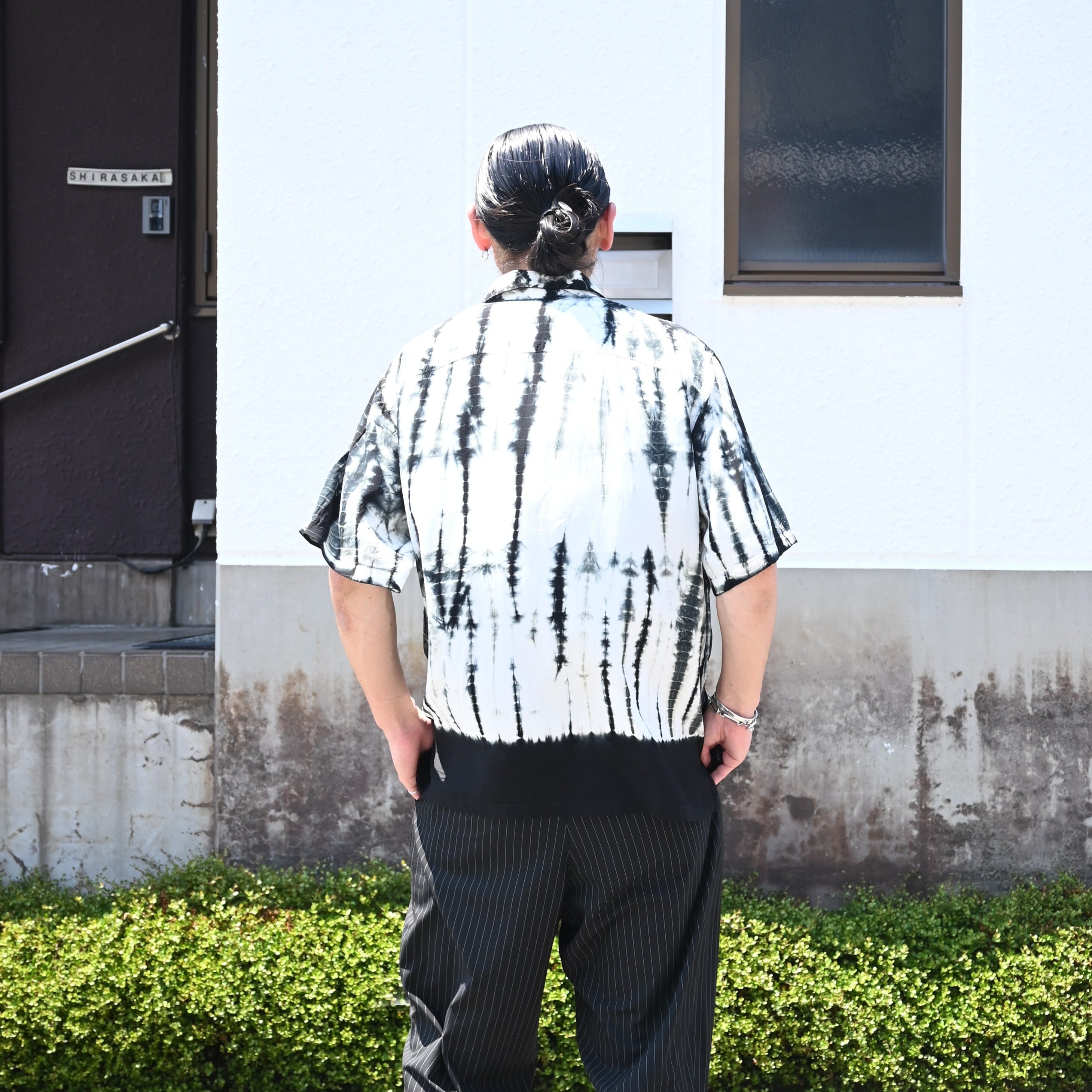 ・有松絞りによる柄が印象的なオープンカラーシャツ