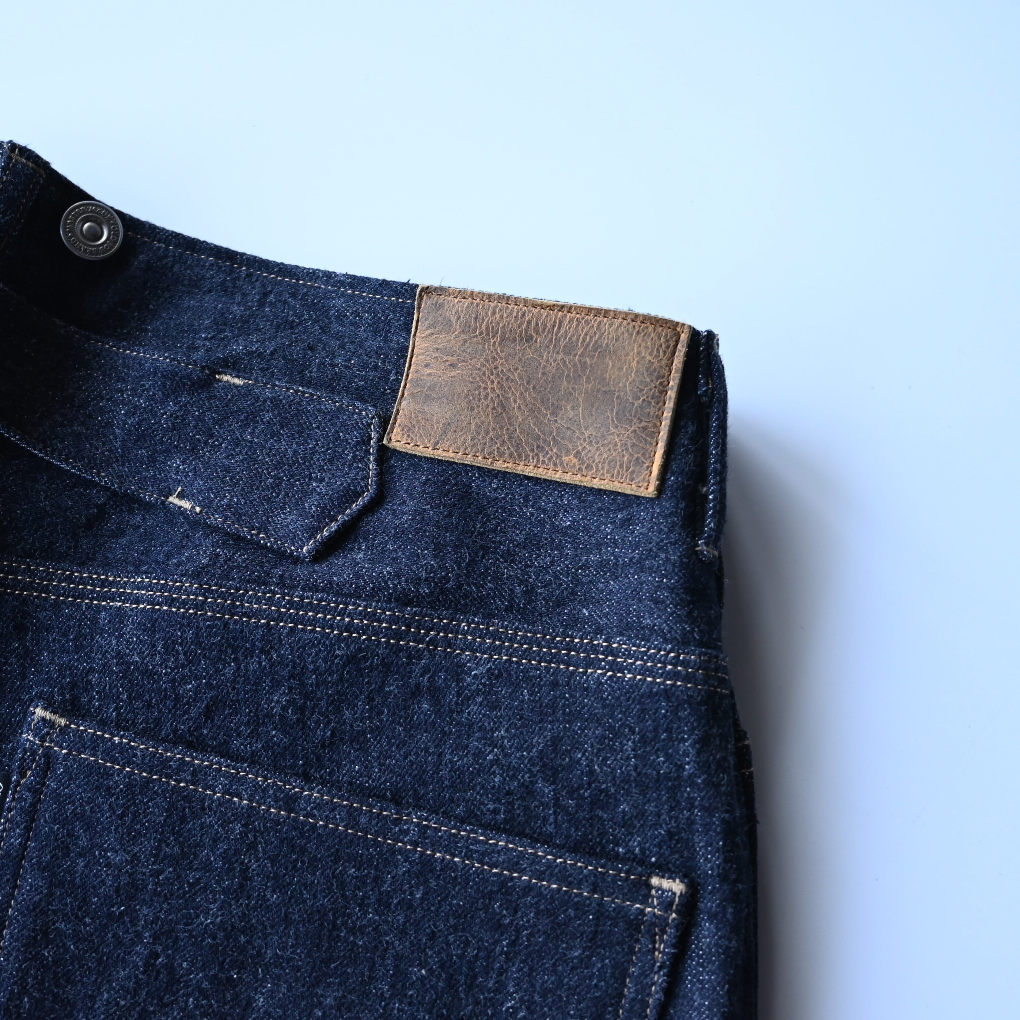 ・三本針ステッチ、四角いホームベース型ポケット、ベルトが省かれたミニマルなウエスト周り
